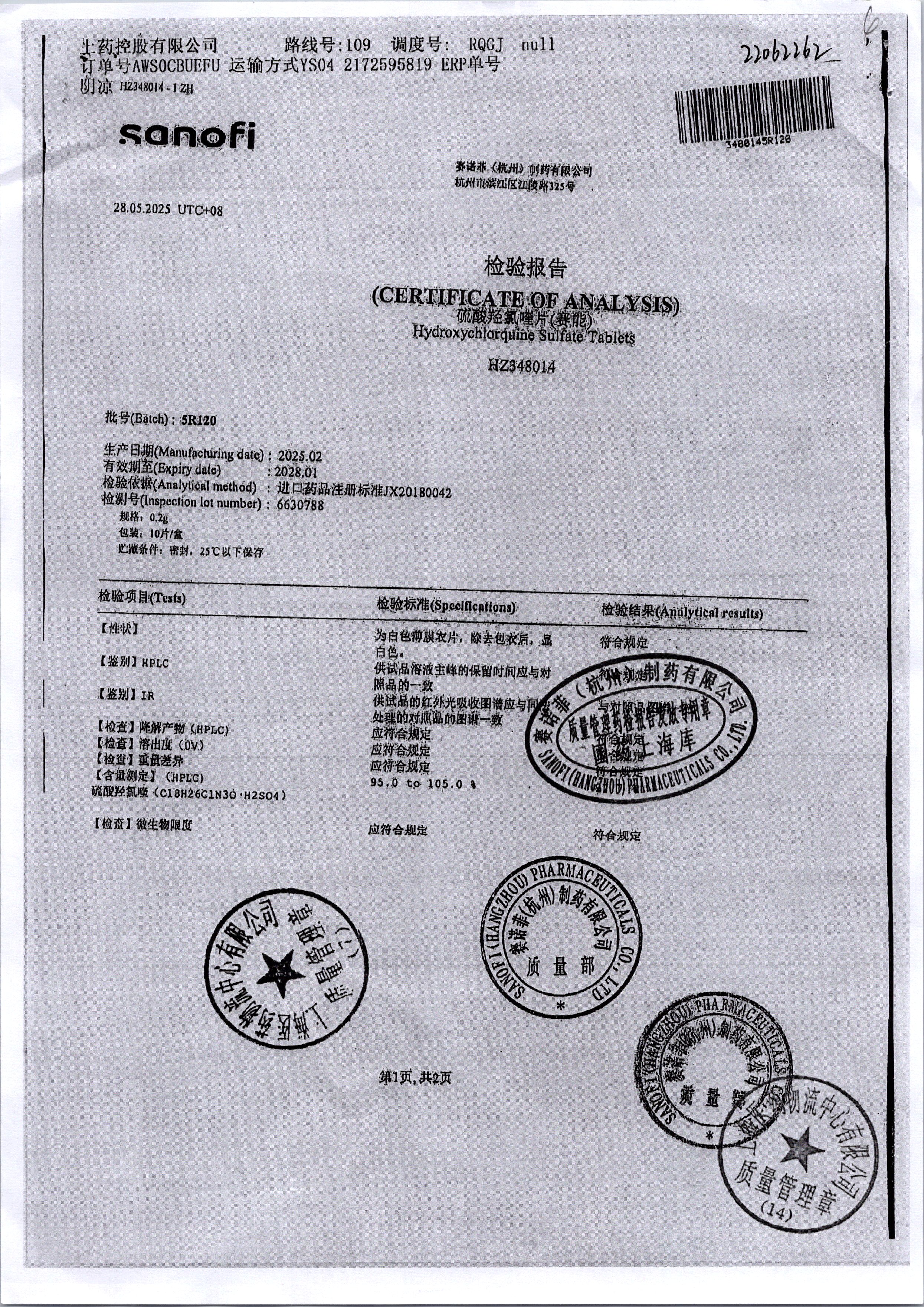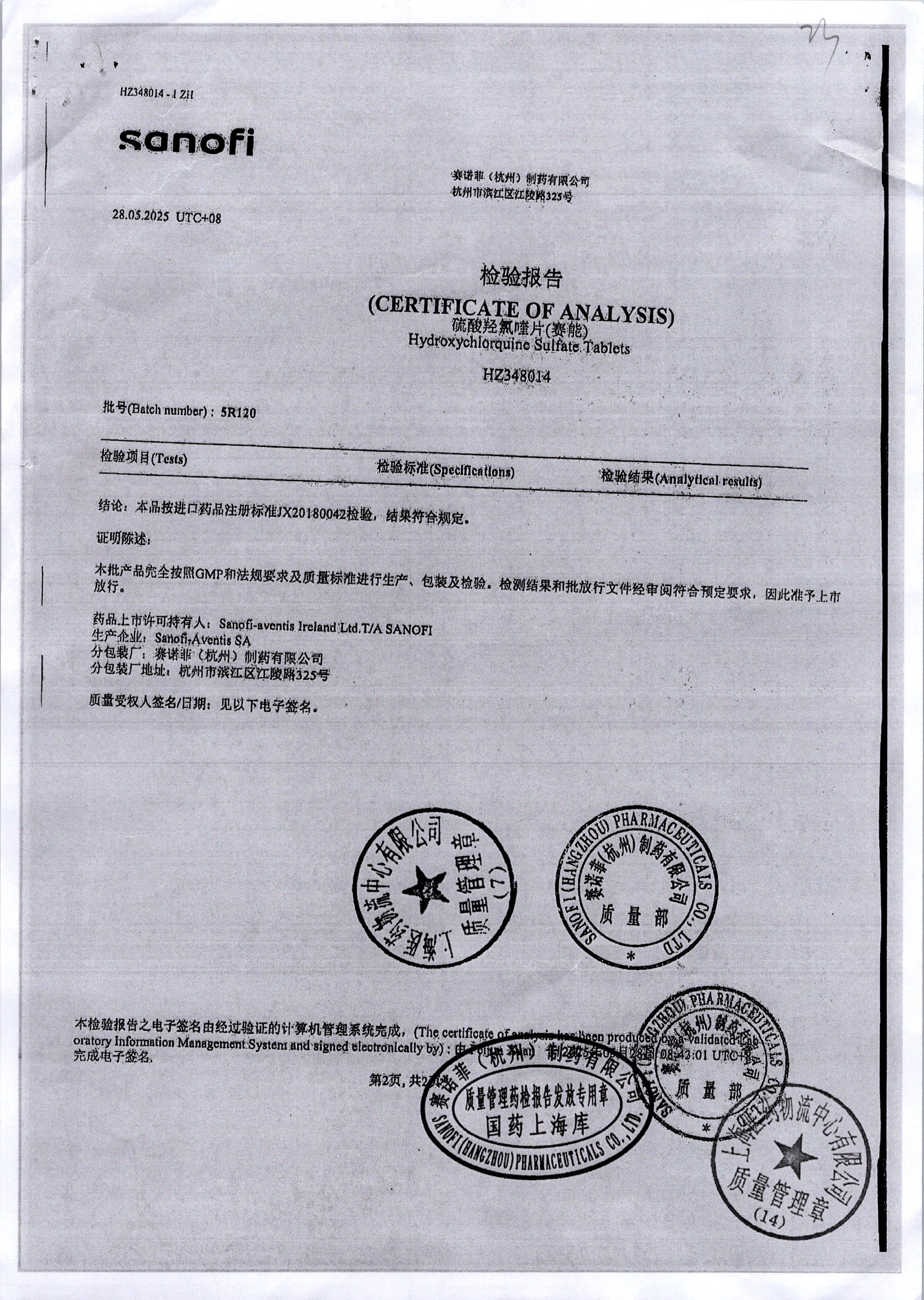 | 硫酸羟氯喹片 | 0.2*10s | 5R714/1 | 查看详情 |