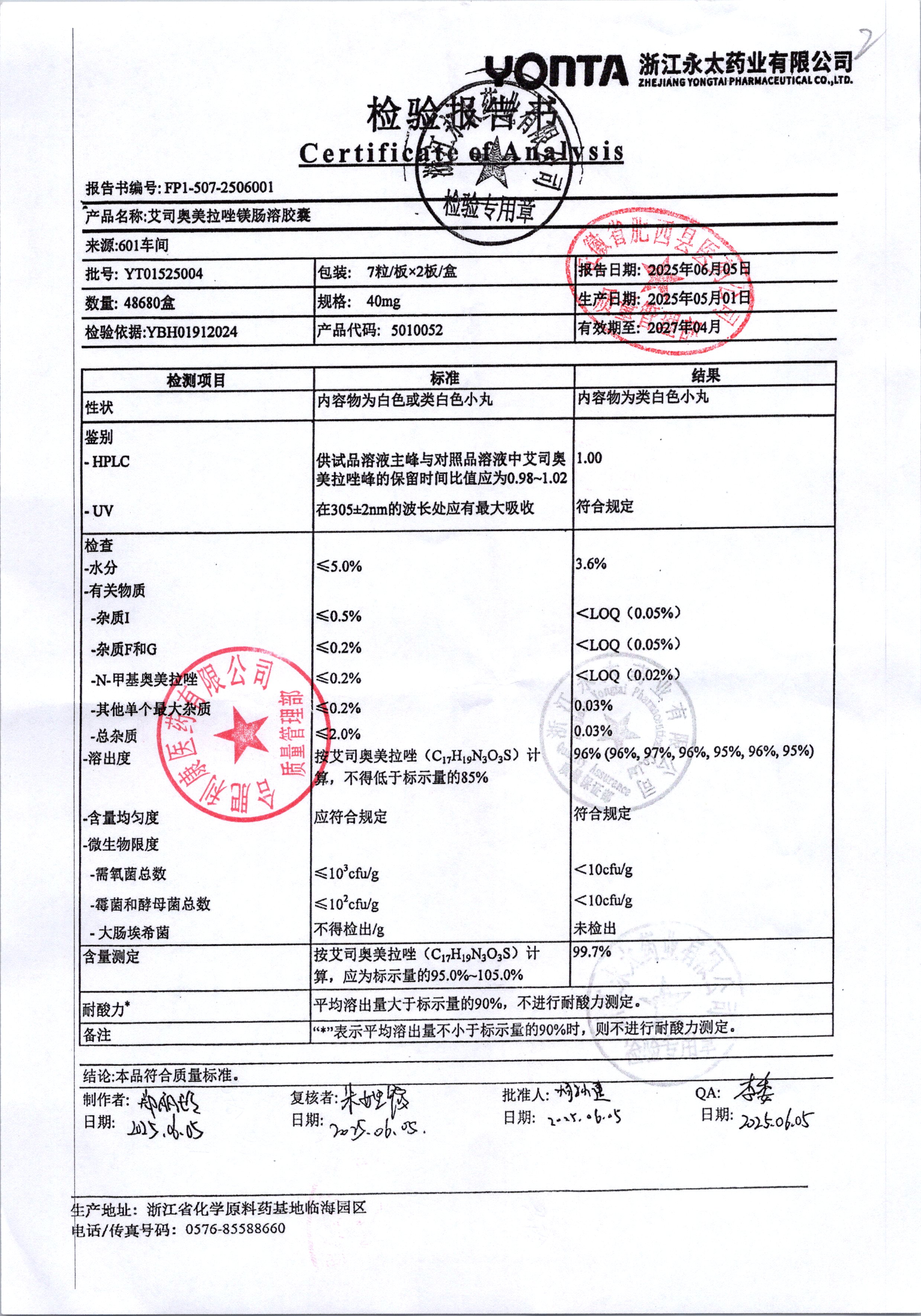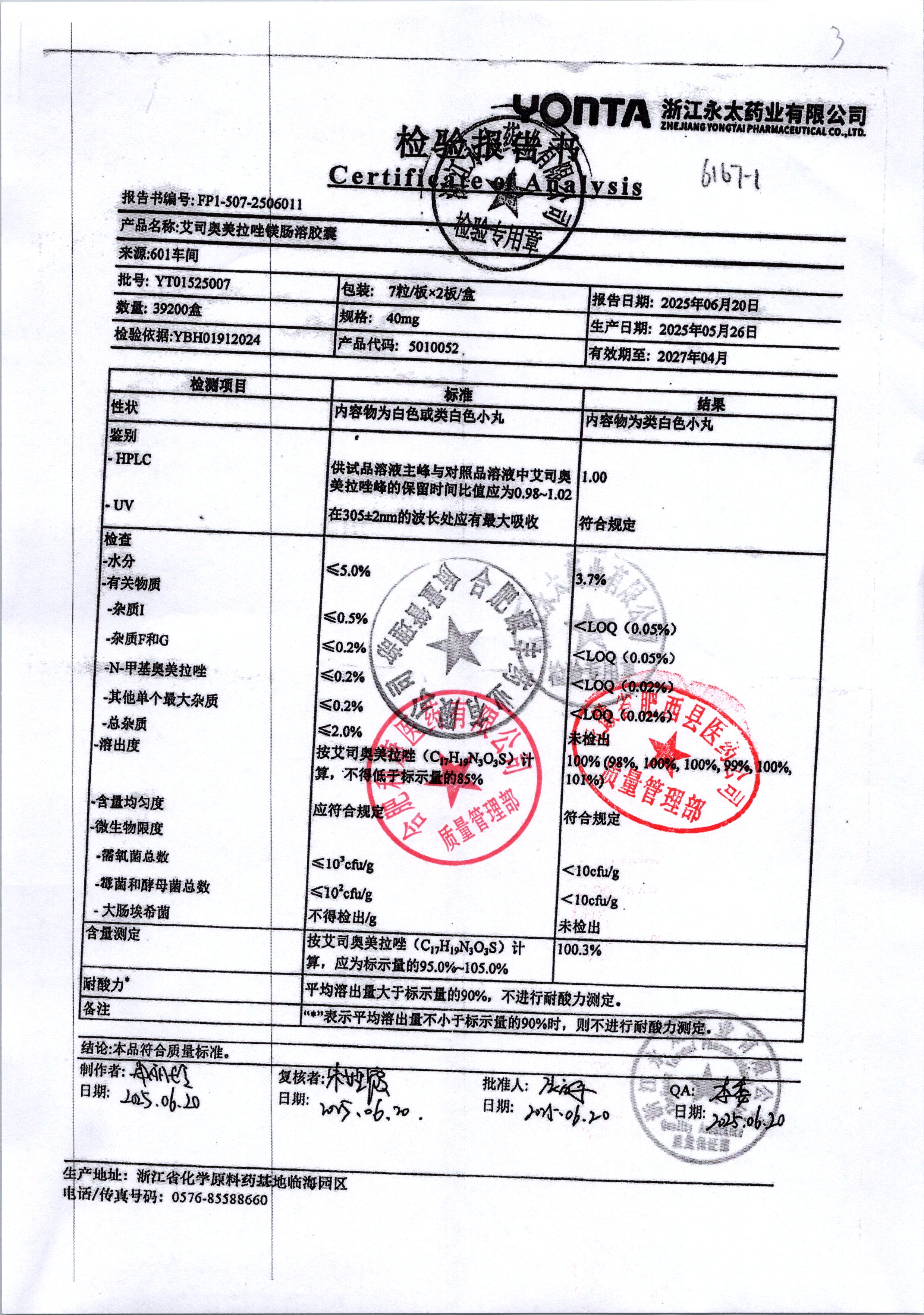 | 艾司奥美拉唑镁肠溶胶囊 | 40mg | YT01525007/5 | 查看详情 |