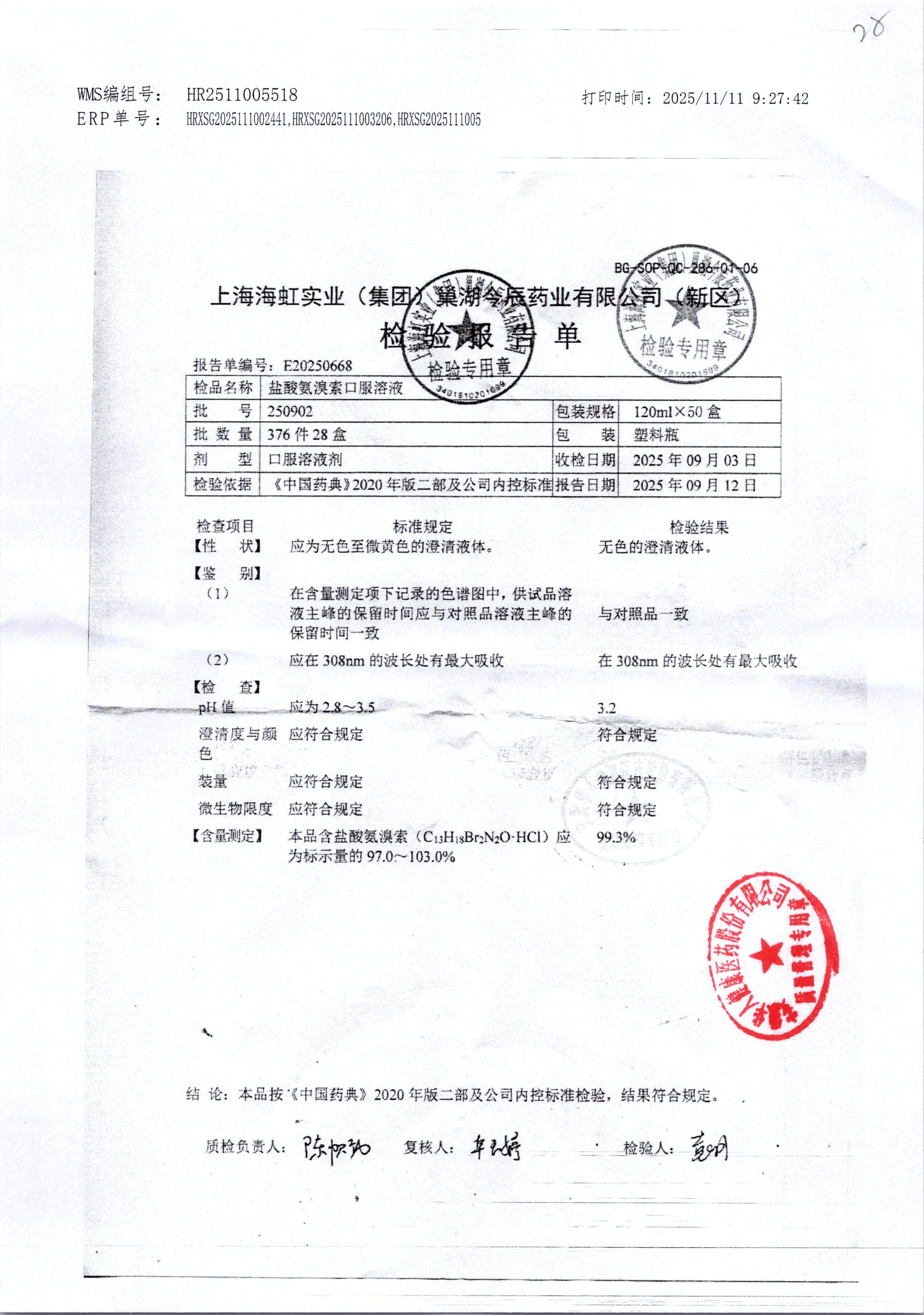 | 盐酸氨溴索口服溶液 | 120ml | 250902 | 查看详情 |