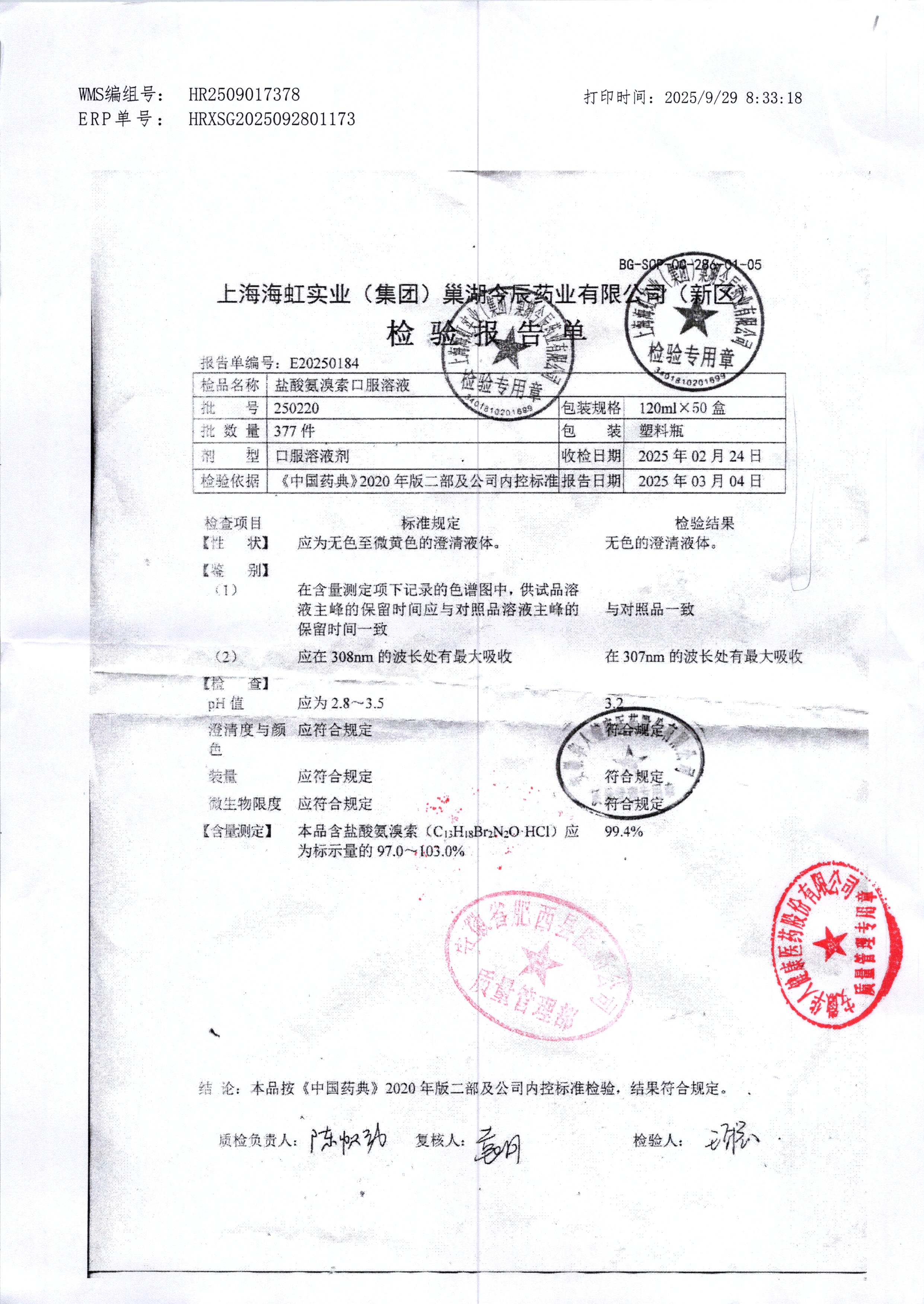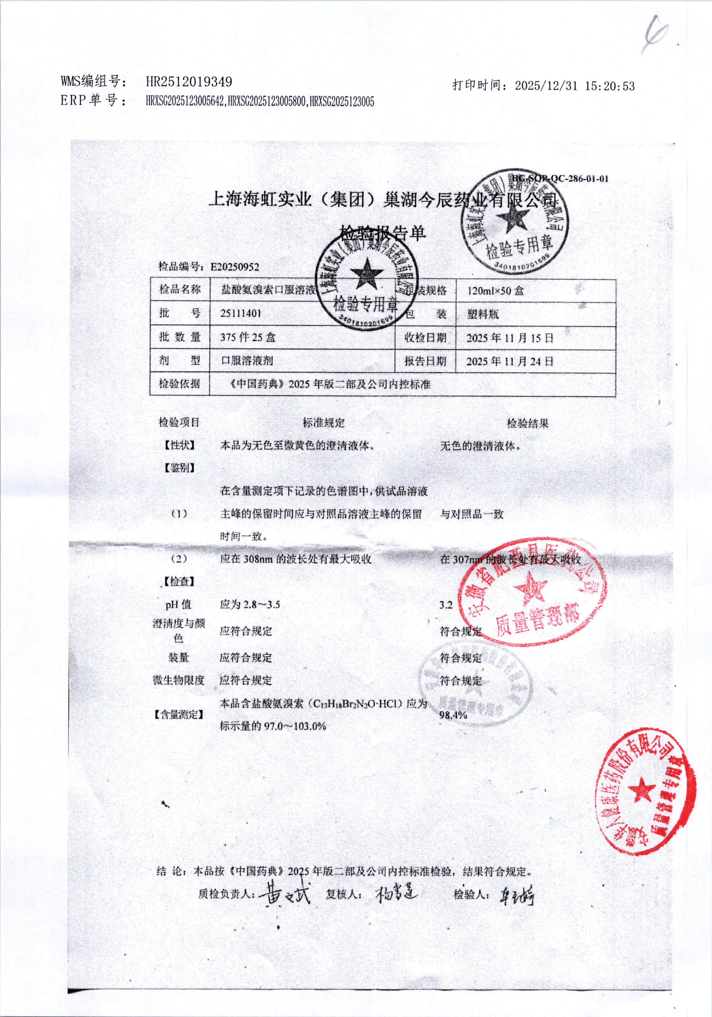 | 盐酸氨溴索口服溶液 | 120ml | 200415 | 查看详情 |
