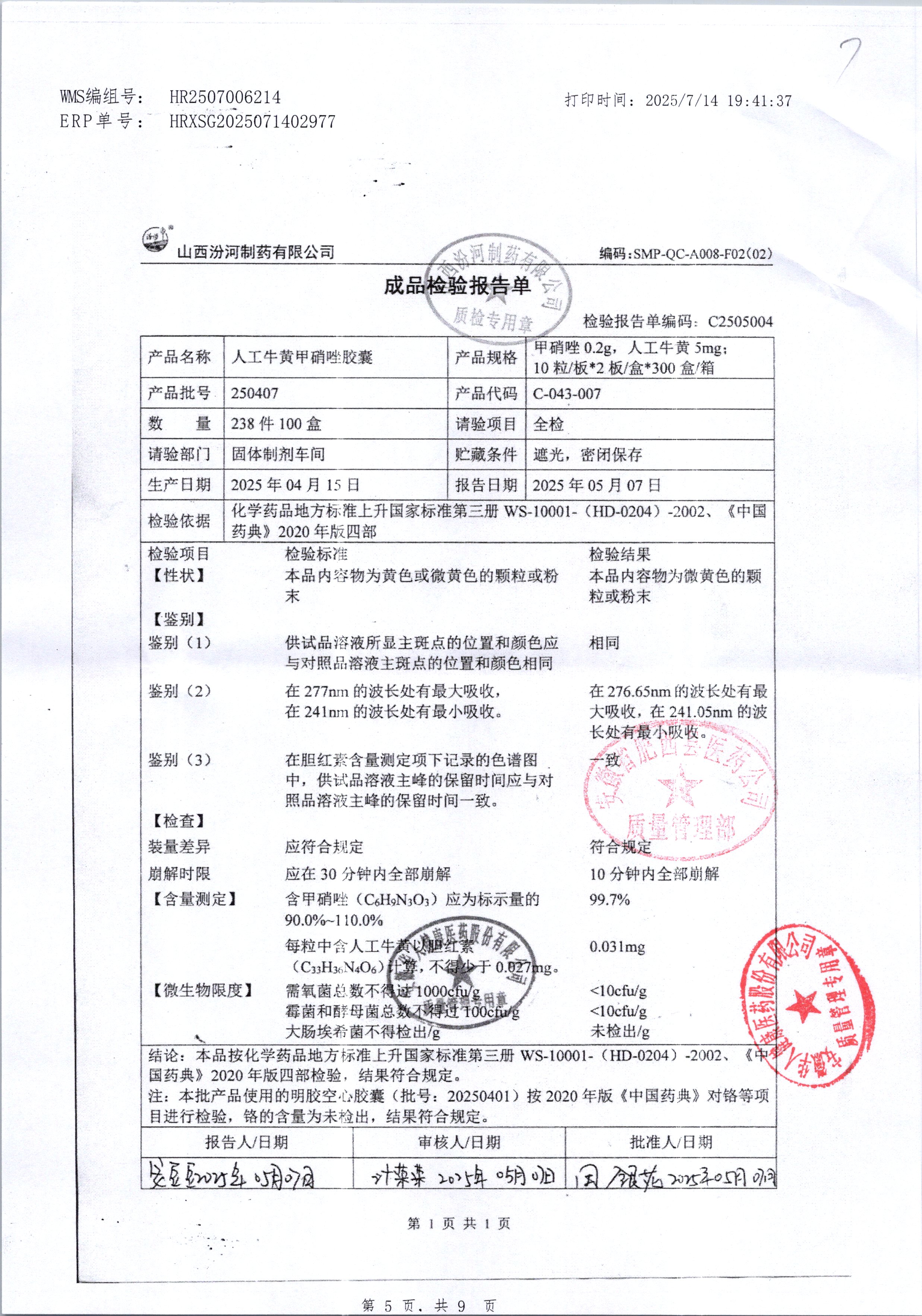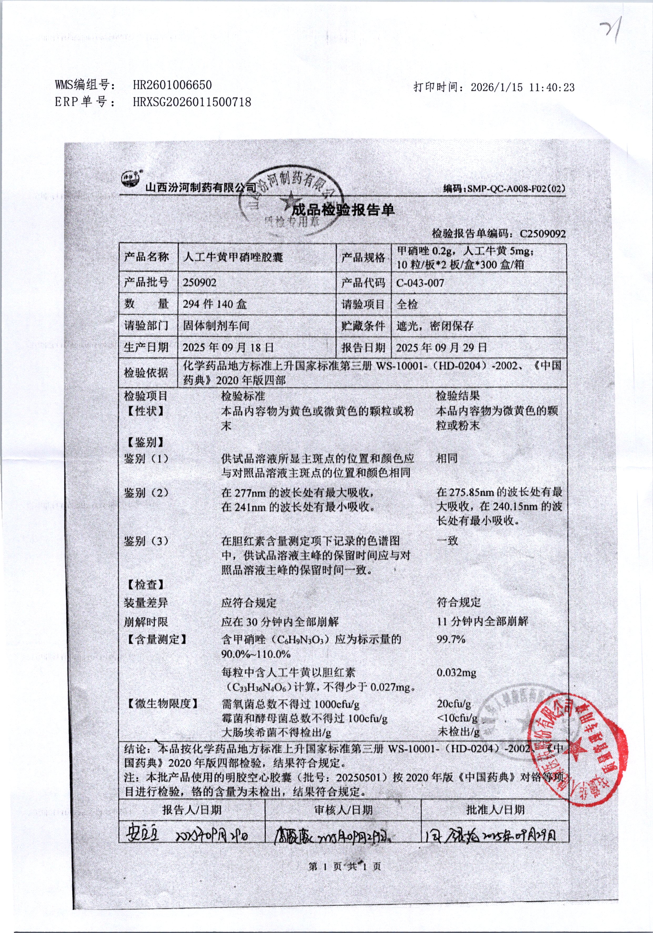 | 人工牛黄甲硝唑胶囊 | 复方*20粒 | 220302/1 | 查看详情 |