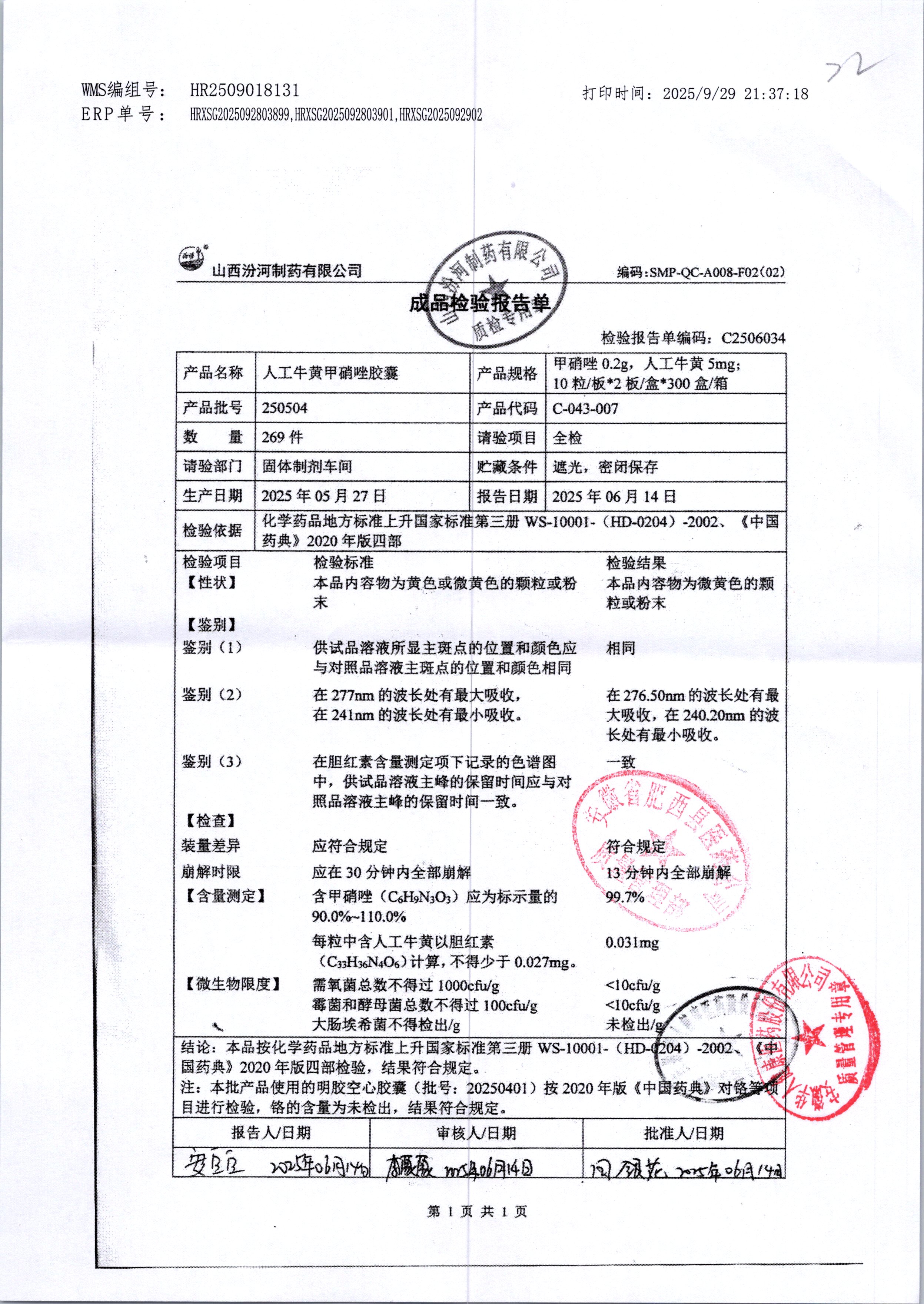 | 人工牛黄甲硝唑胶囊 | 复方*20粒 | 250902 | 查看详情 |