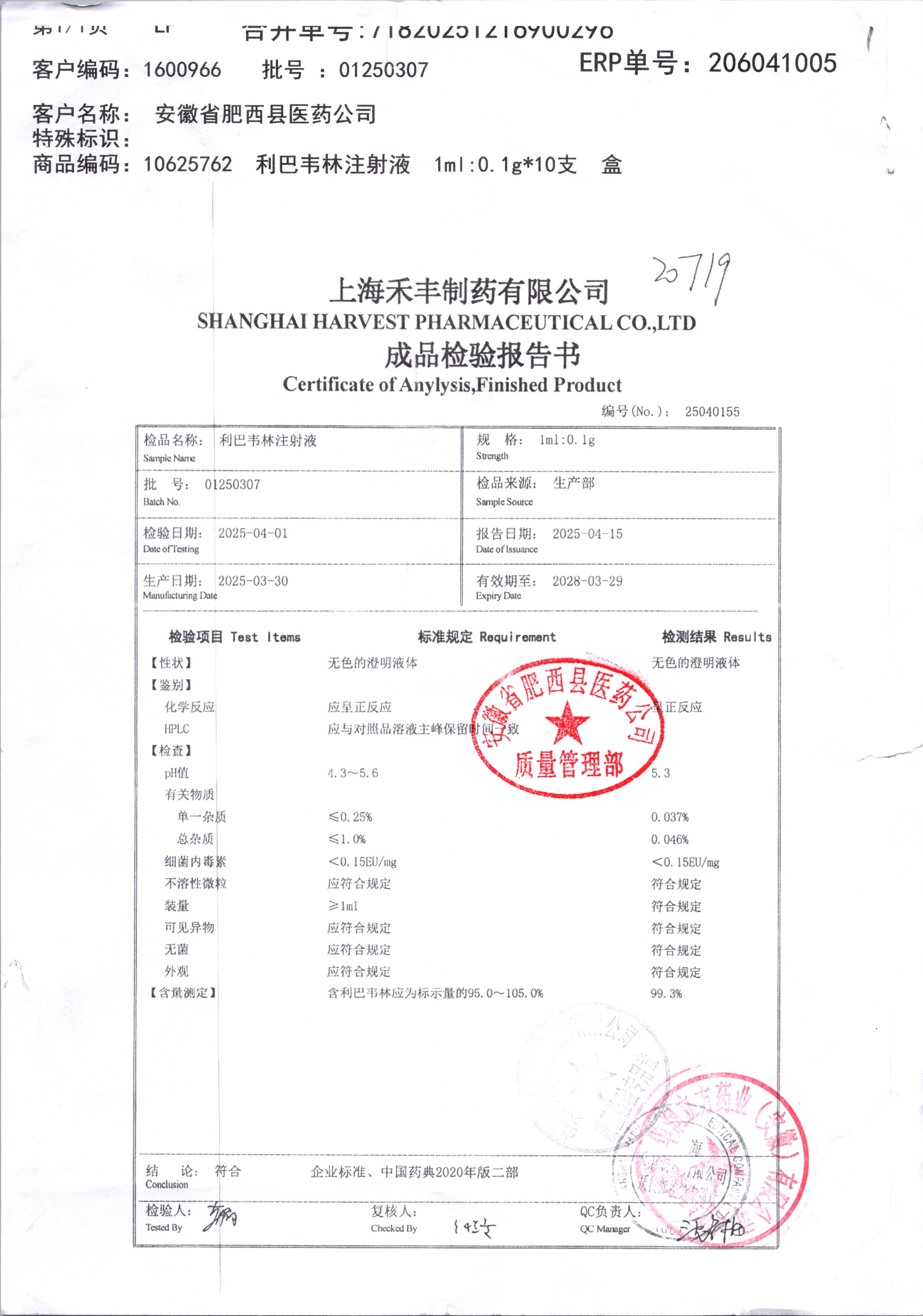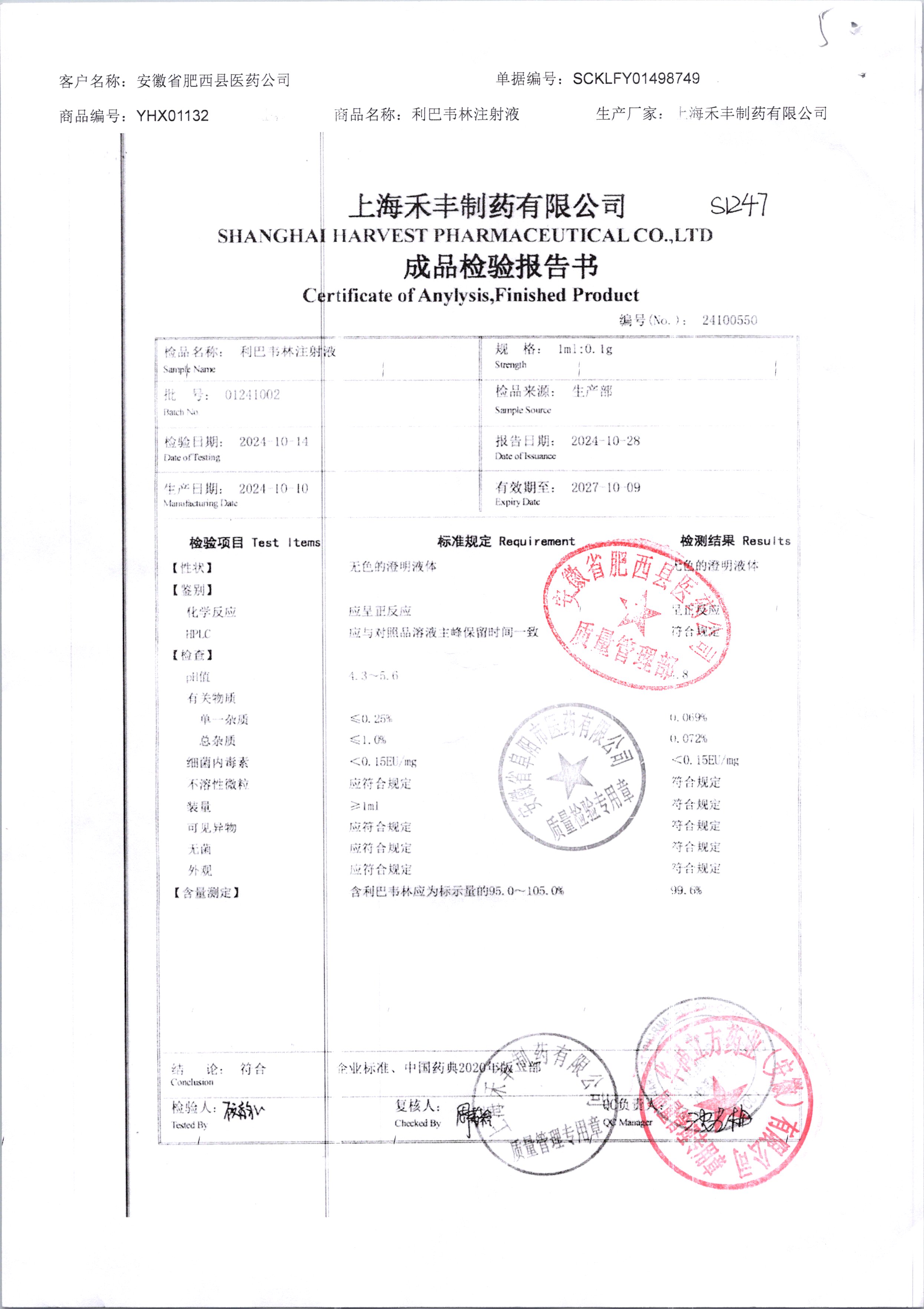 | 利巴韦林注射液 | 1ml:0.1g | 01250307 | 查看详情 |