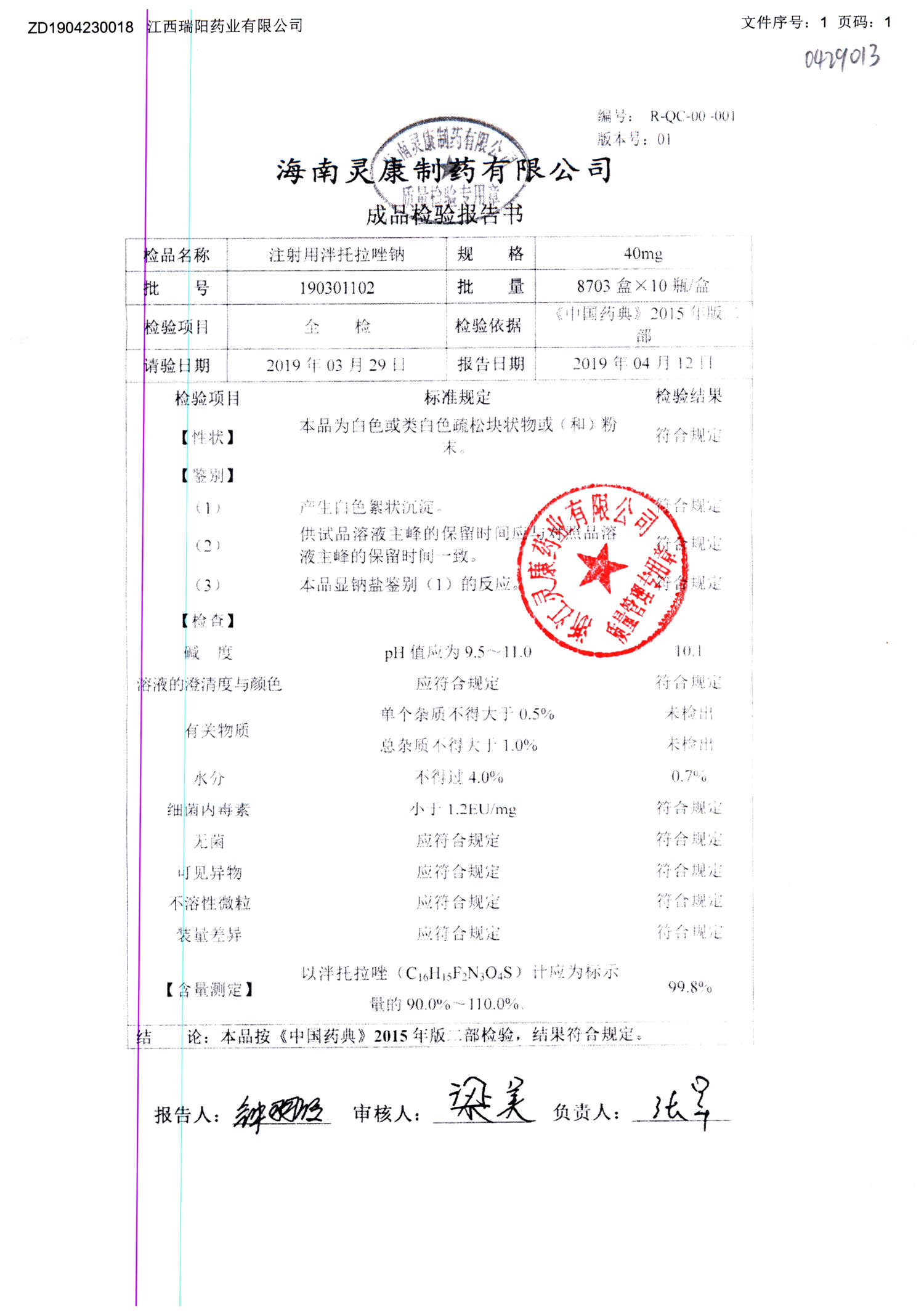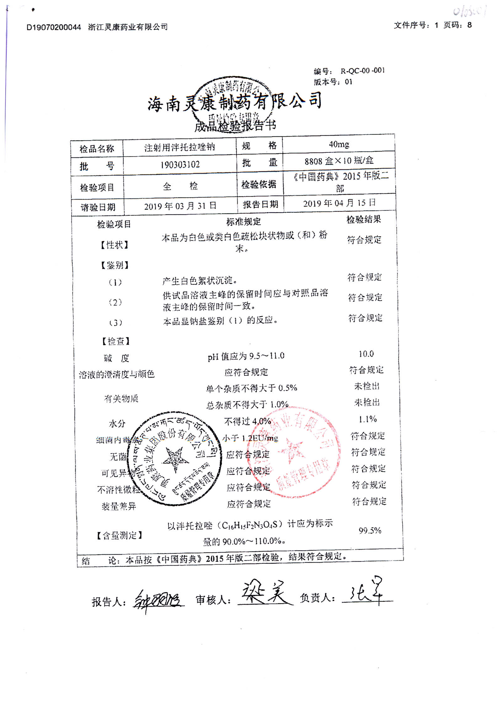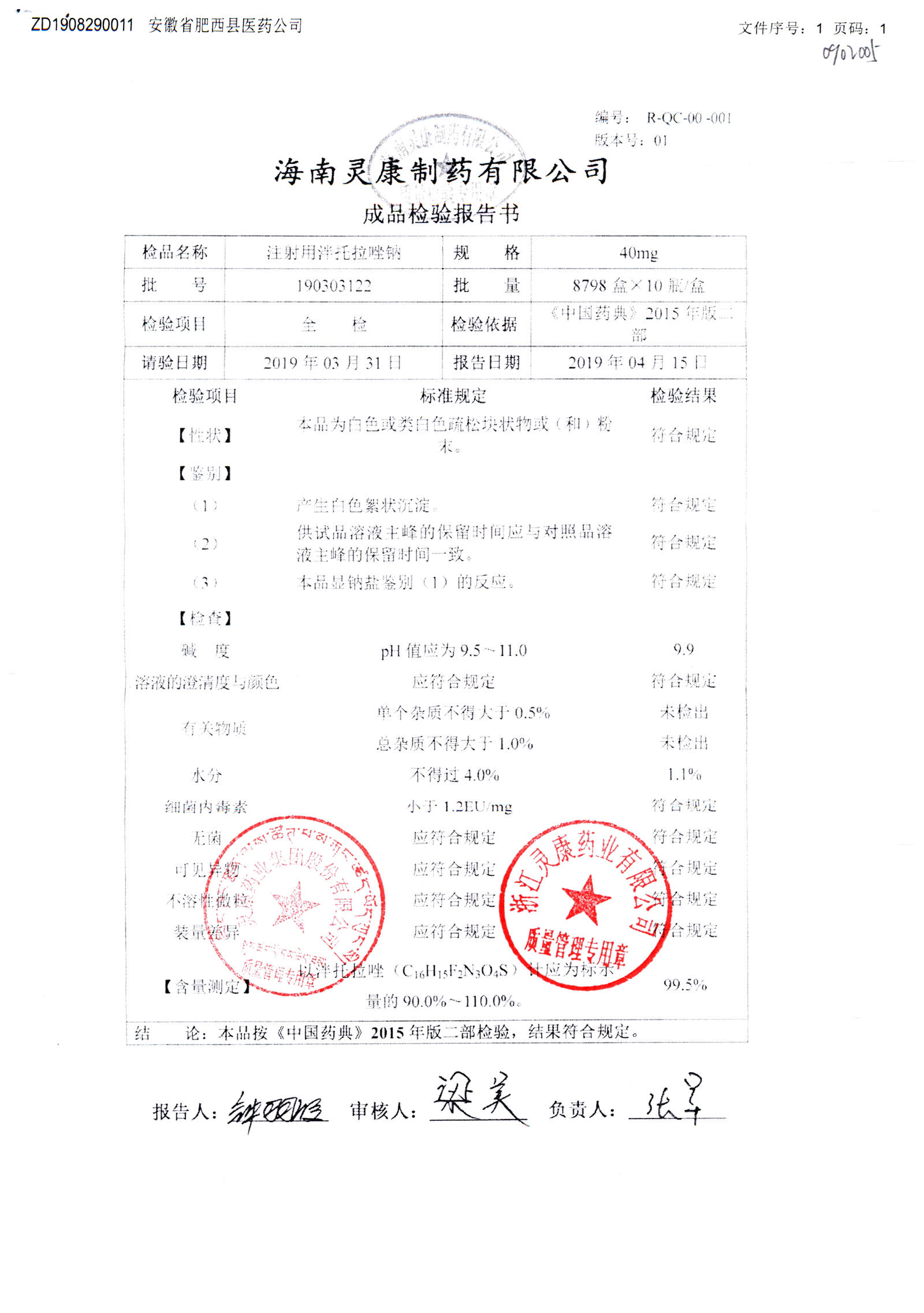 | 注射用泮托拉唑钠 | 40mg | 190303122 | 查看详情 |