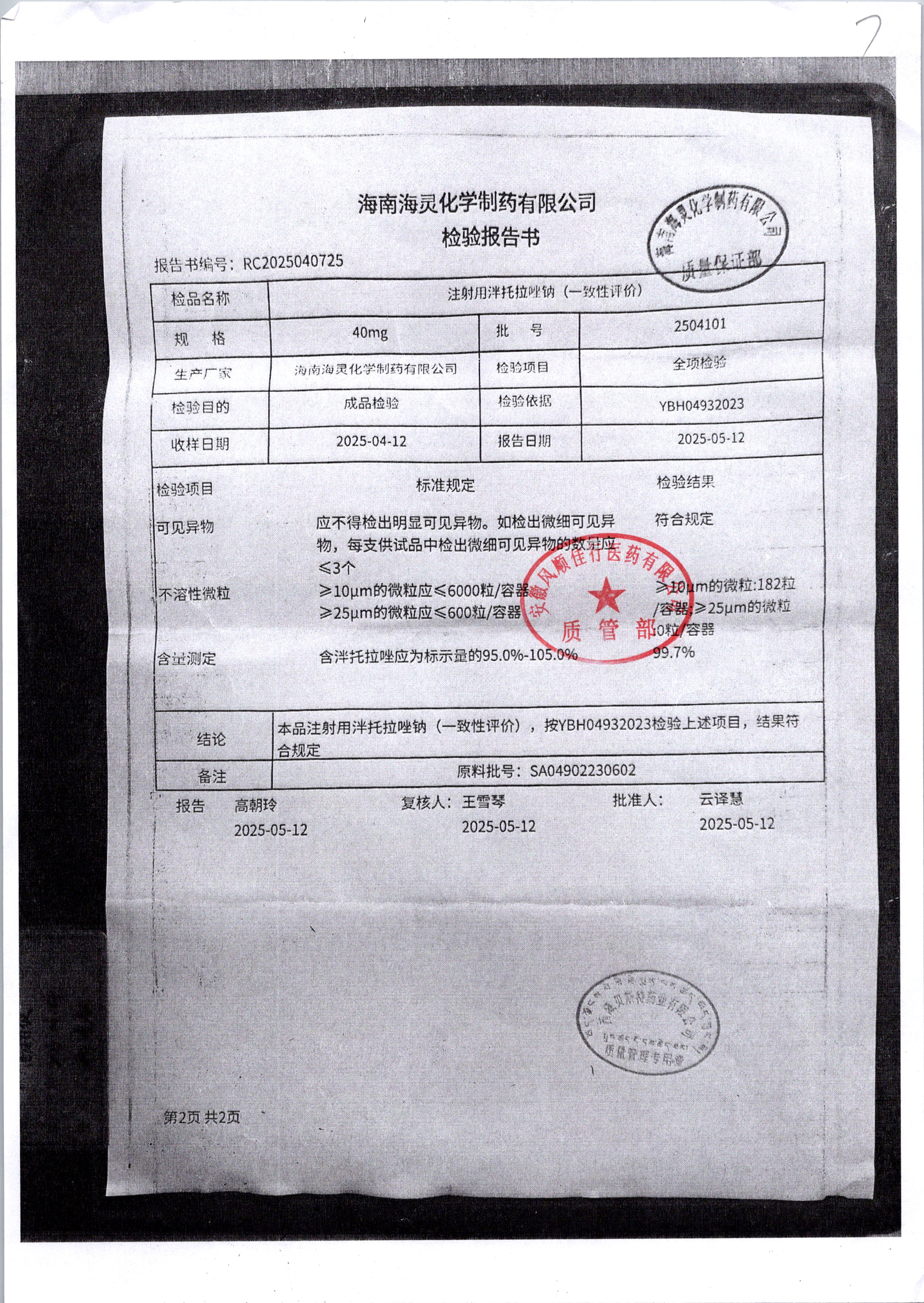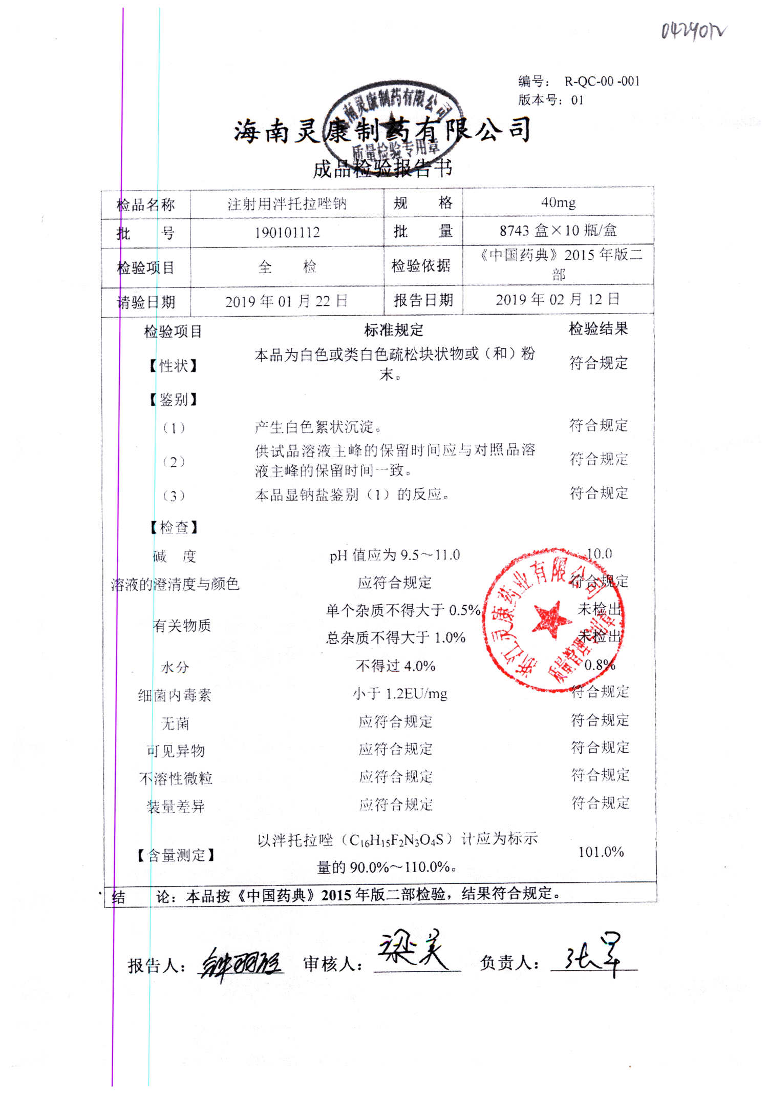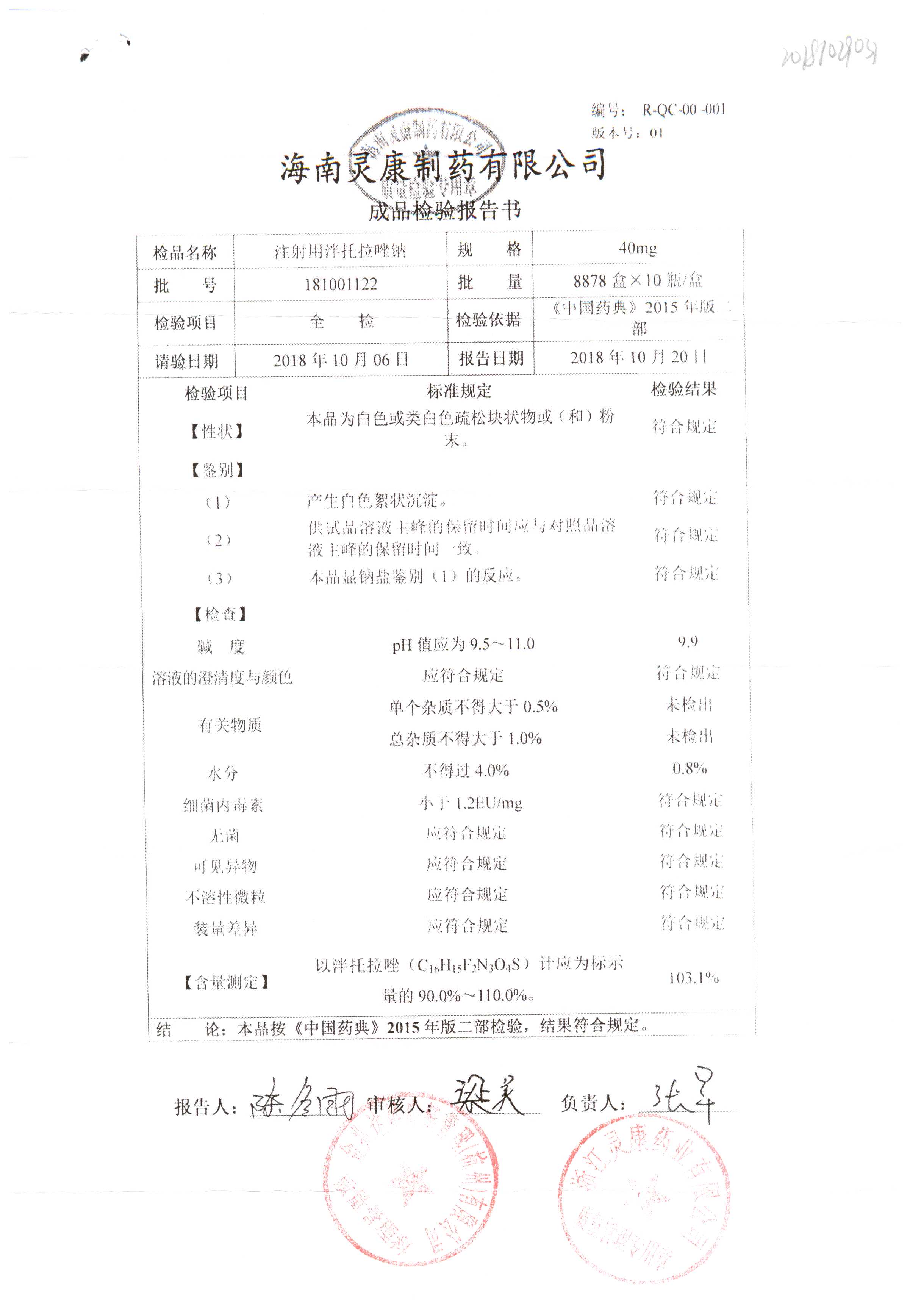 | 注射用泮托拉唑钠 | 40mg | 190303122 | 查看详情 |