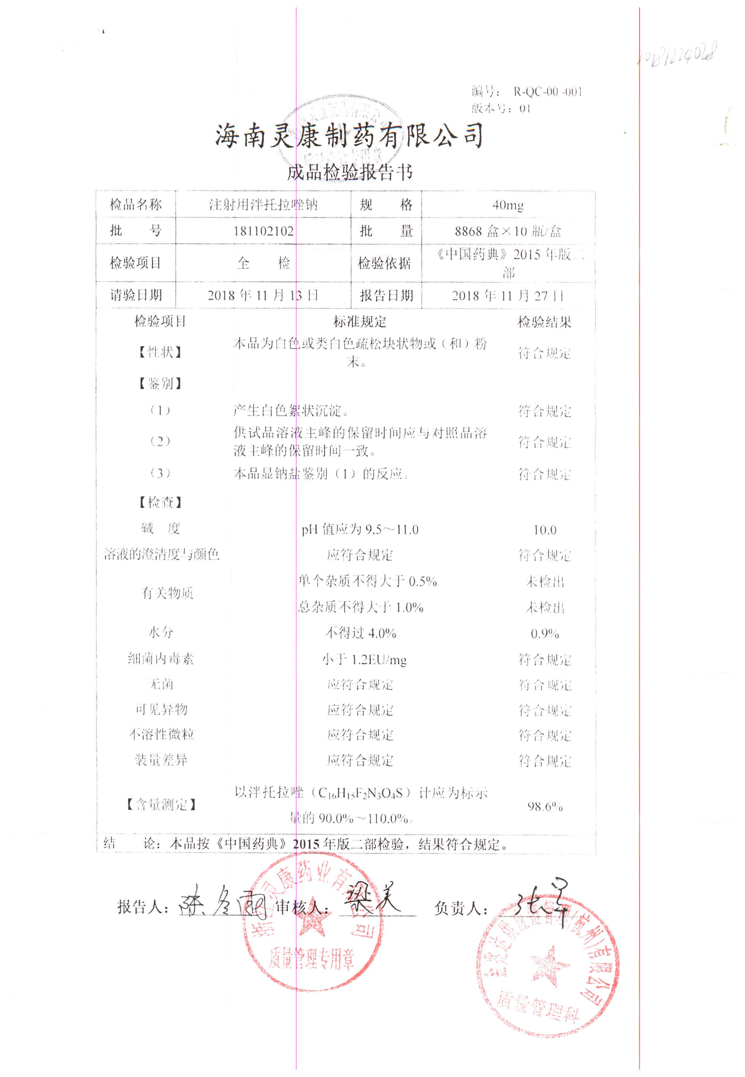 | 注射用泮托拉唑钠 | 40mg | 181102102 | 查看详情 |