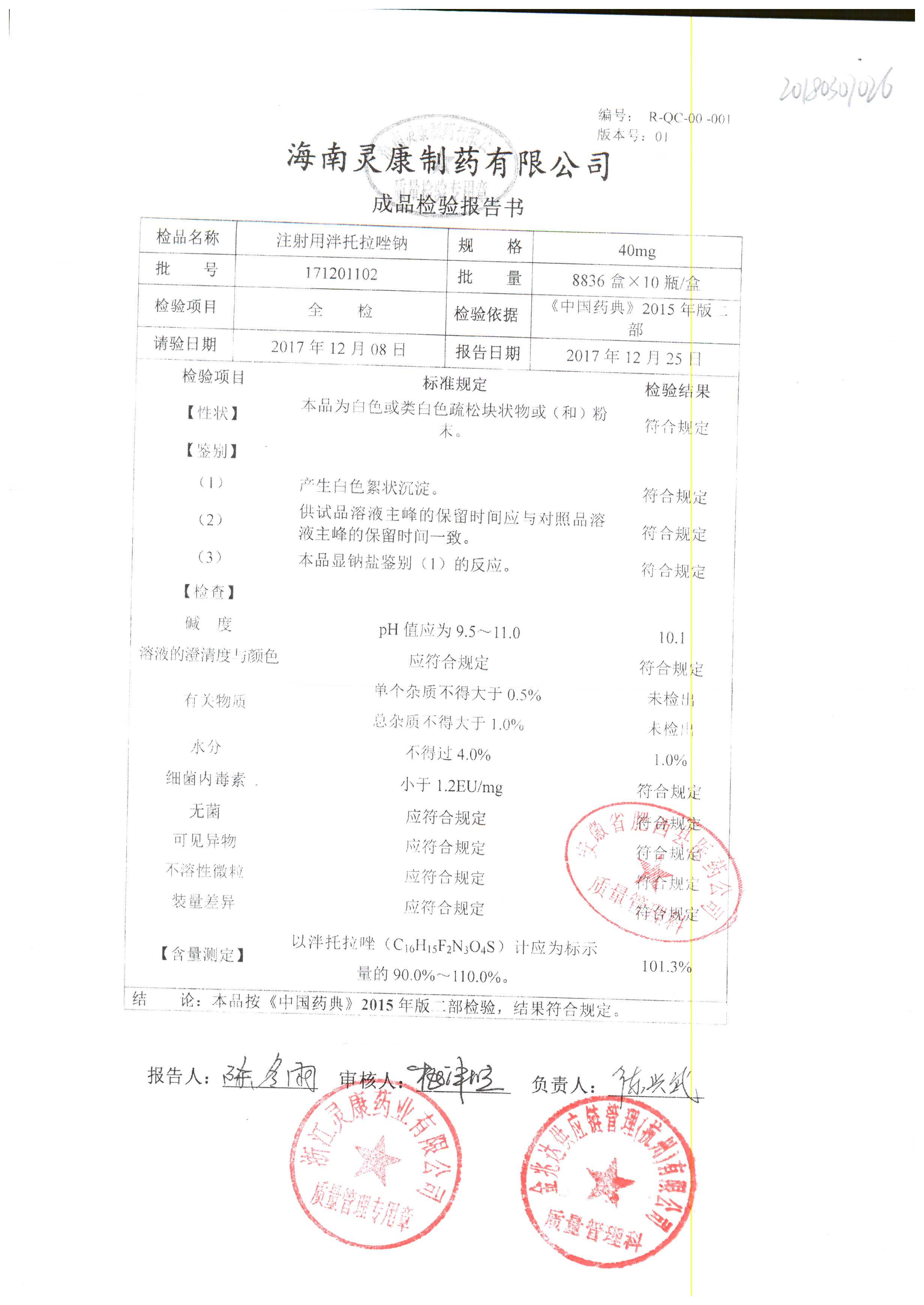| 注射用泮托拉唑钠 | 40mg | 171201102 | 查看详情 |