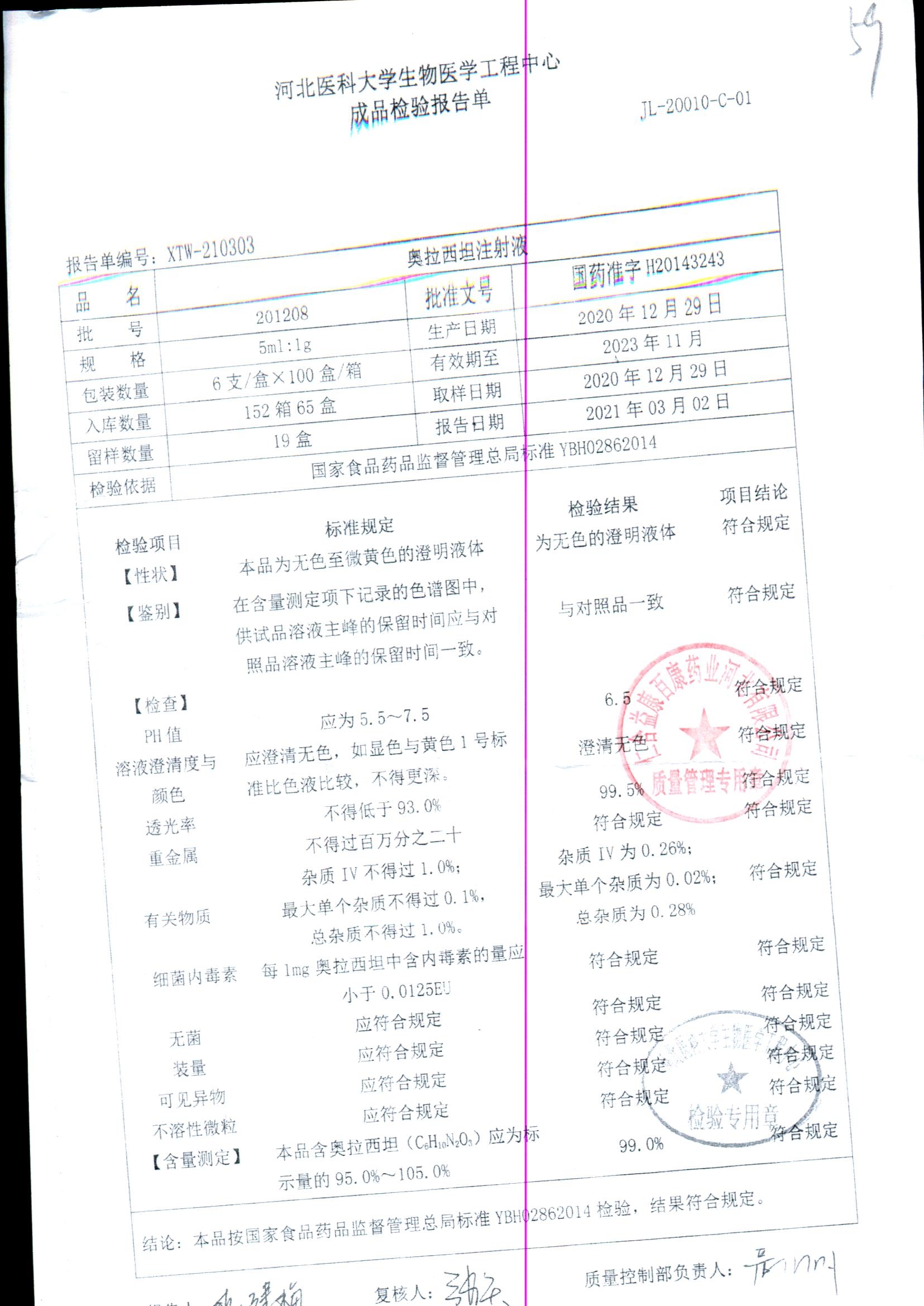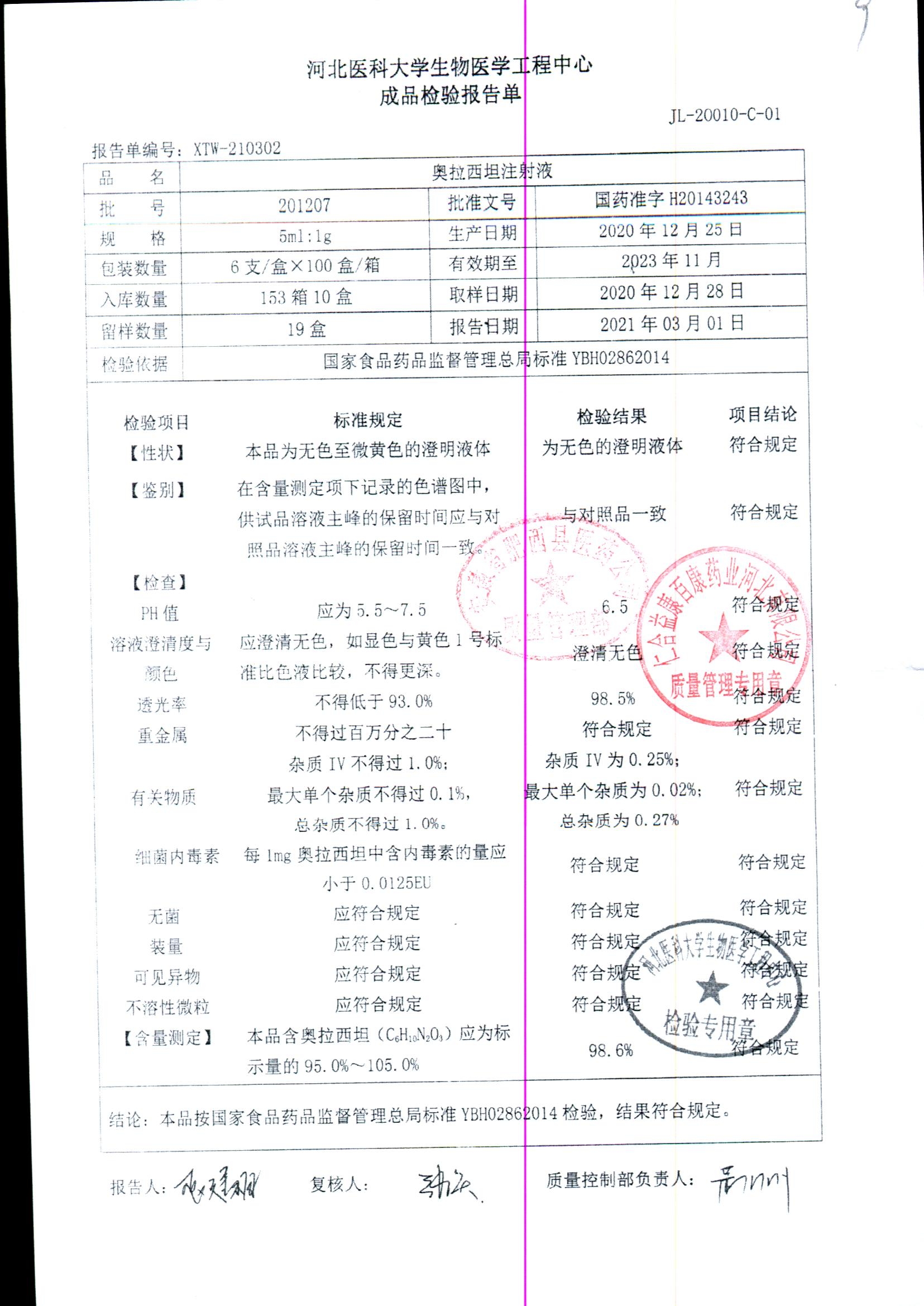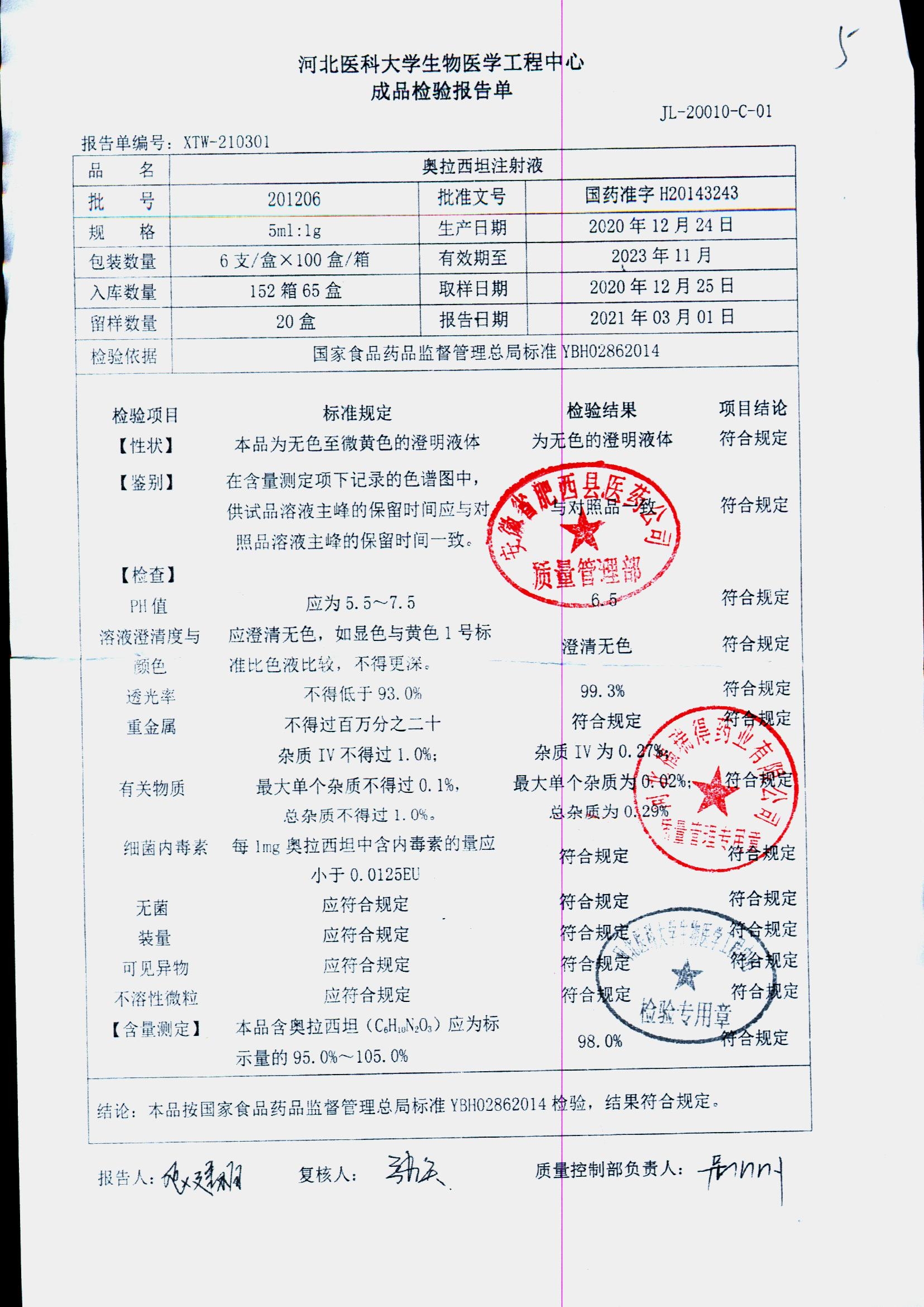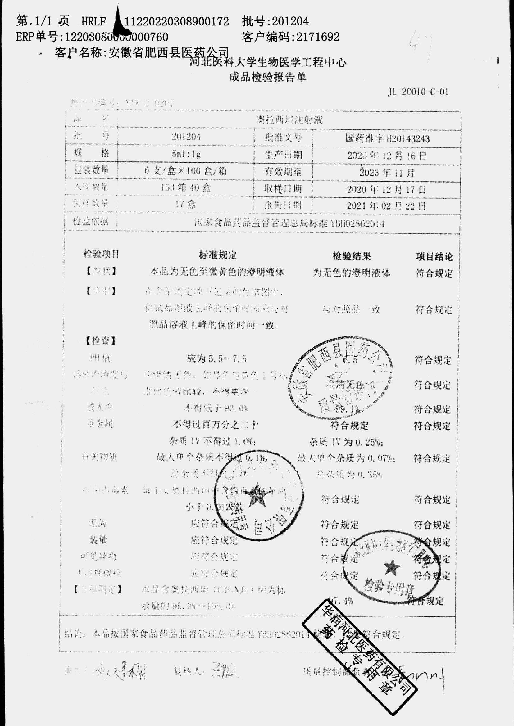 | 奥拉西坦注射液 | 5ml:1g*6支 | 201206 | 查看详情 |