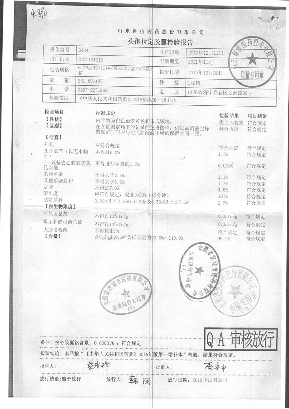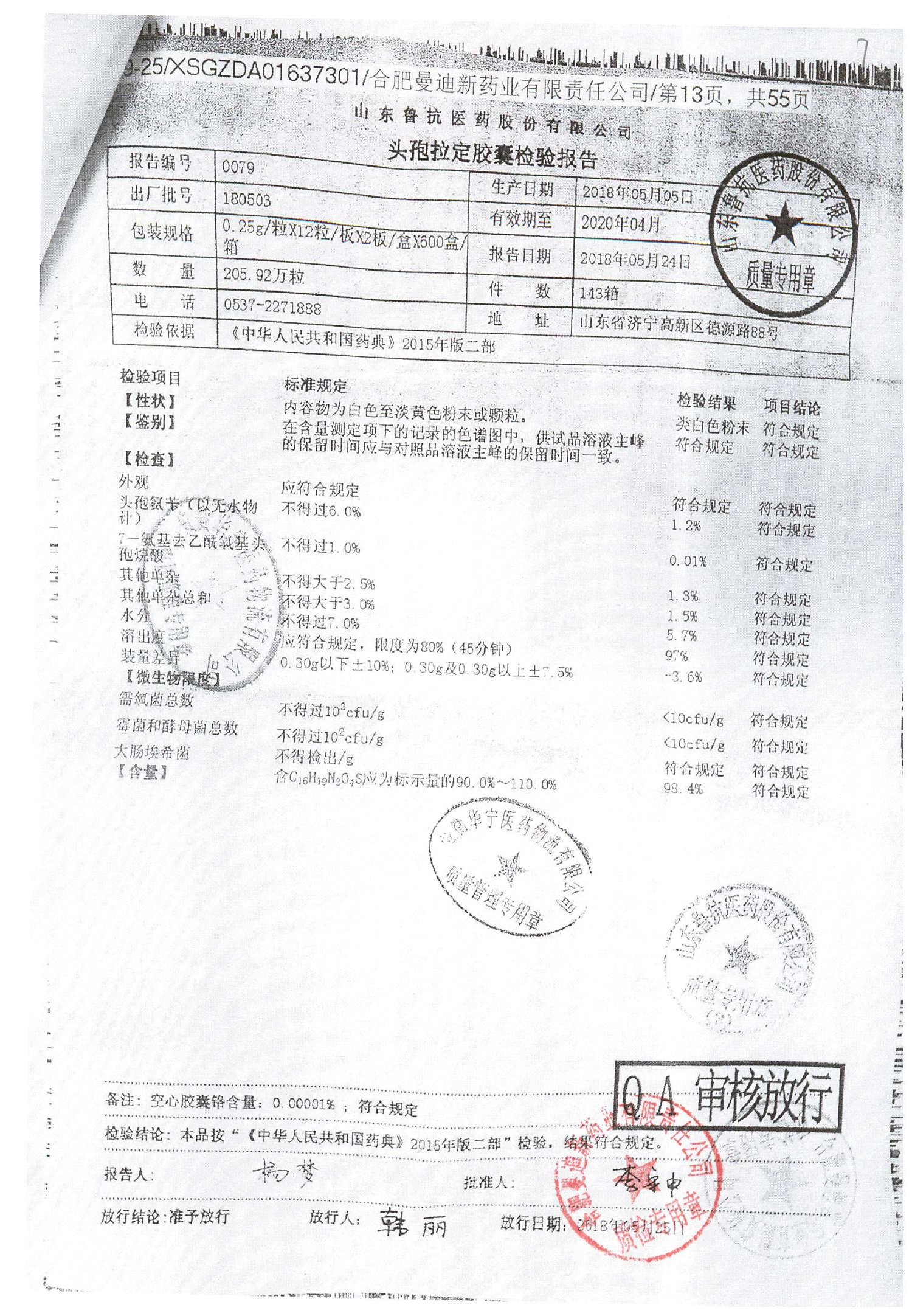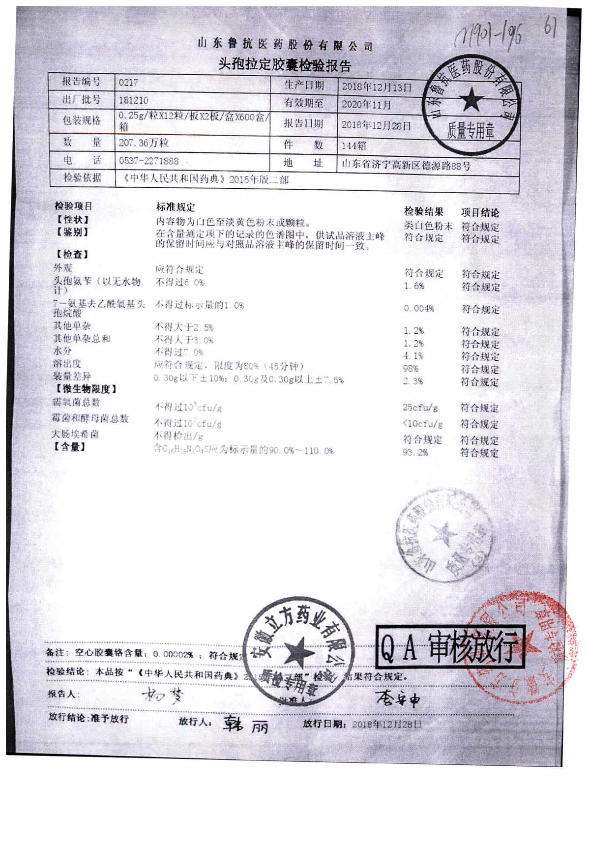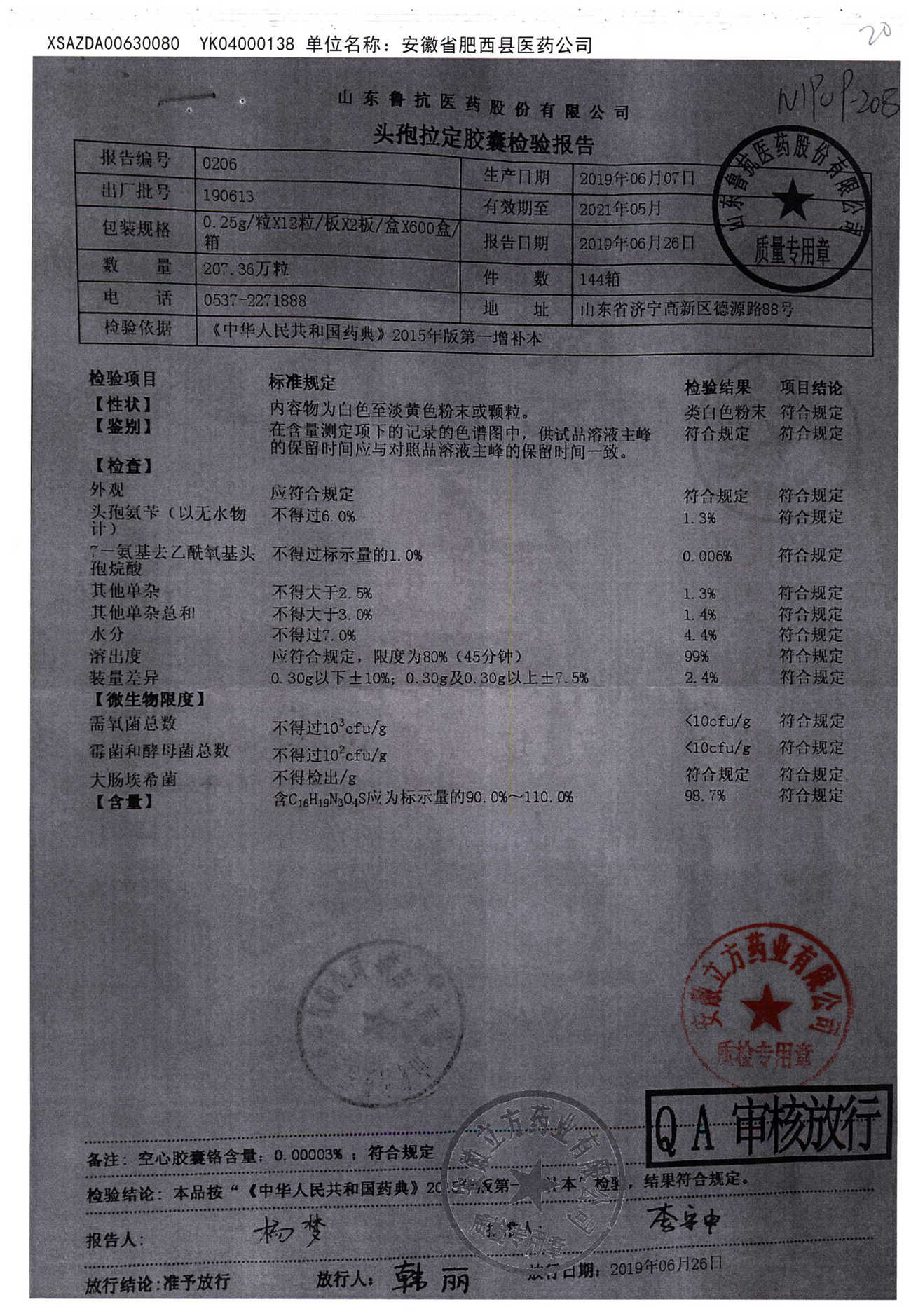 | 头孢拉定胶囊 | 0.25g*24粒 | 190613 | 查看详情 |