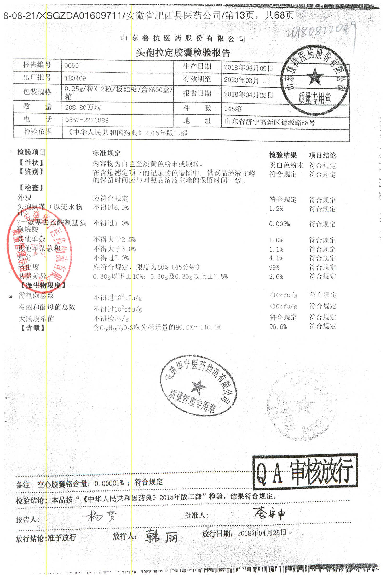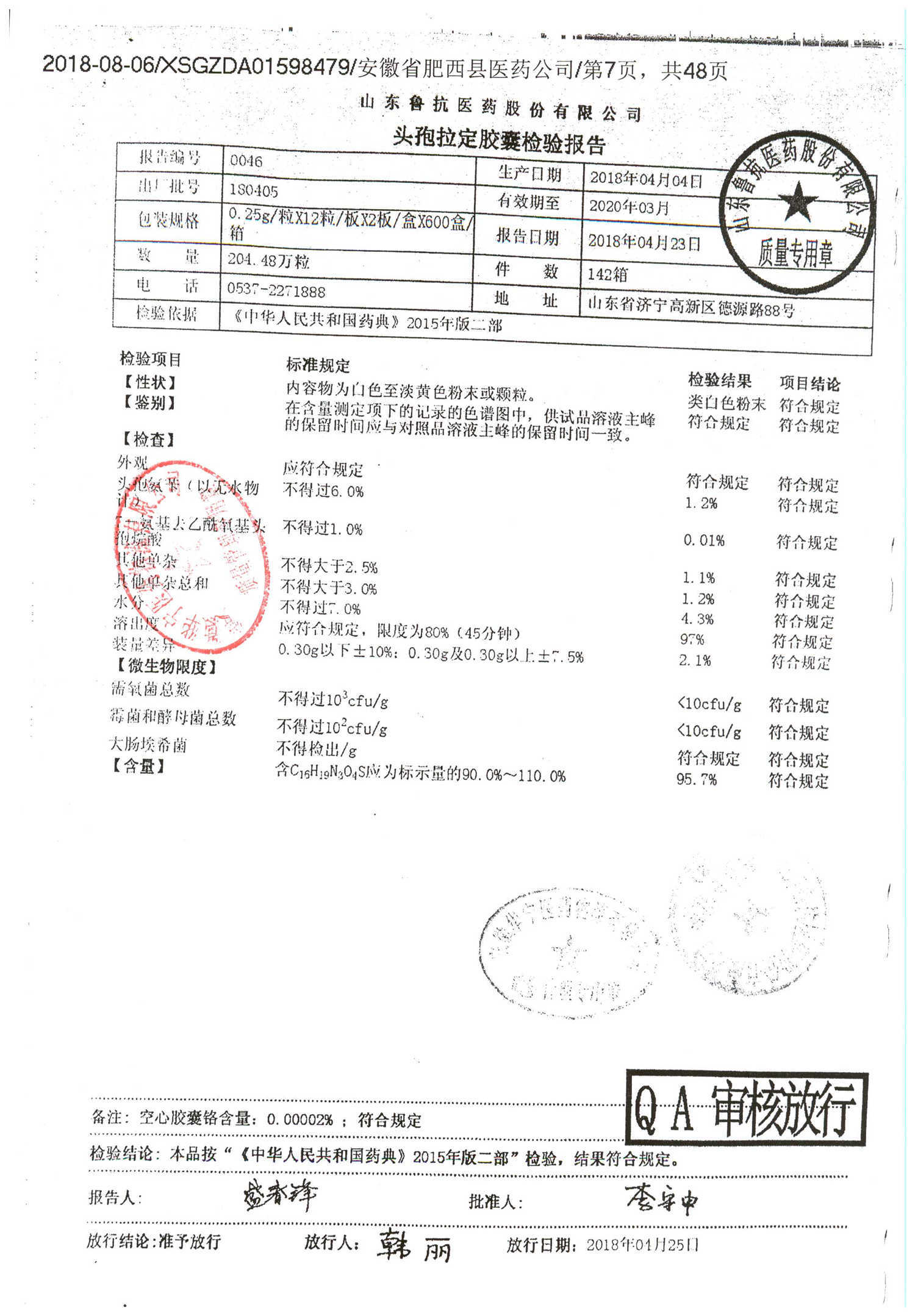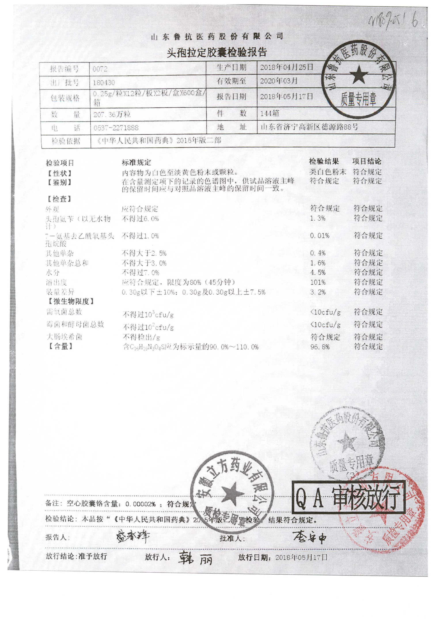 | 头孢拉定胶囊 | 0.25g*24粒 | 180408 | 查看详情 |