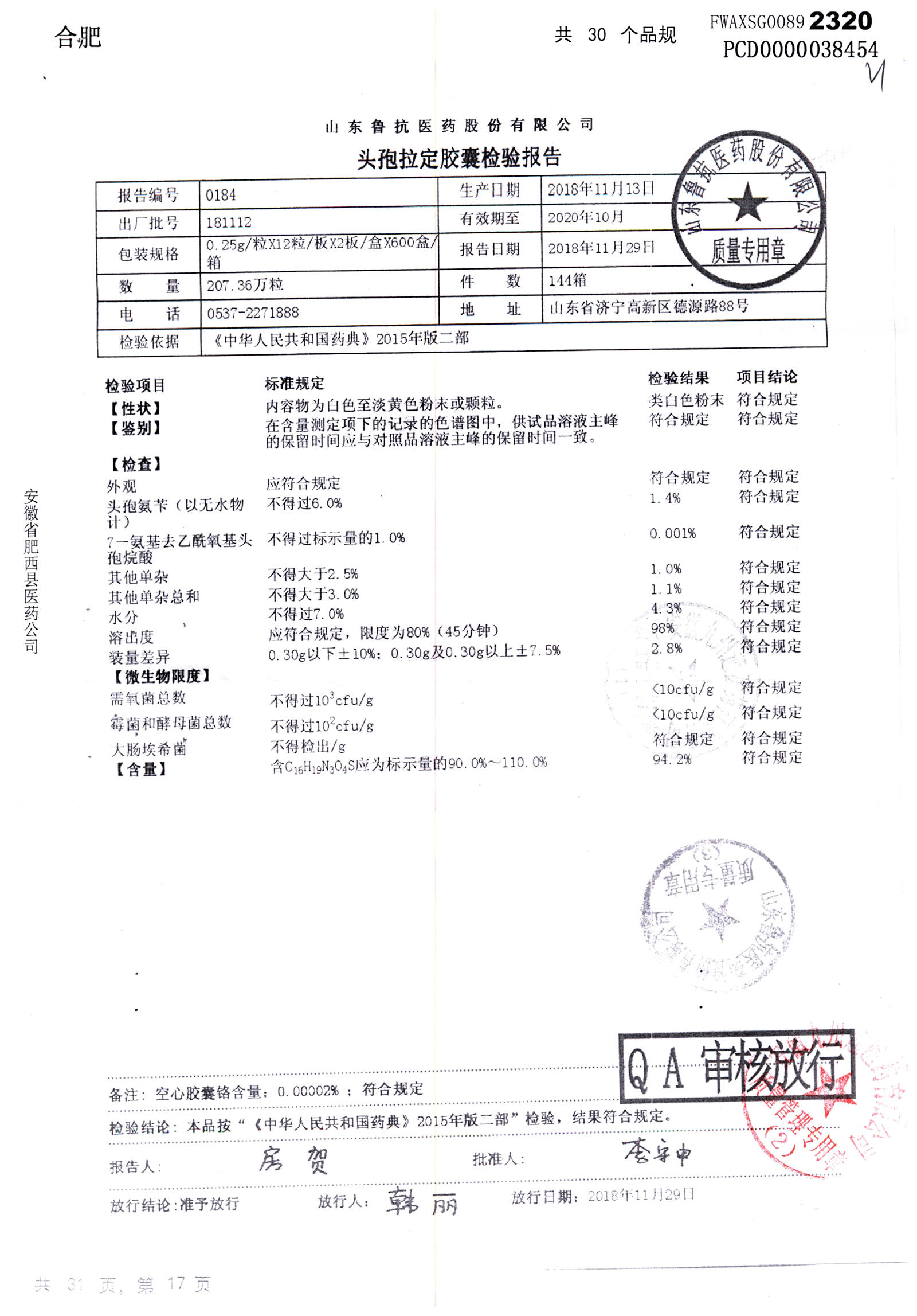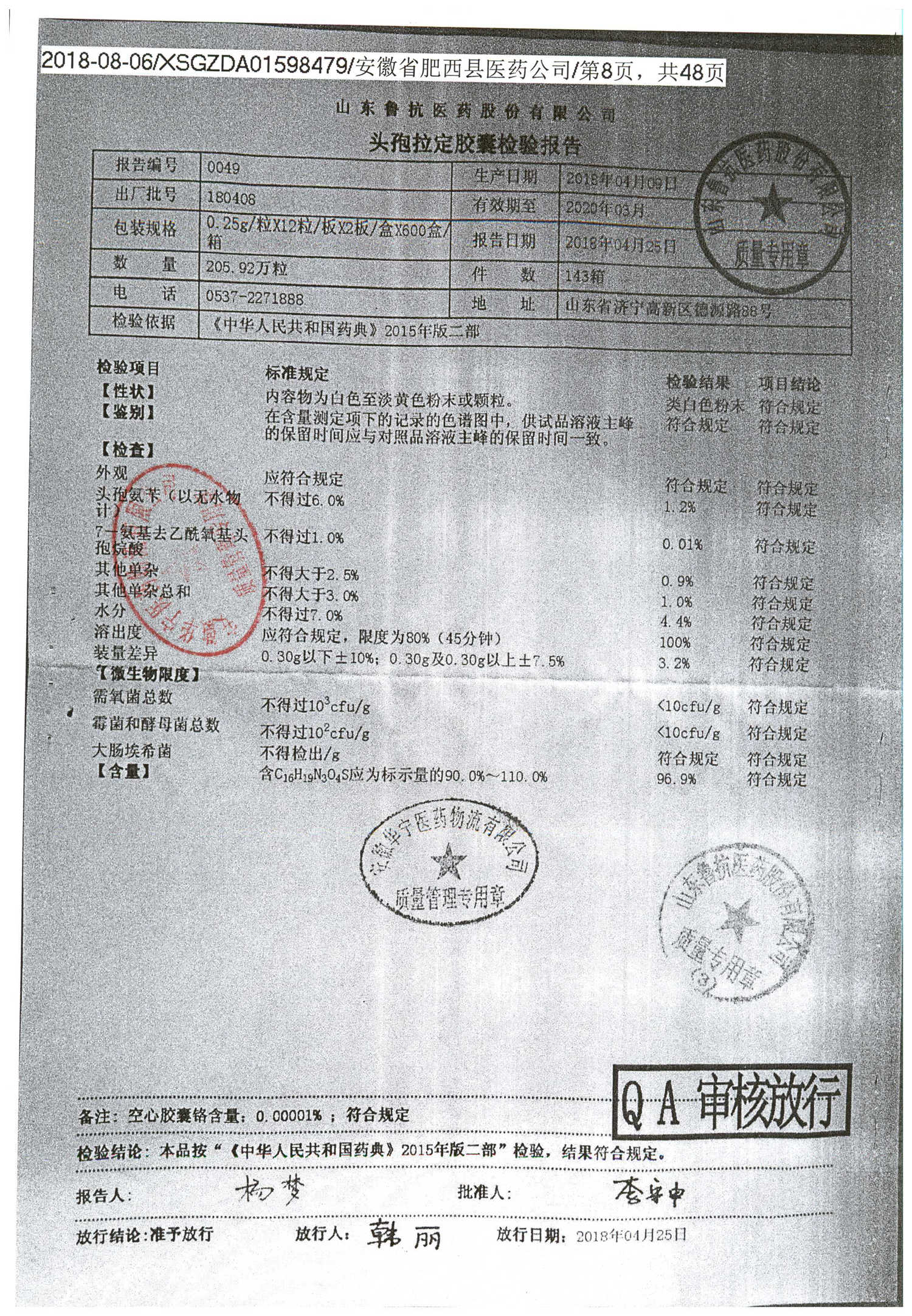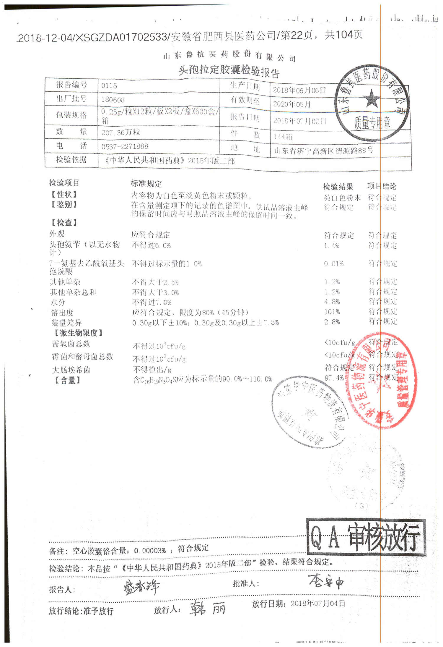| 头孢拉定胶囊 | 0.25g*24粒 | 180408 | 查看详情 |