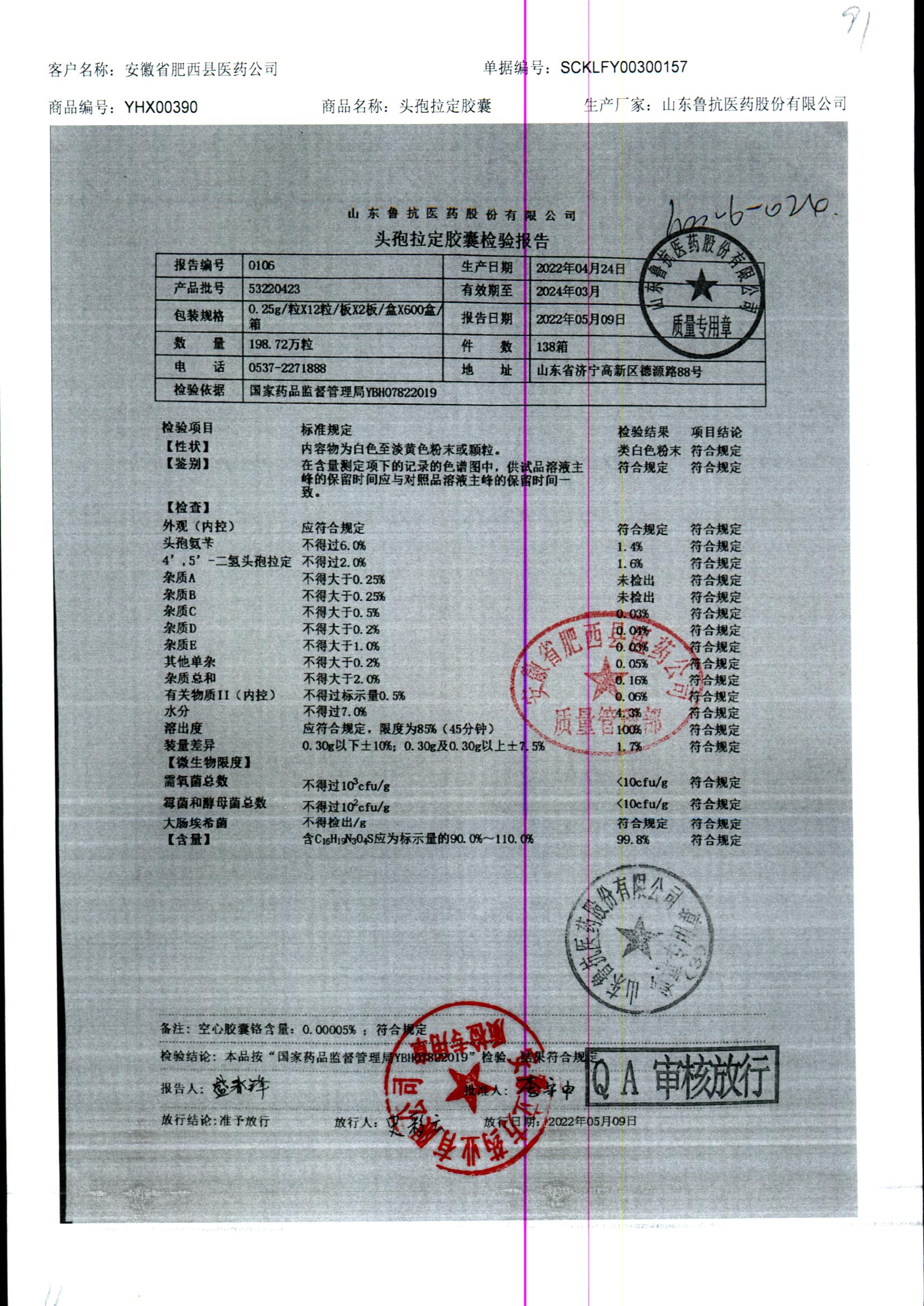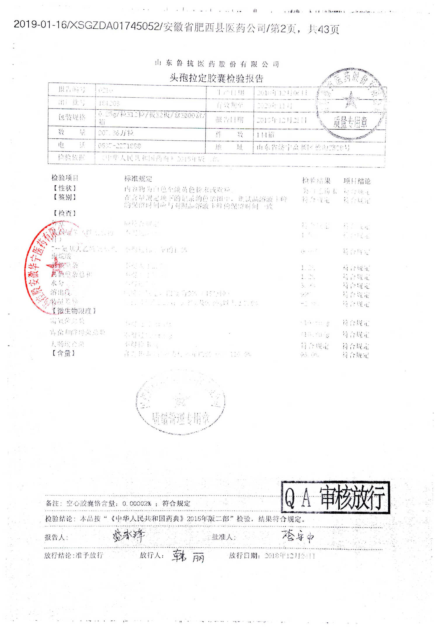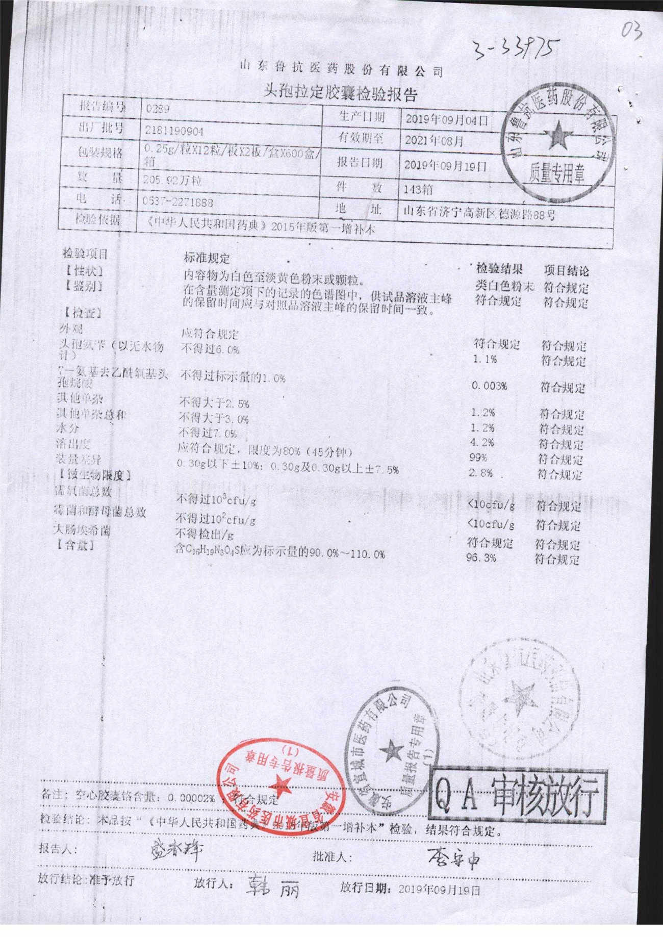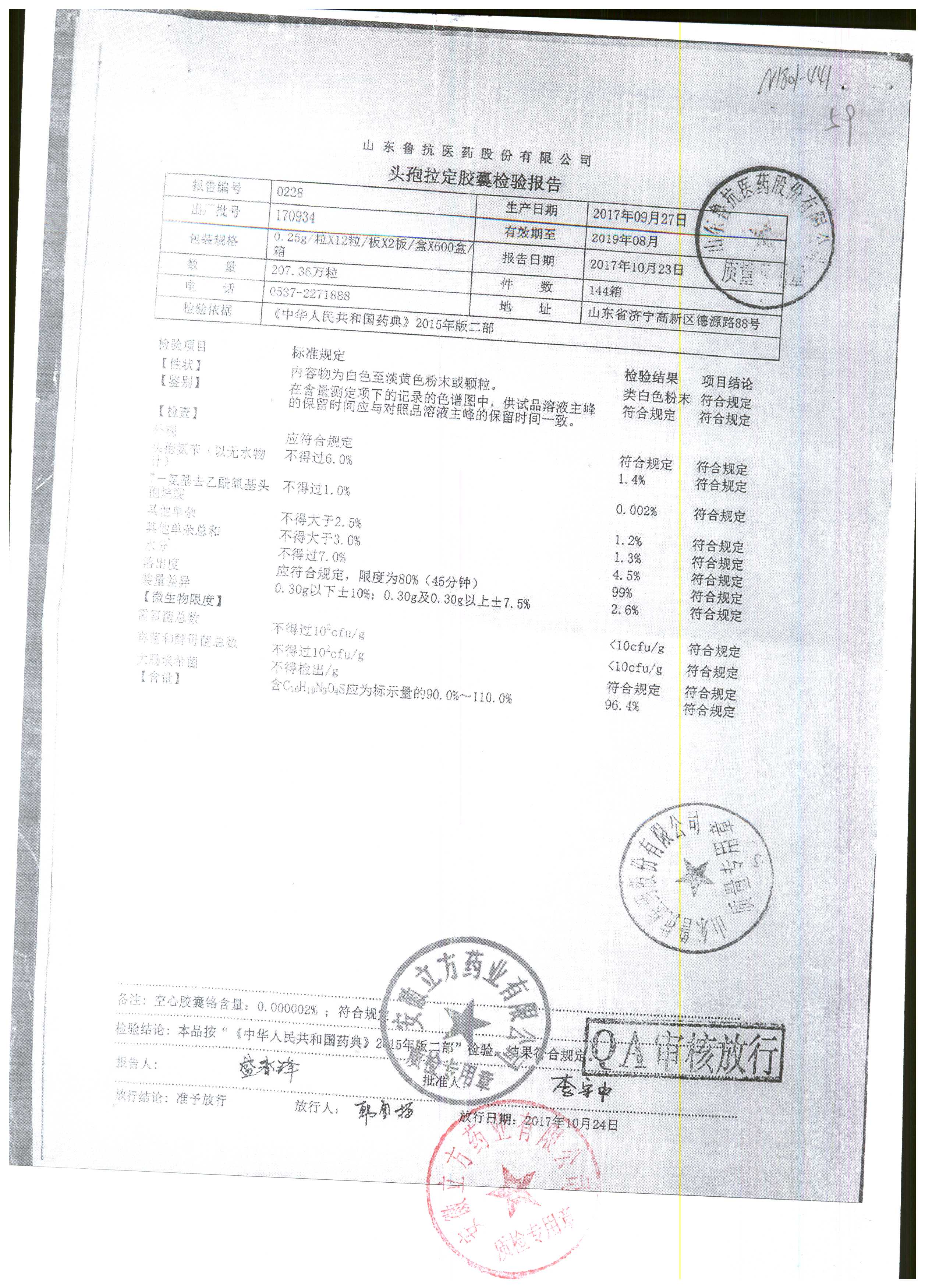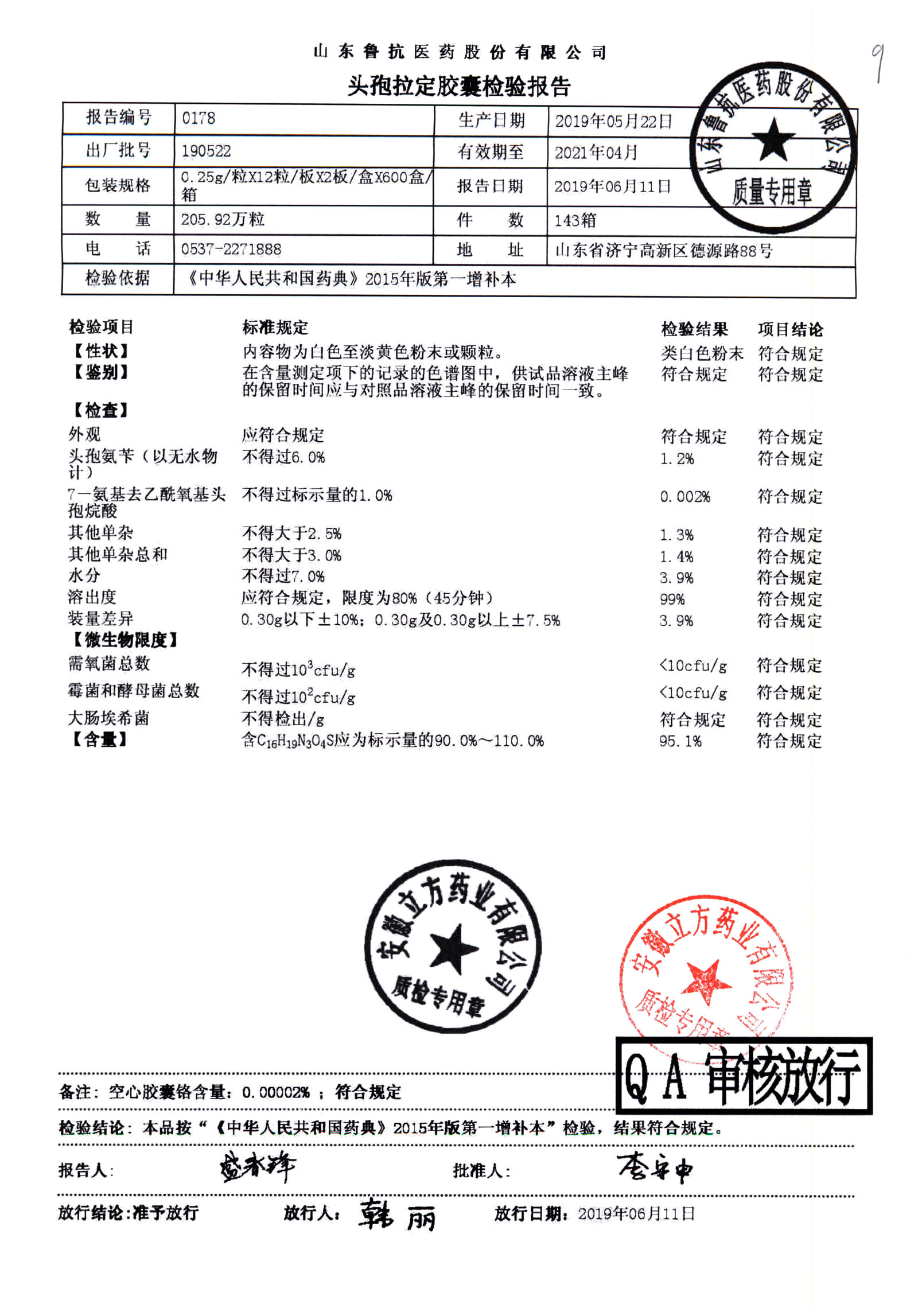 | 头孢拉定胶囊 | 0.25g*24粒 | 190429 | 查看详情 |