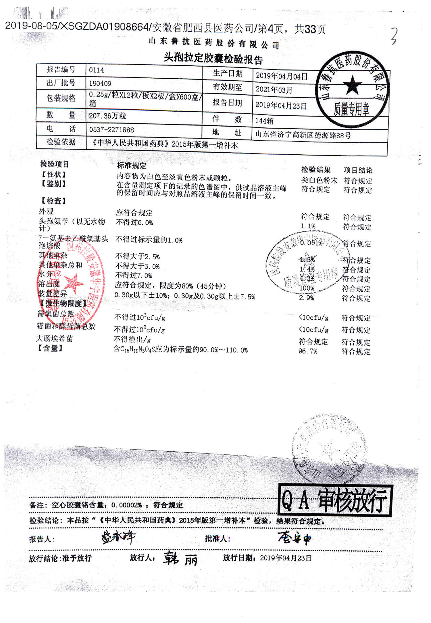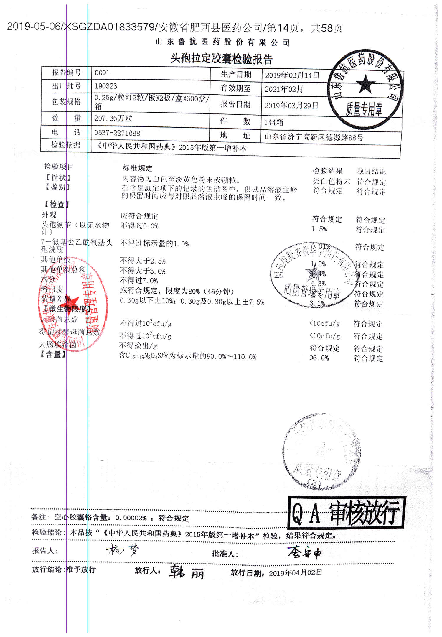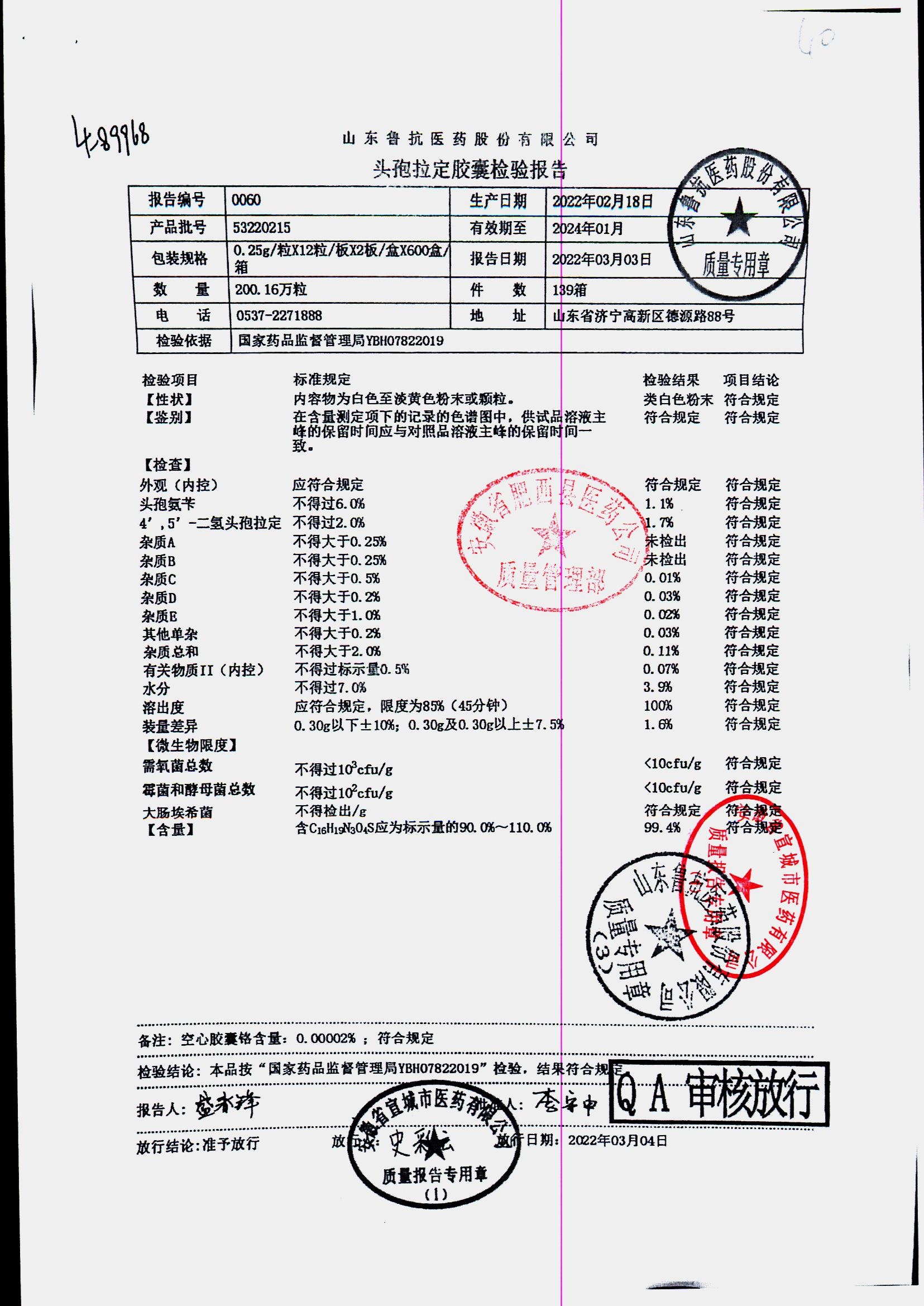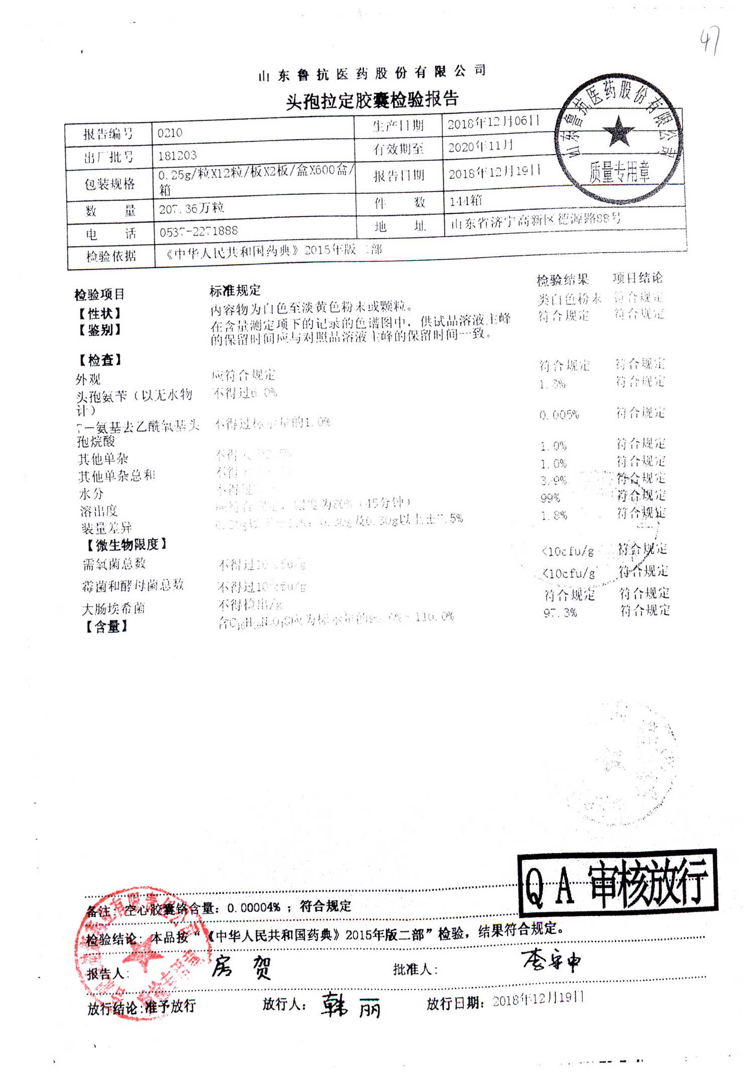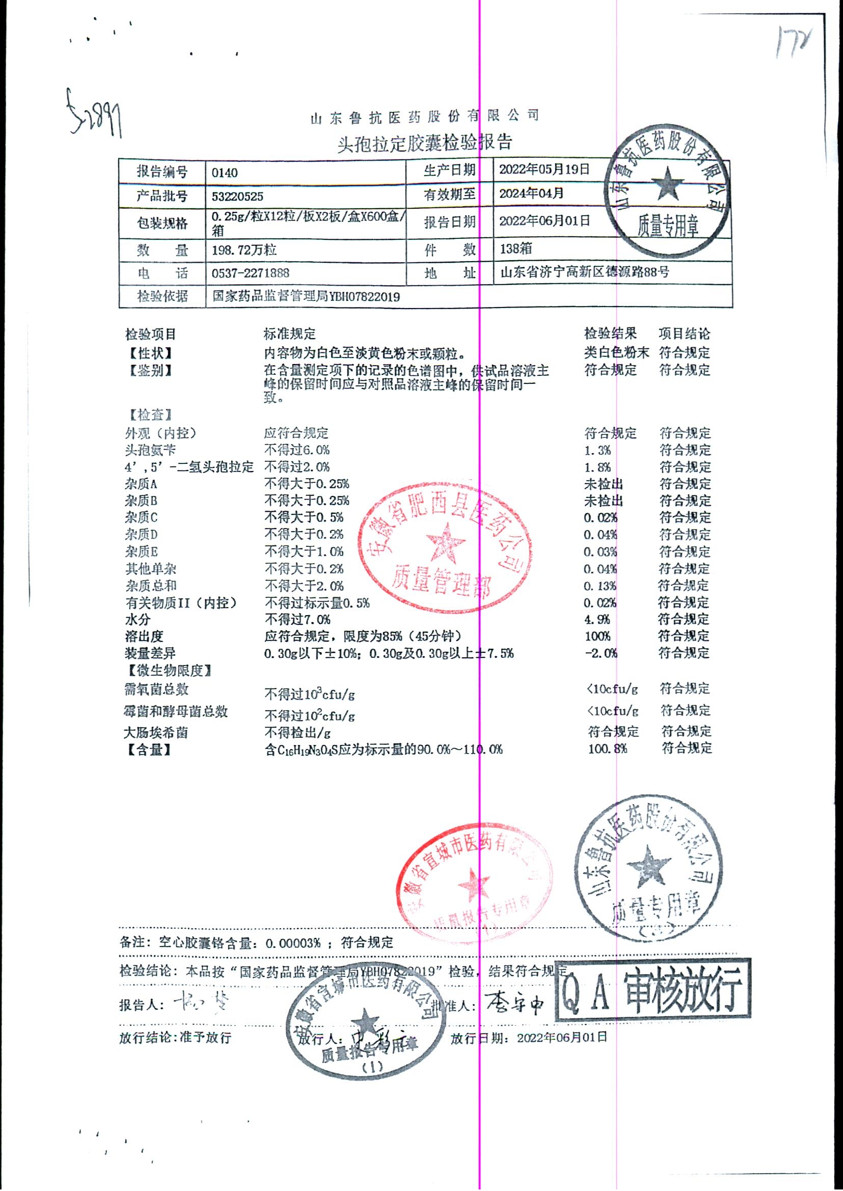 | 头孢拉定胶囊 | 0.25g*24粒 | 190429 | 查看详情 |