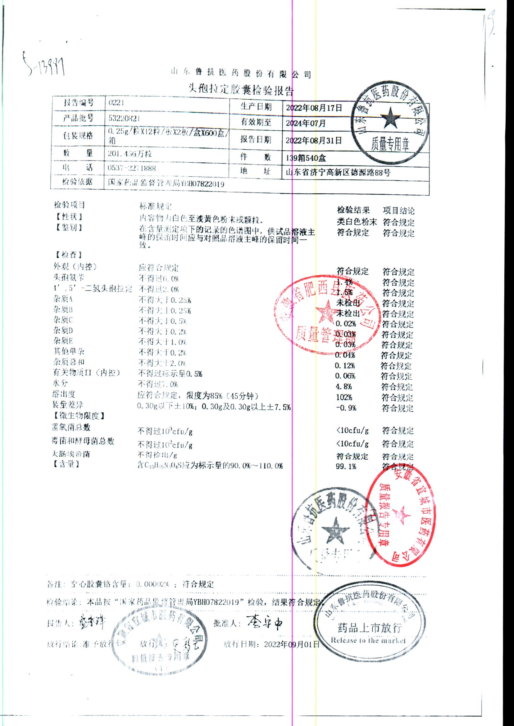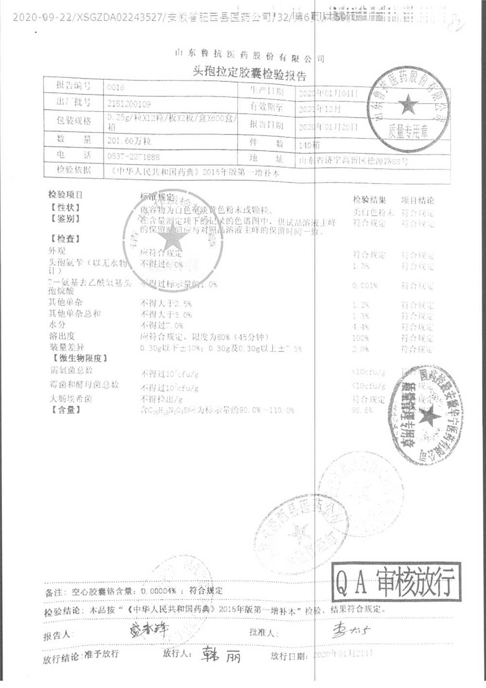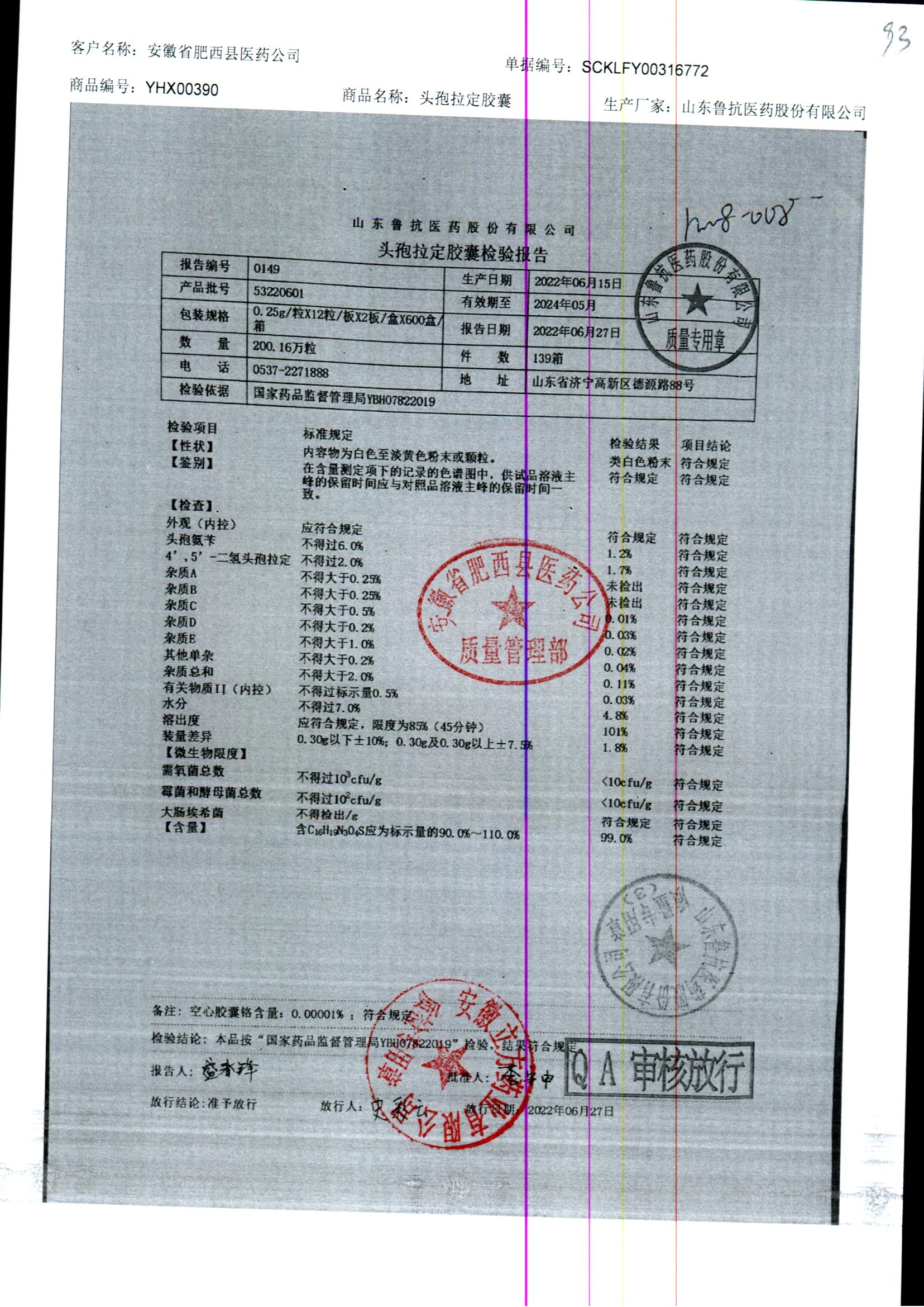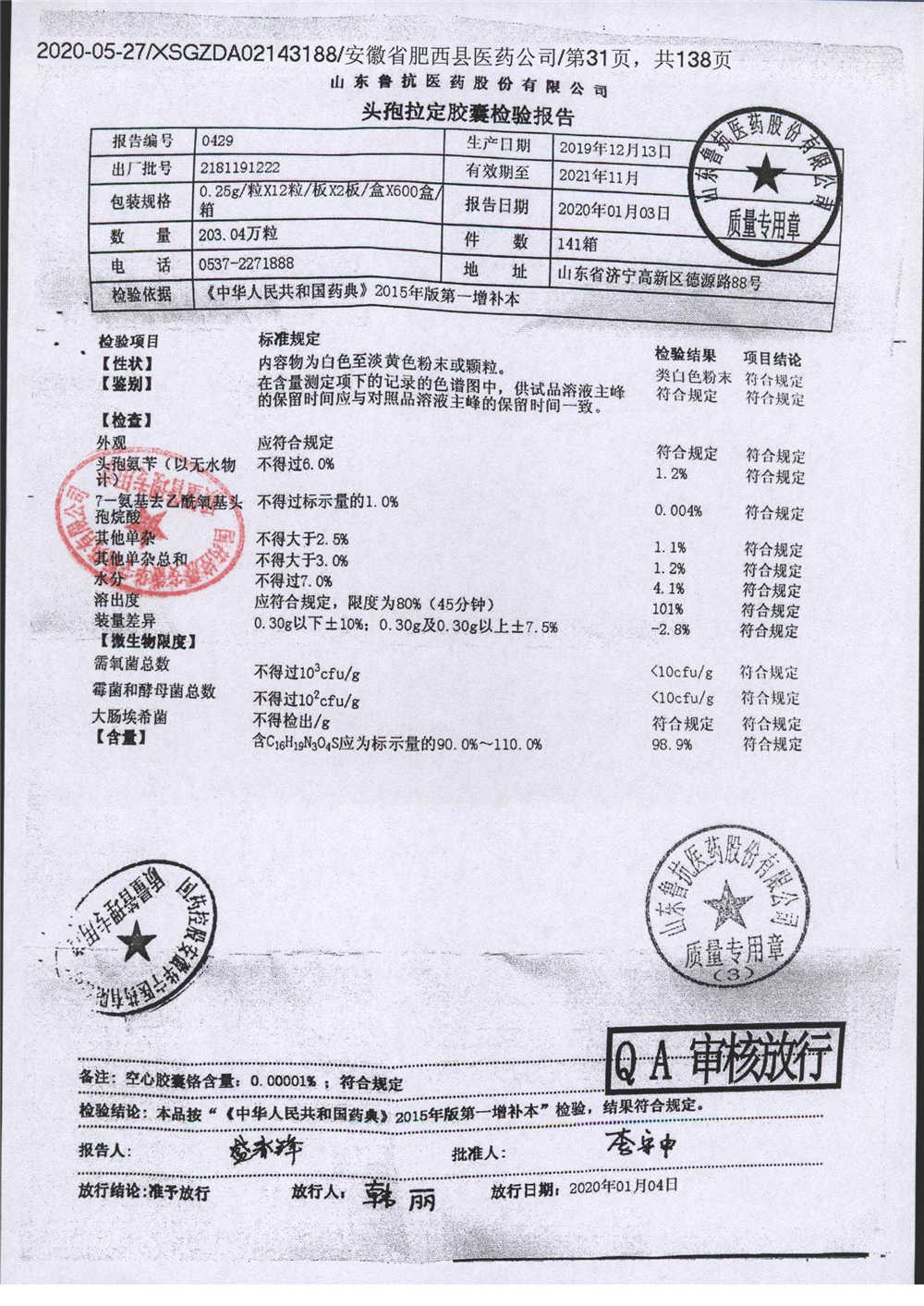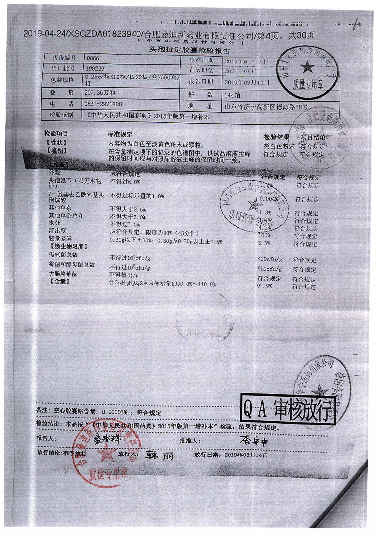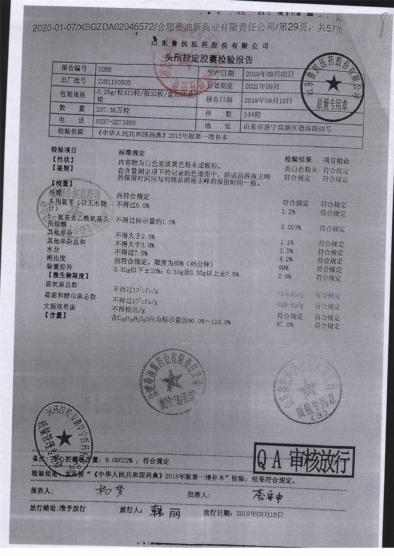 | 头孢拉定胶囊 | 0.25g*24粒 | 190429 | 查看详情 |