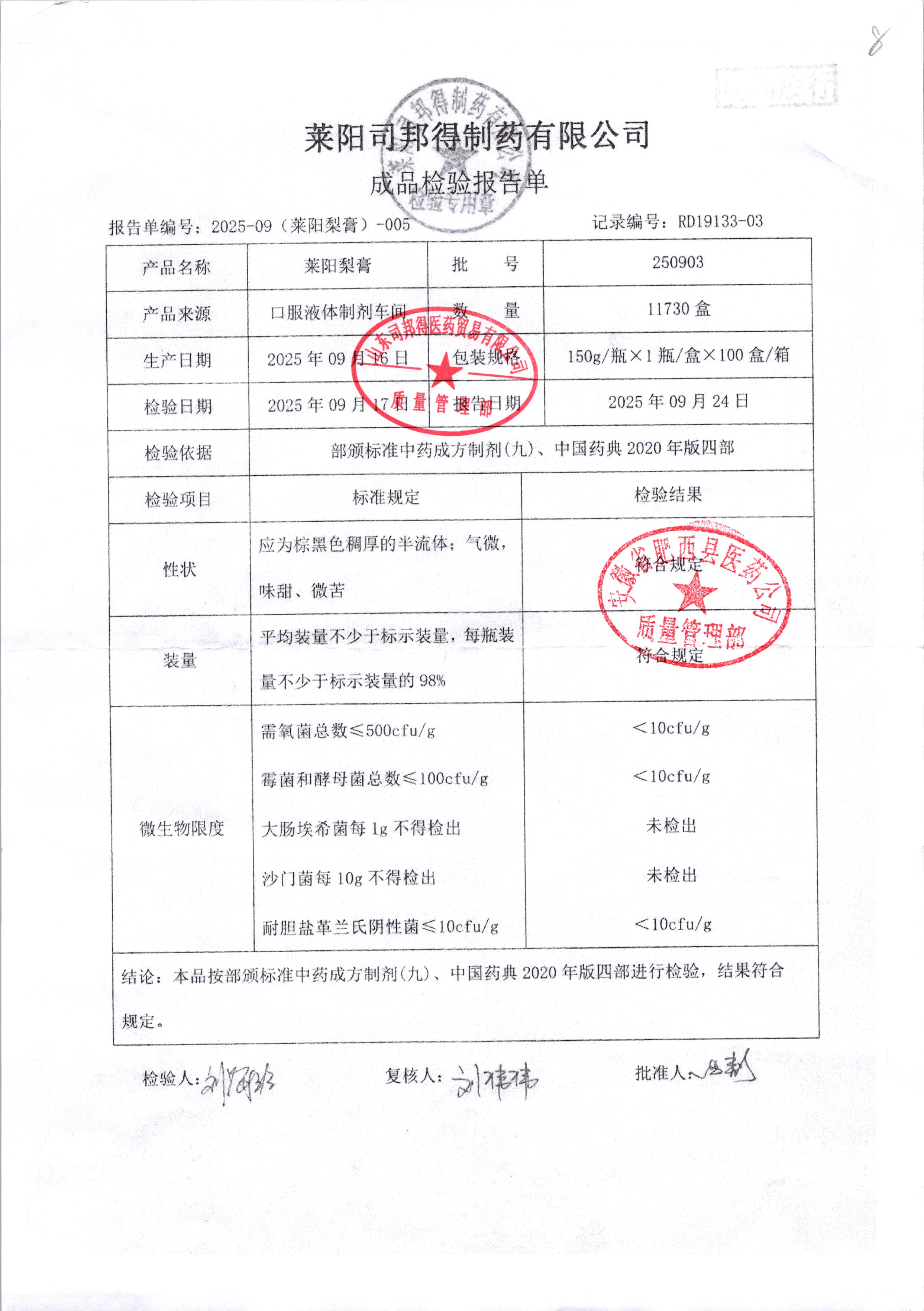 | 莱阳梨膏 | 150g/瓶 | 250903 | 查看详情 |