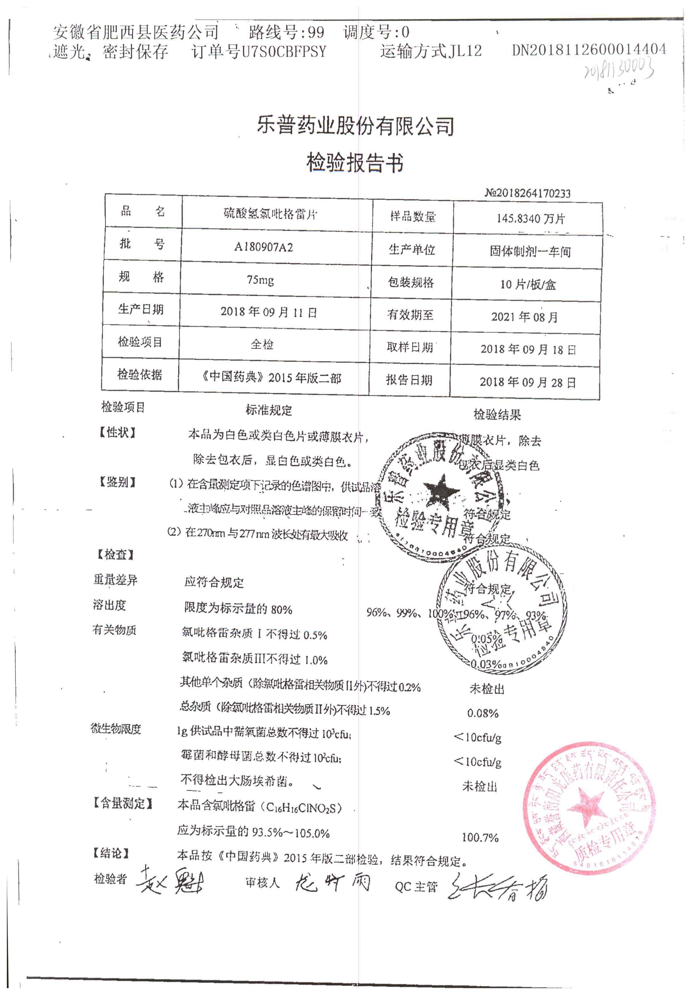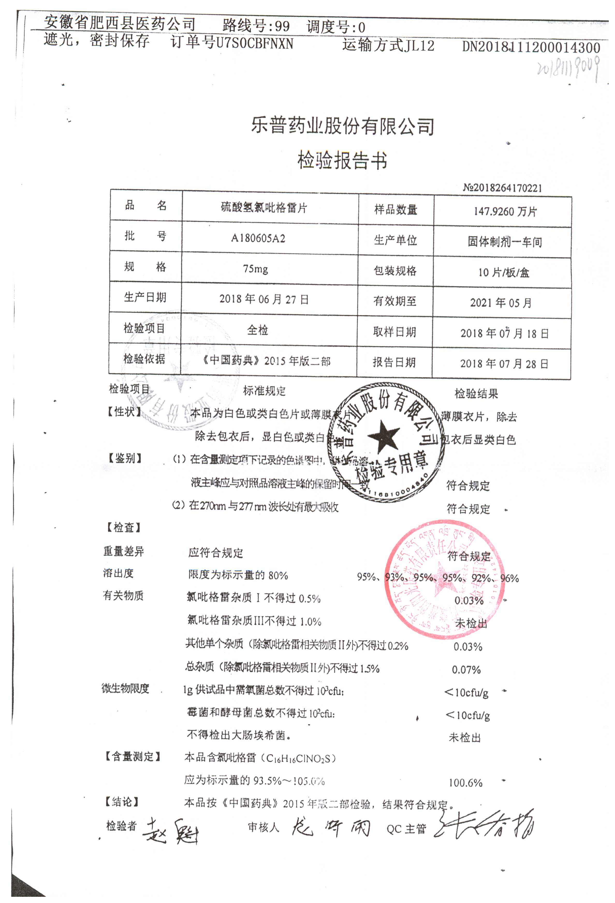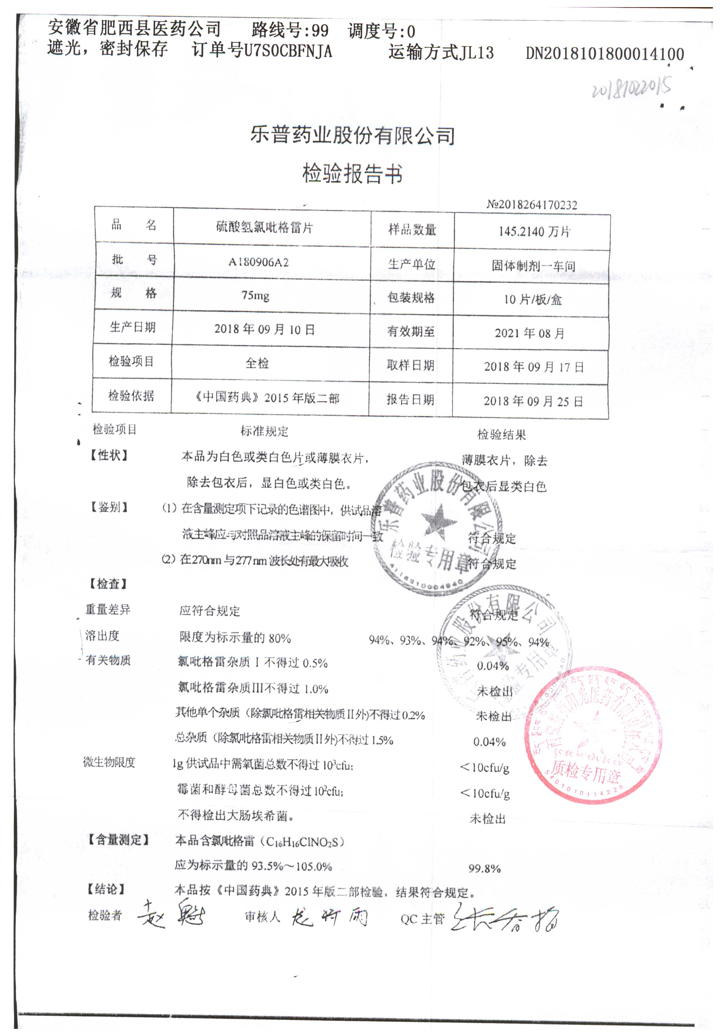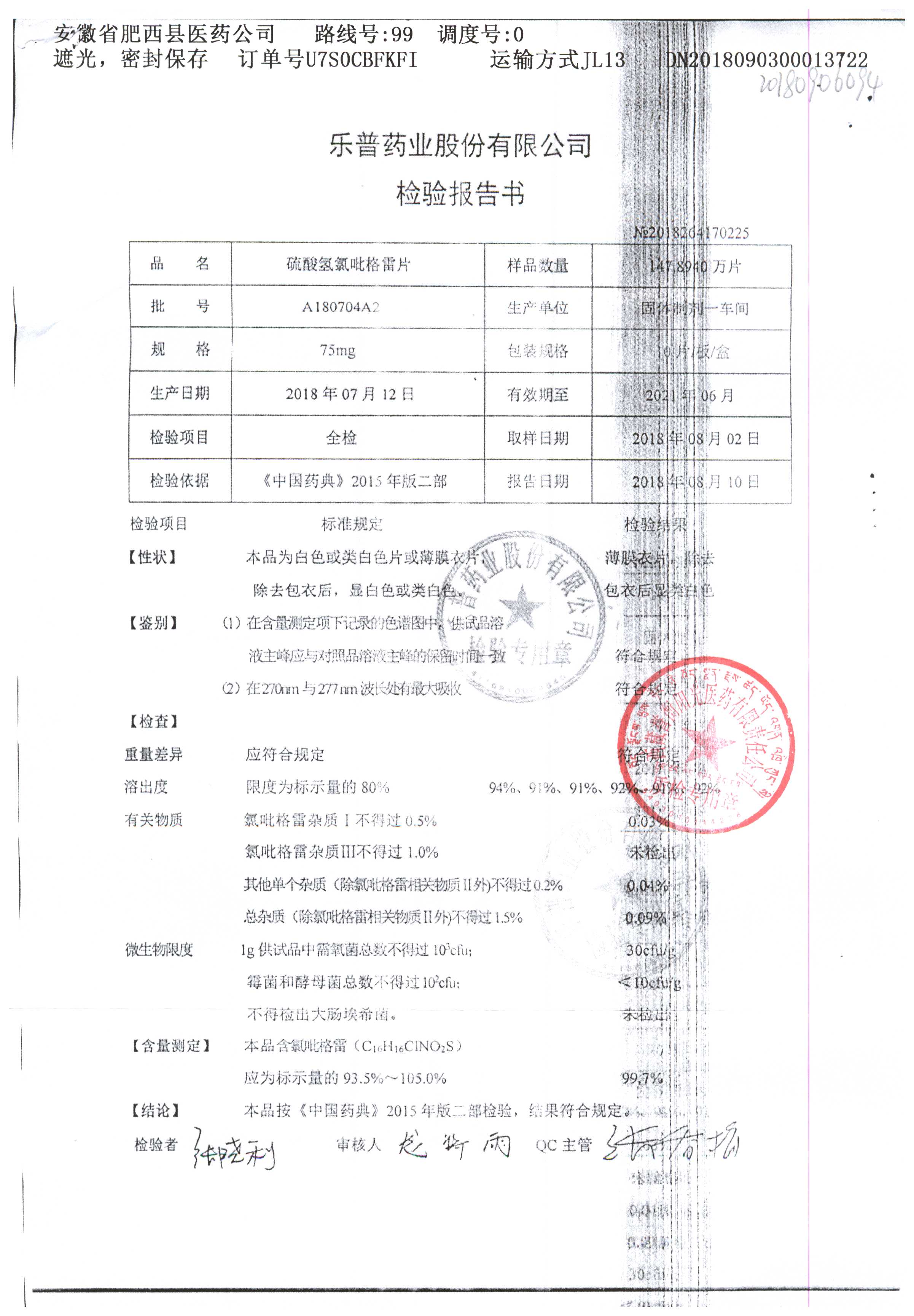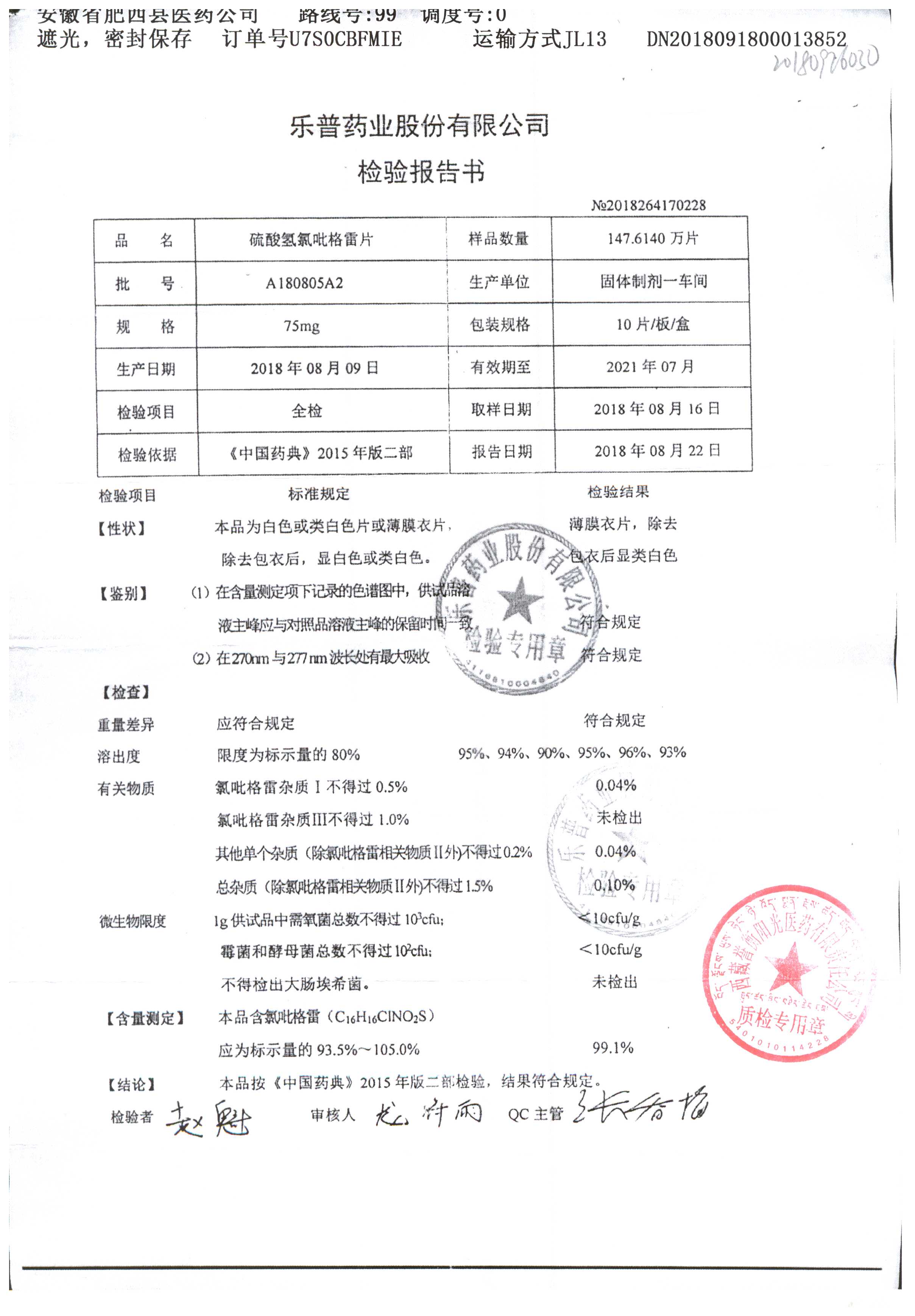 | 硫酸氢氯吡格雷片 | 75mg*10s | A180805A2 | 查看详情 |