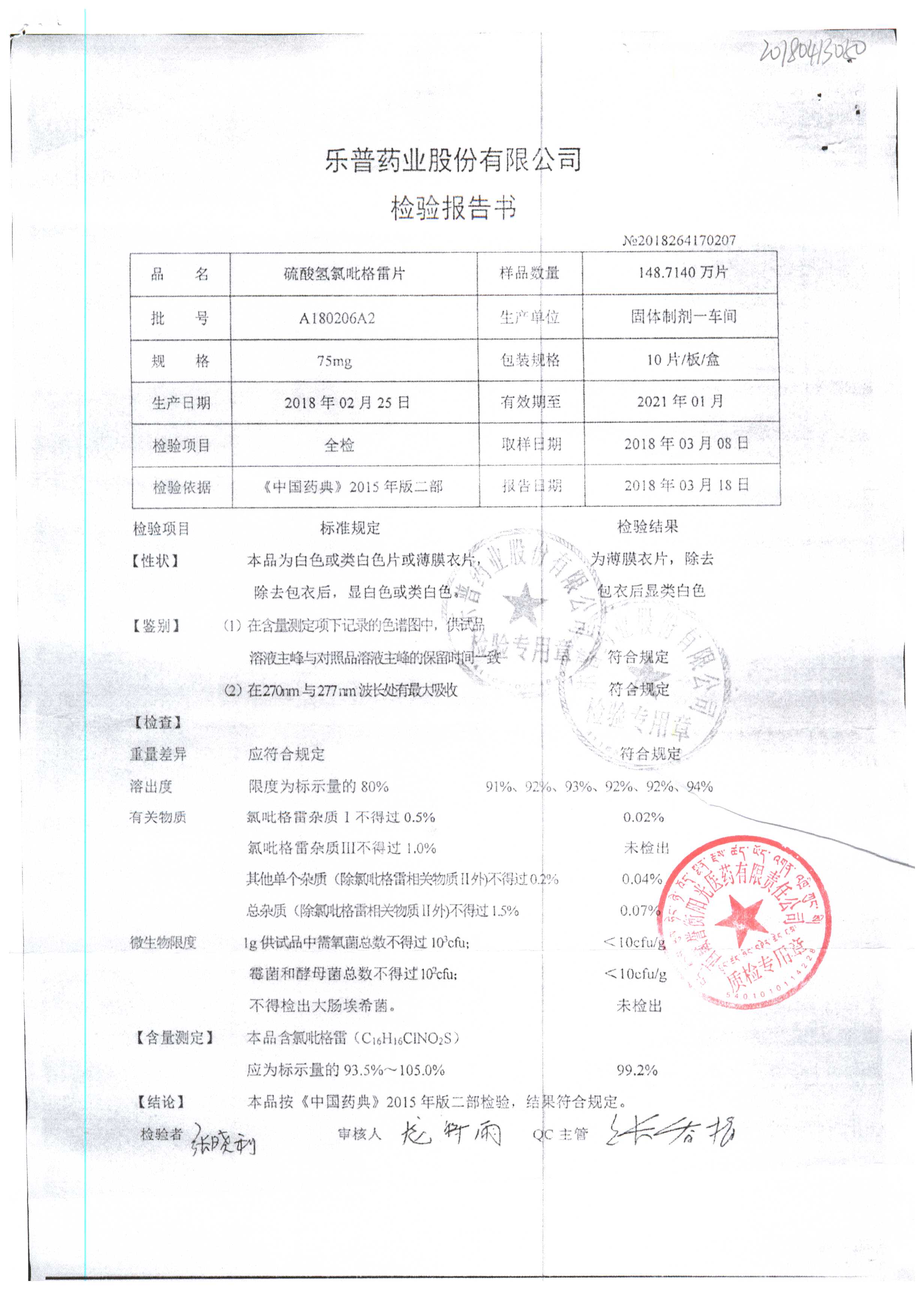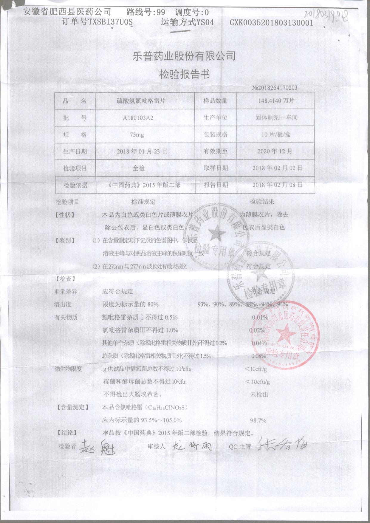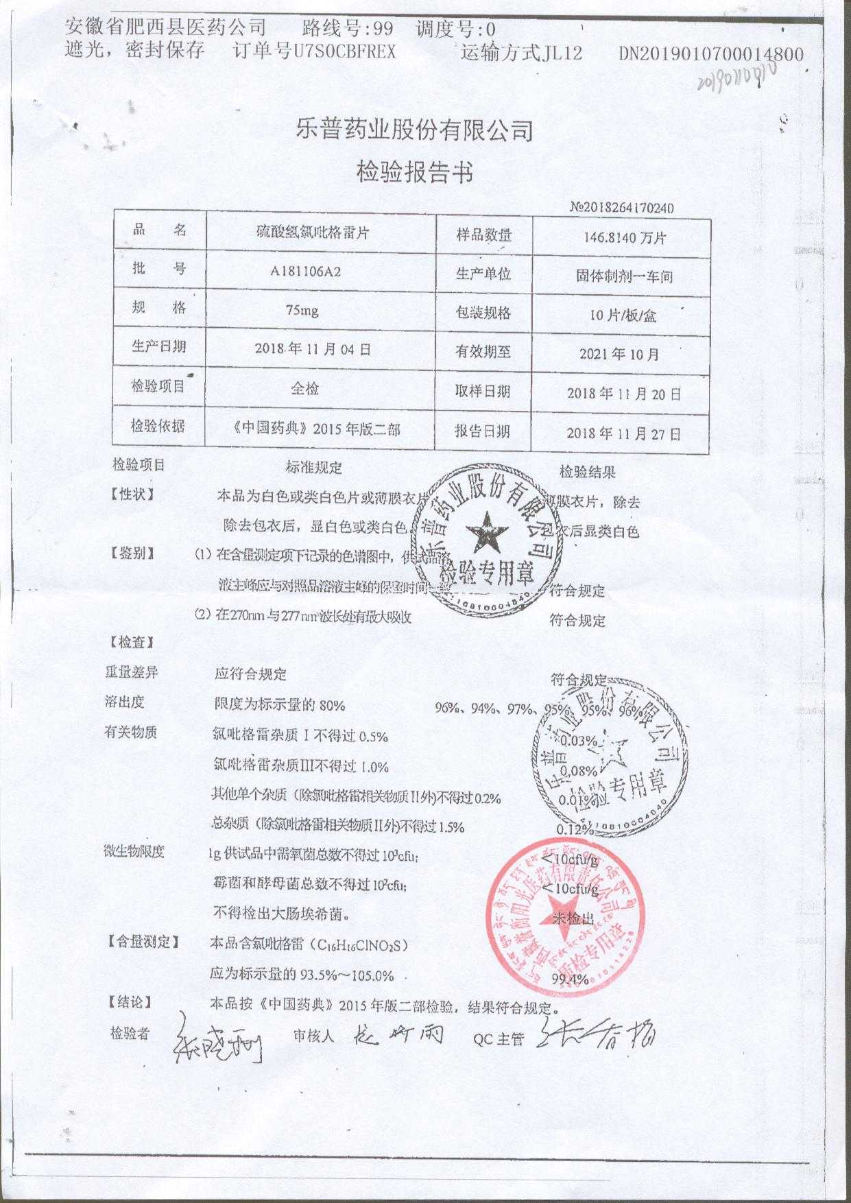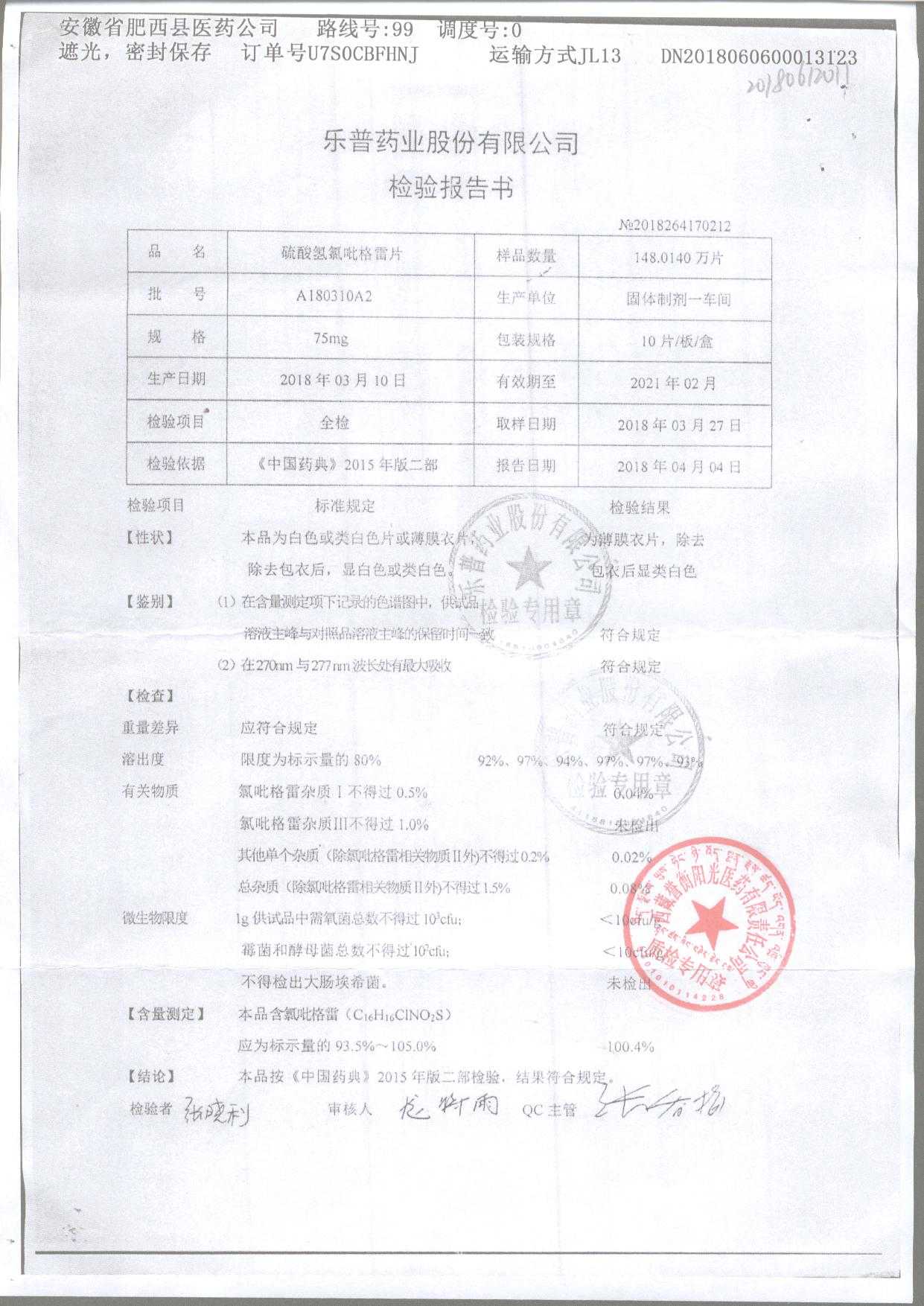 | 硫酸氢氯吡格雷片 | 75mg*10s | A180401A2 | 查看详情 |