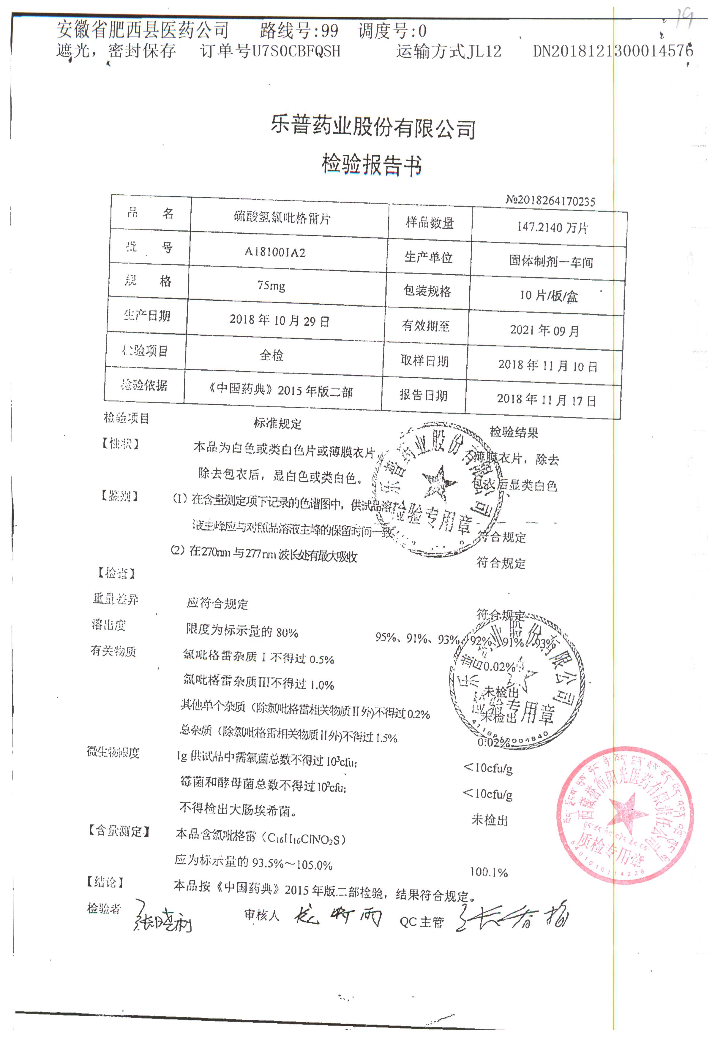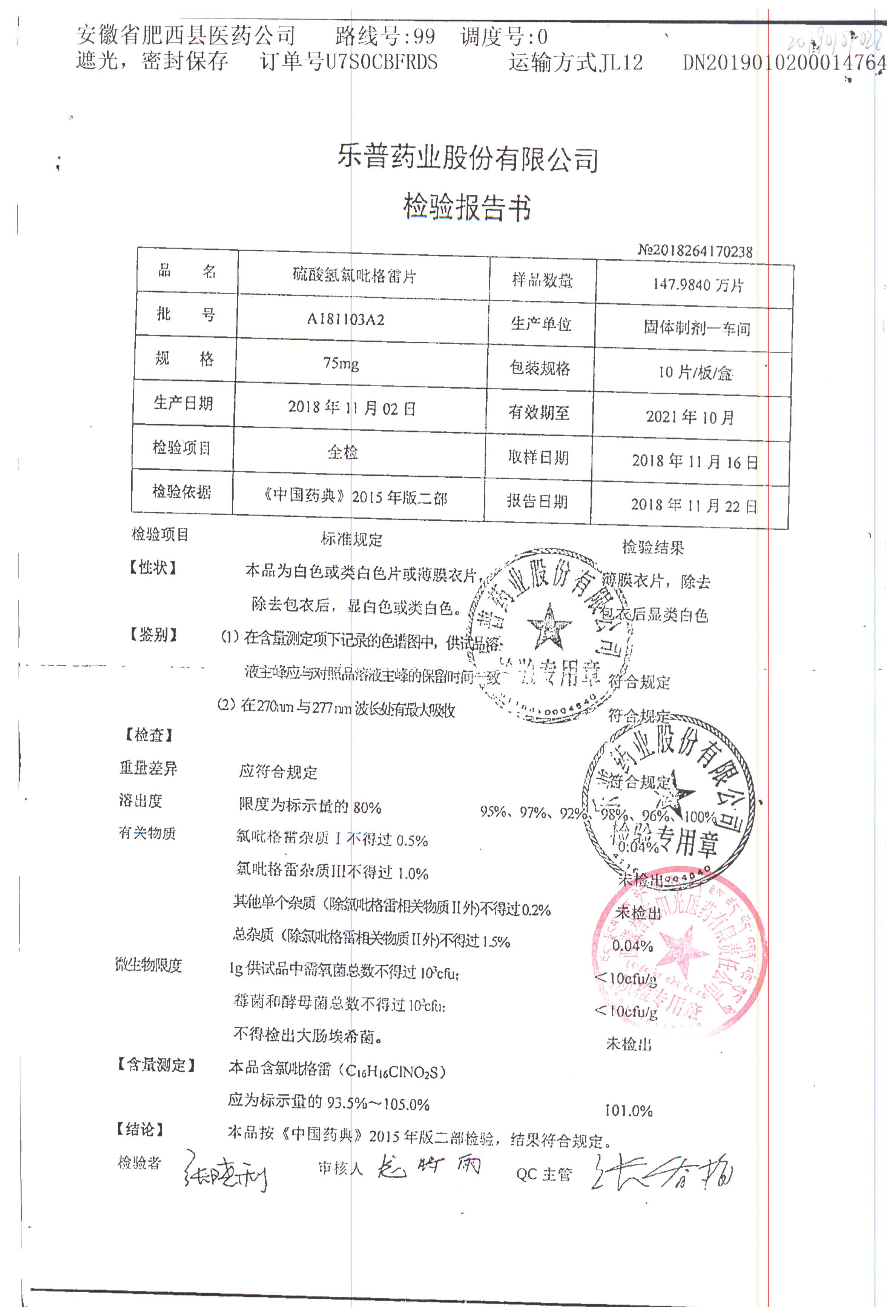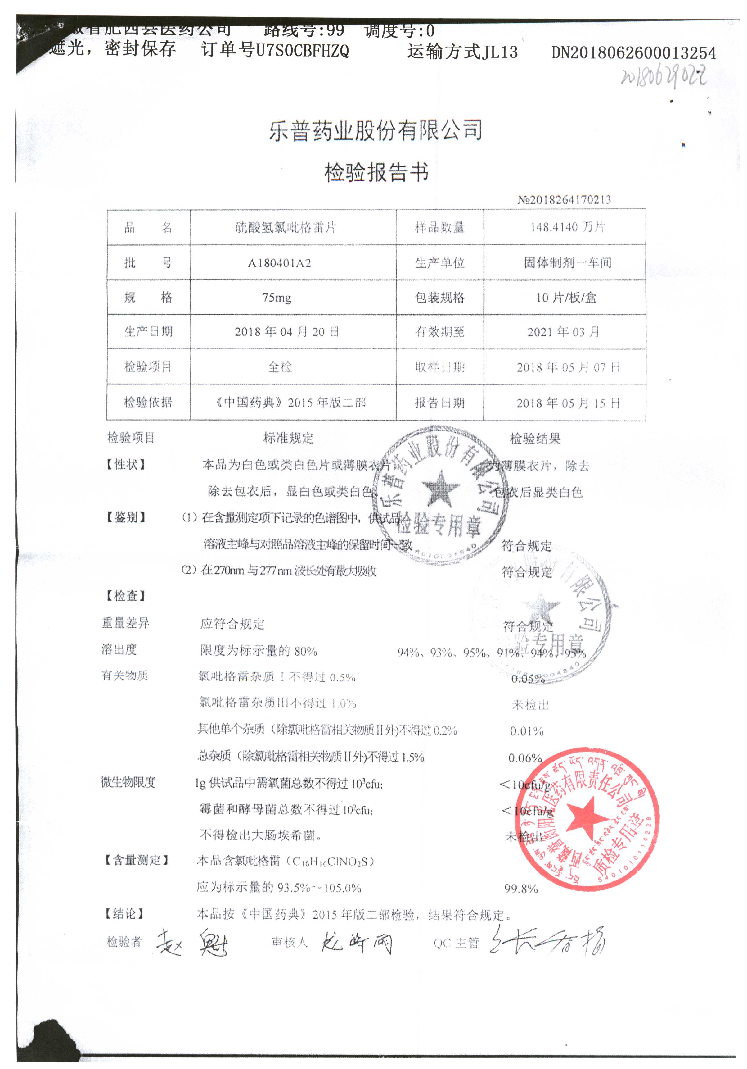 | 硫酸氢氯吡格雷片 | 75mg*10s | A180401A2 | 查看详情 |