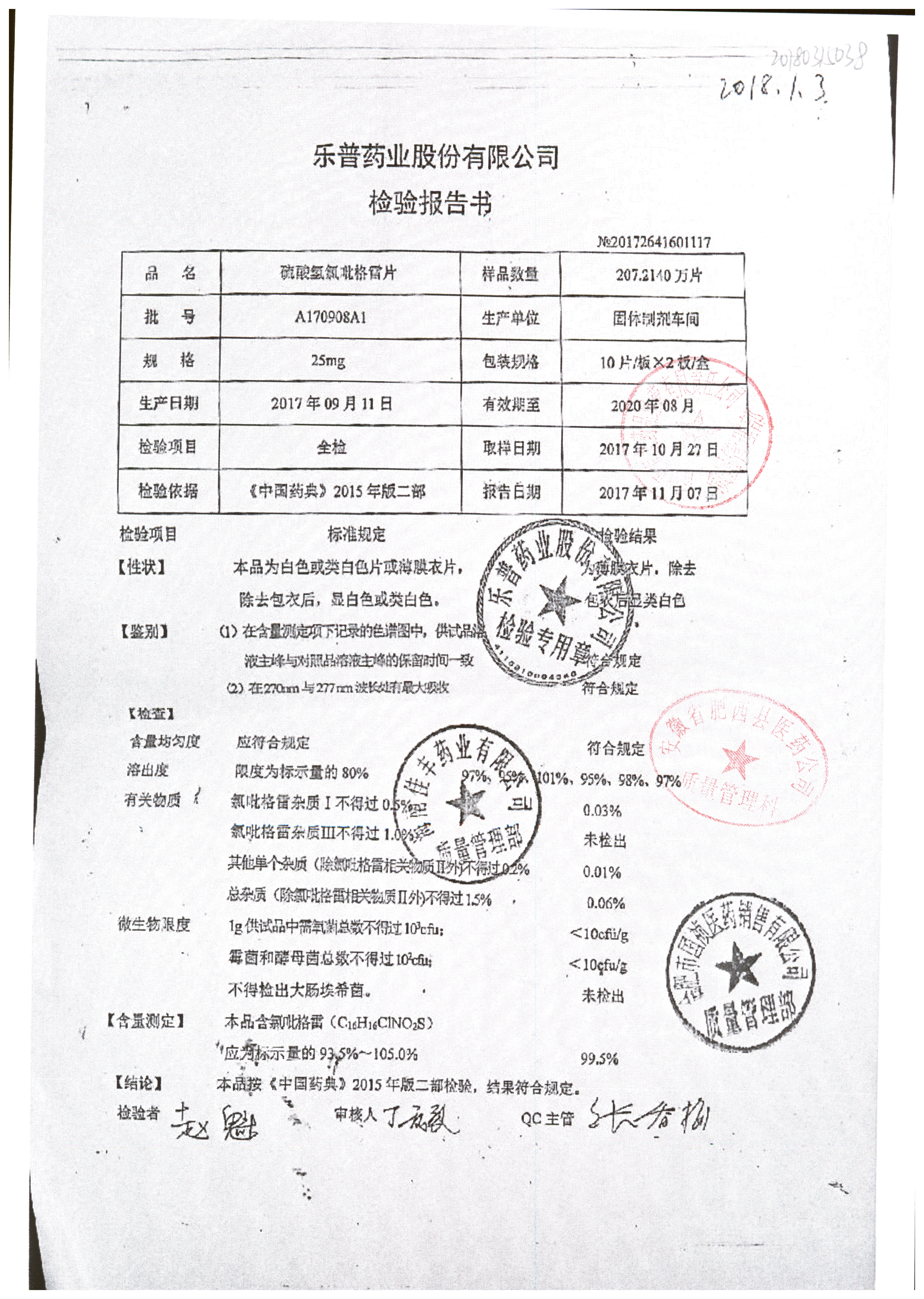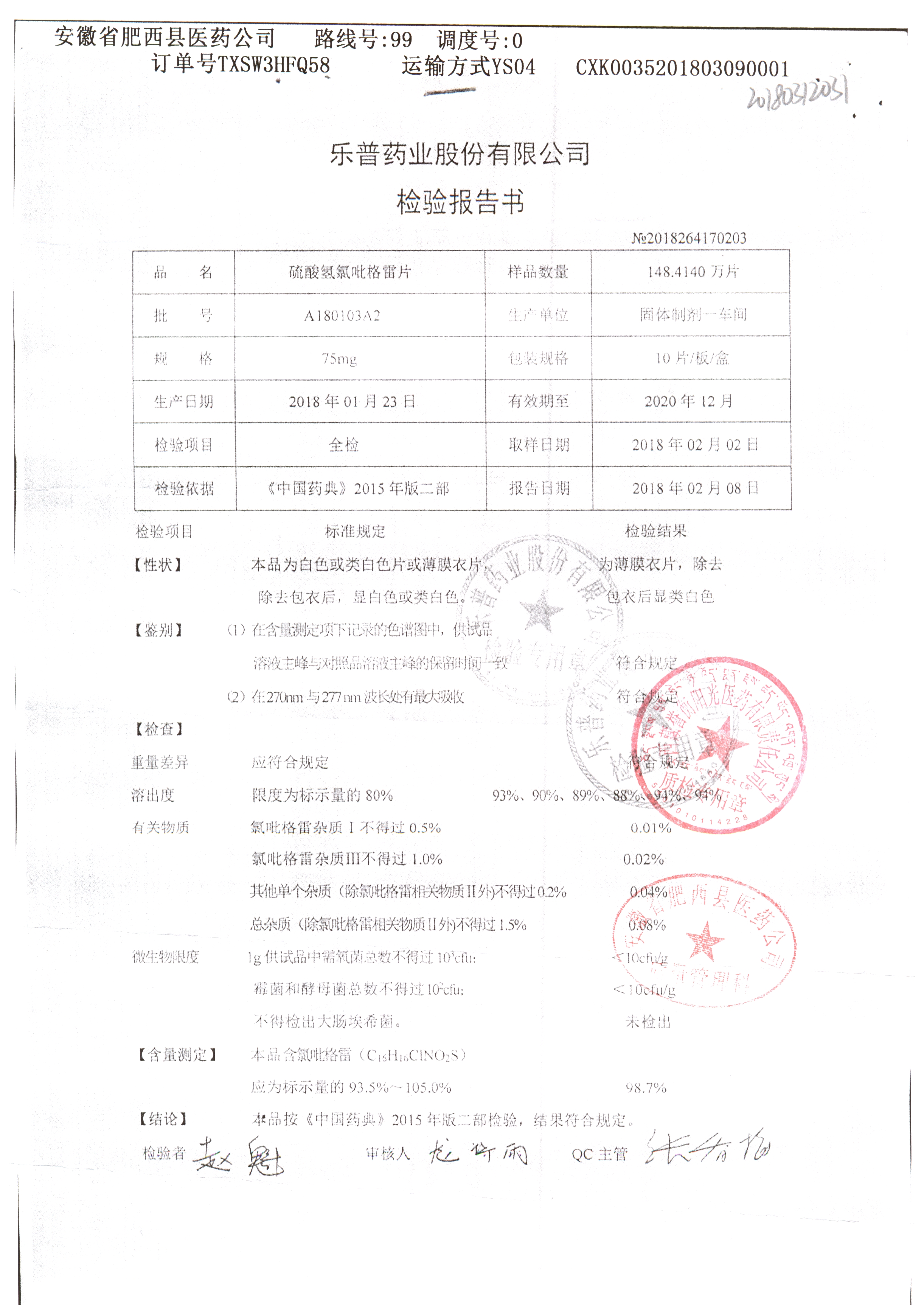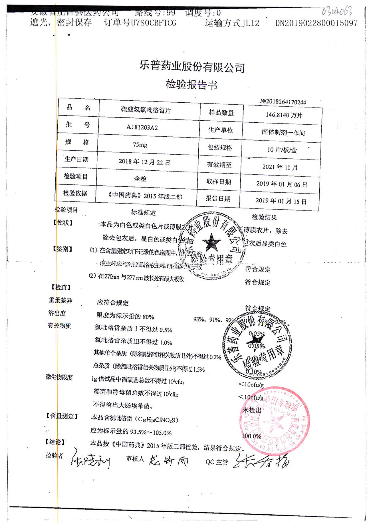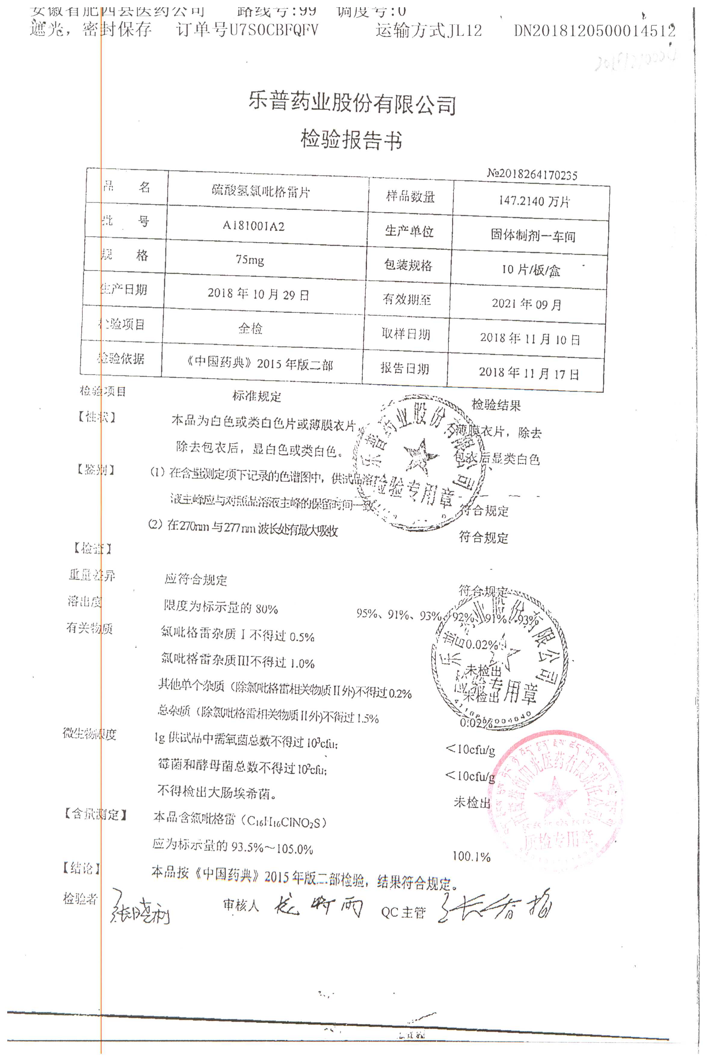 | 硫酸氢氯吡格雷片 | 75mg*10s | A180401A2 | 查看详情 |