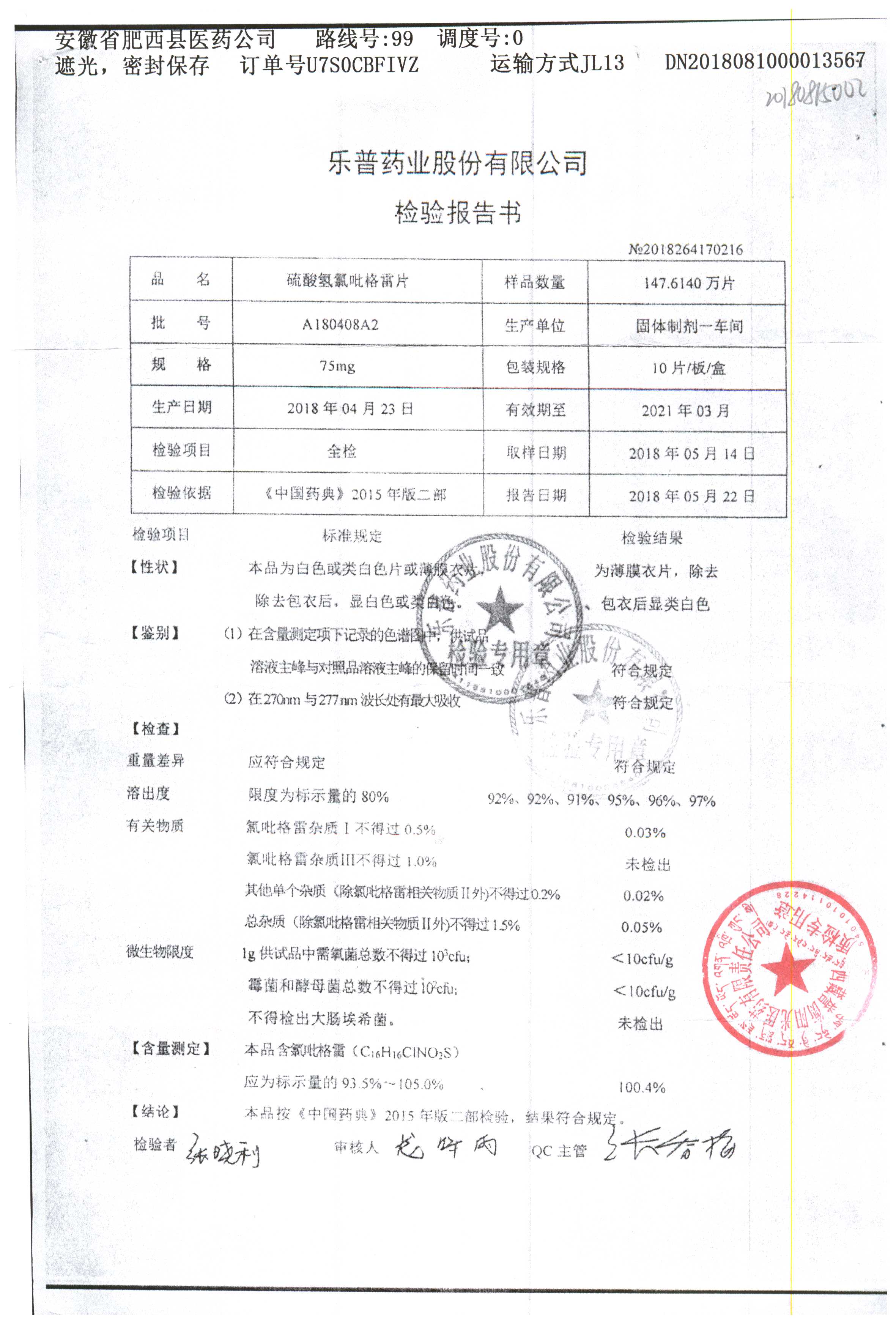 | 硫酸氢氯吡格雷片 | 75mg*10s | A180408A2 | 查看详情 |