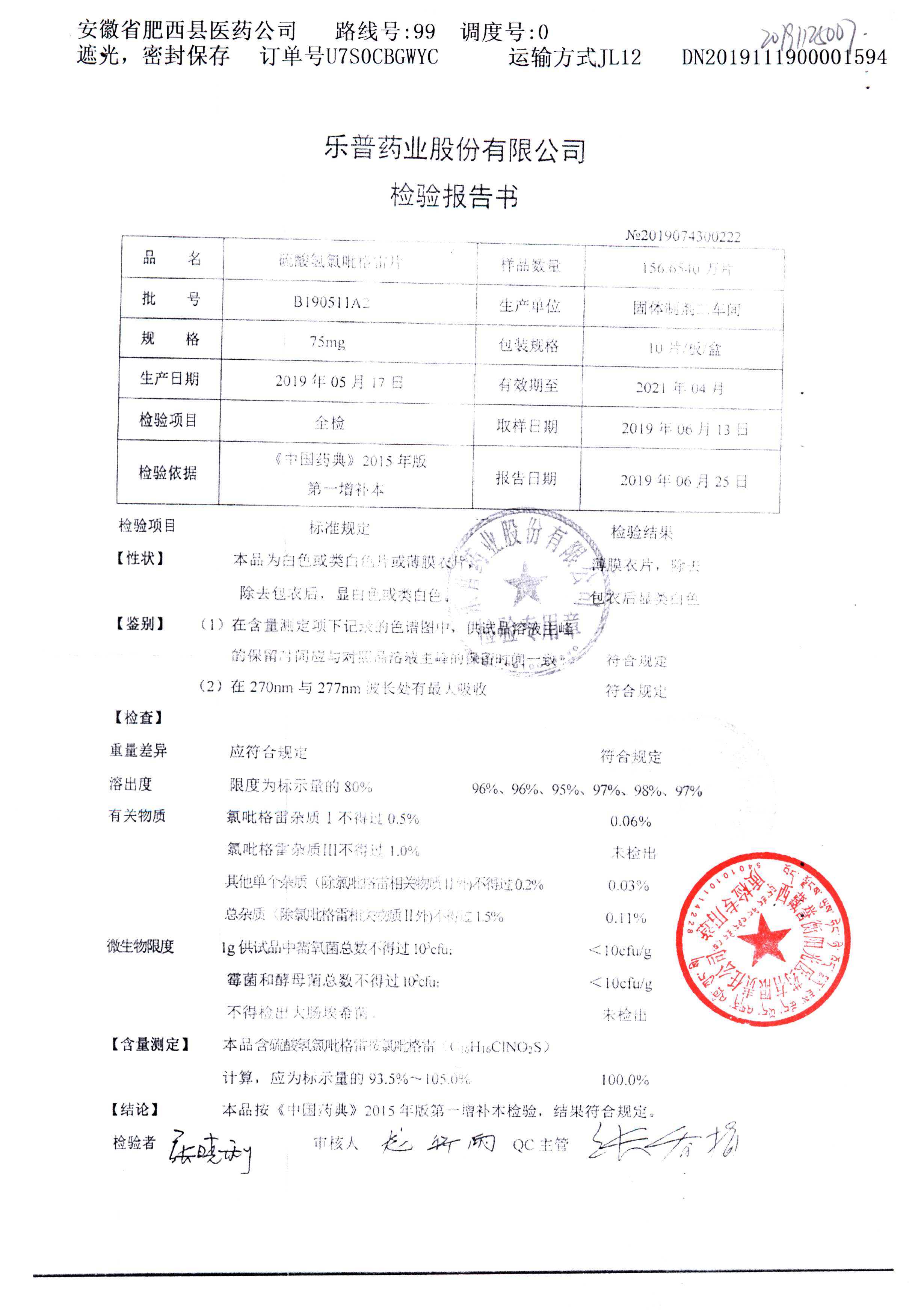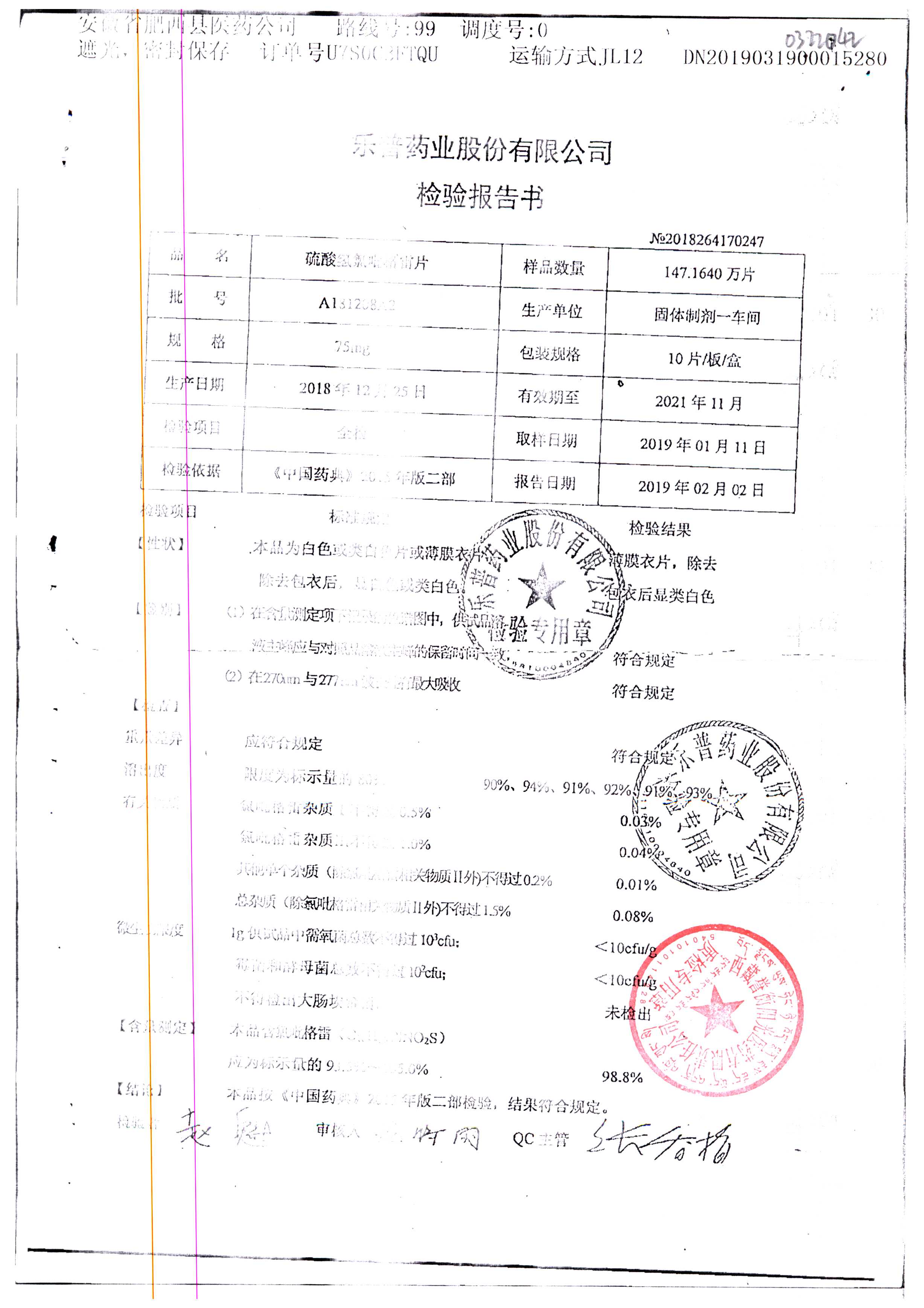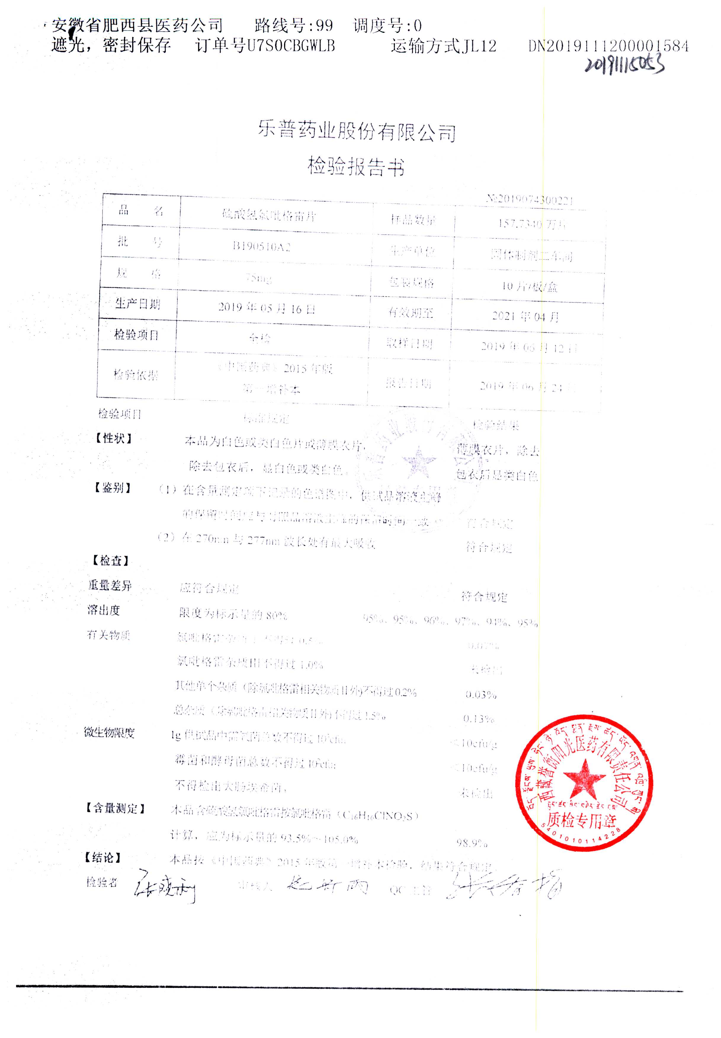| 硫酸氢氯吡格雷片 | 75mg*10s | B190511A2 | 查看详情 |