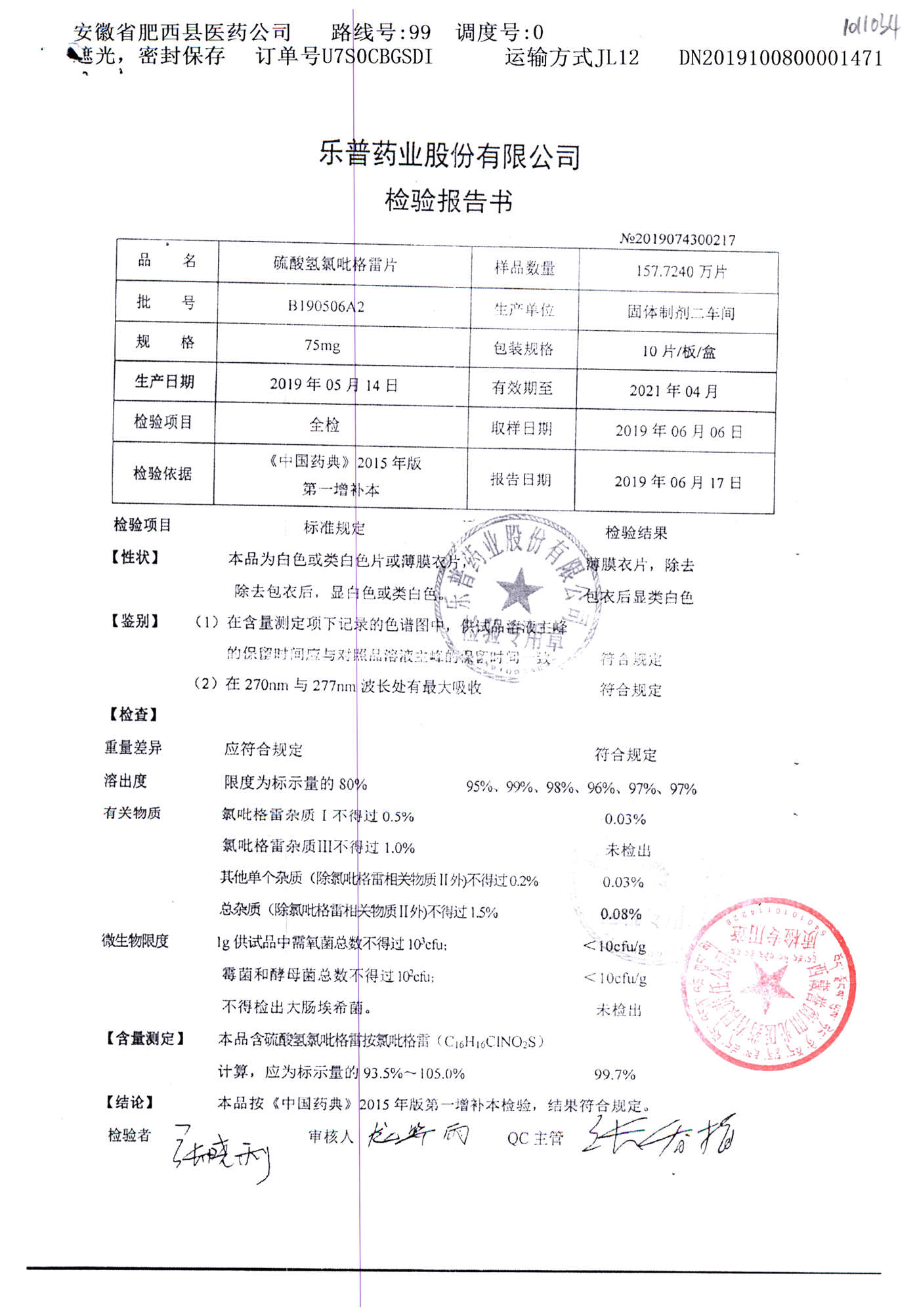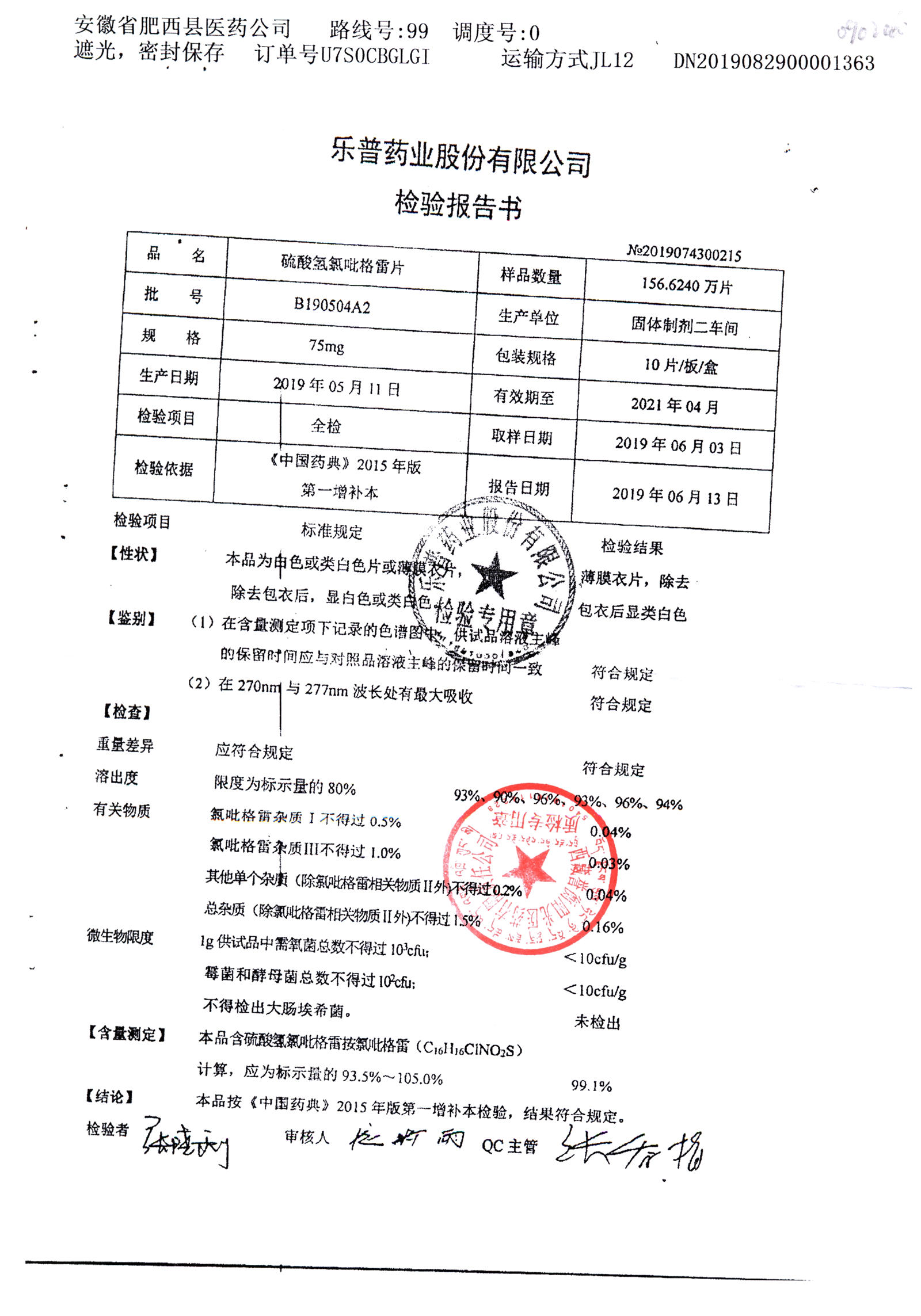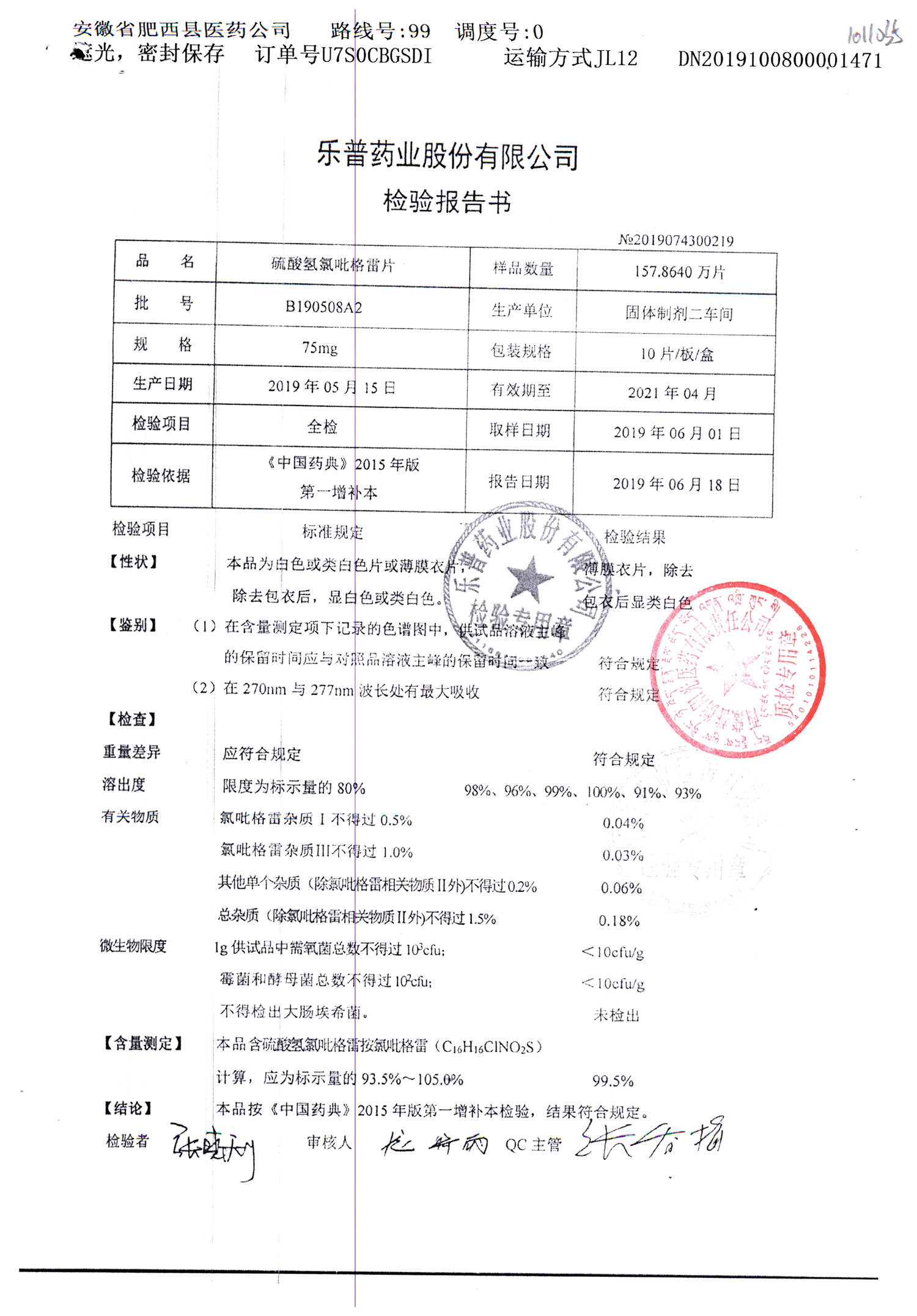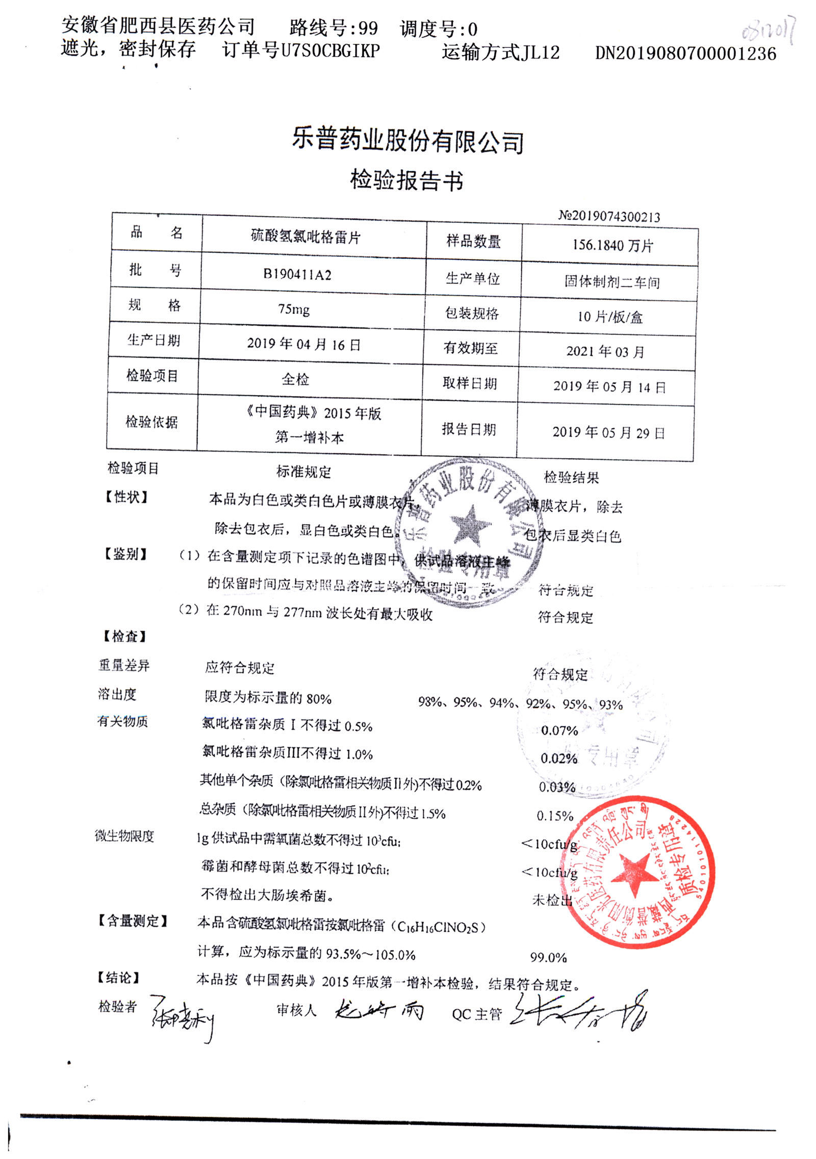 | 硫酸氢氯吡格雷片 | 75mg*10s | B190511A2 | 查看详情 |
