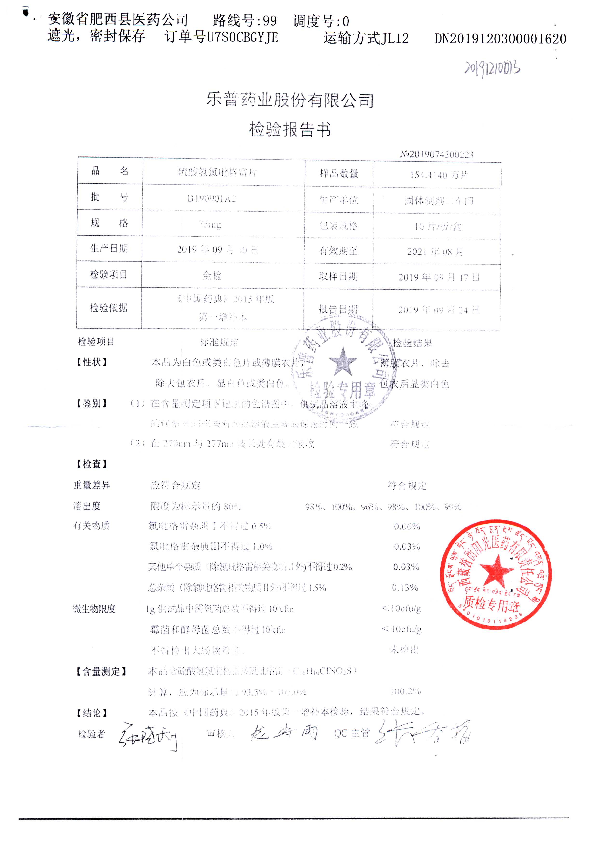 | 硫酸氢氯吡格雷片 | 75mg*10s | B190901A2 | 查看详情 |