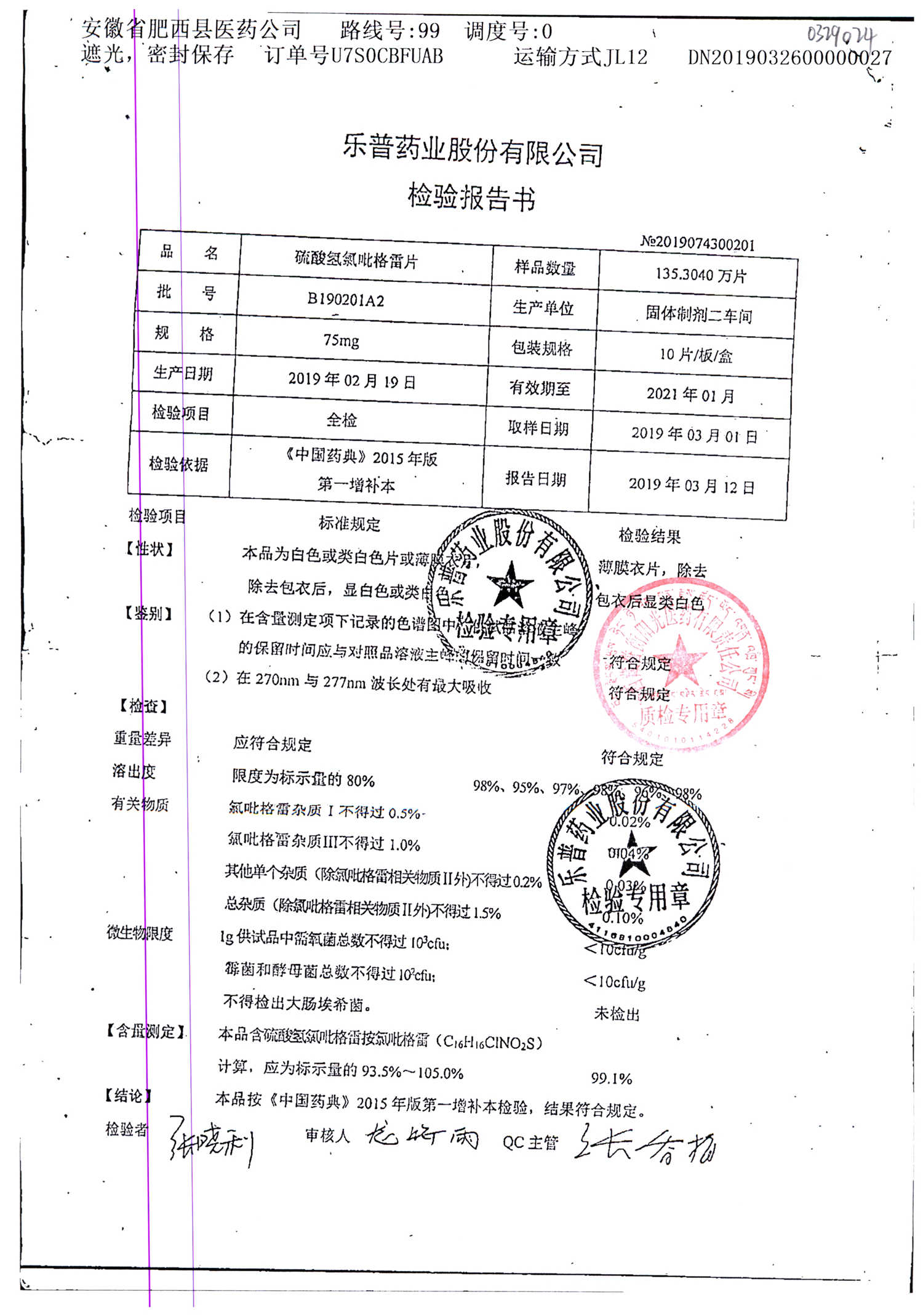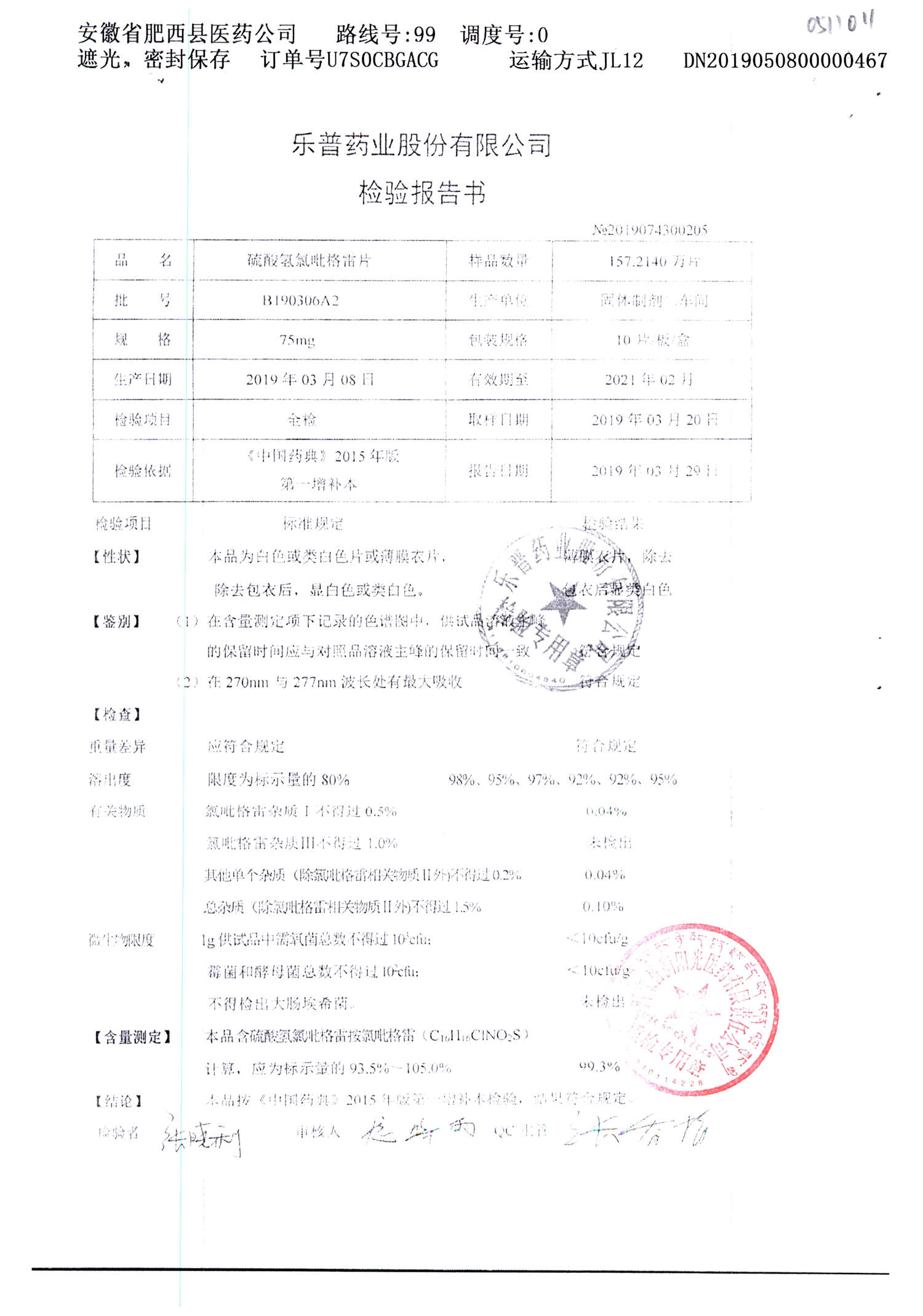 | 硫酸氢氯吡格雷片 | 75mg*10s | B190306A2 | 查看详情 |
