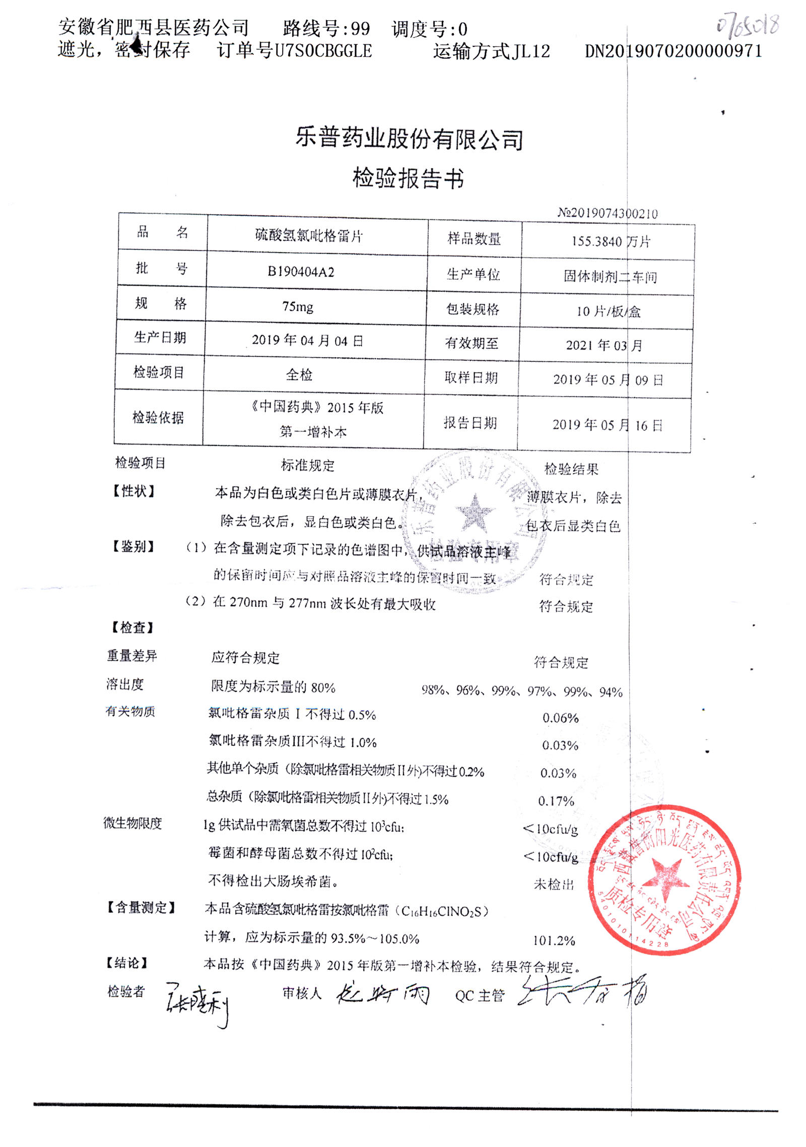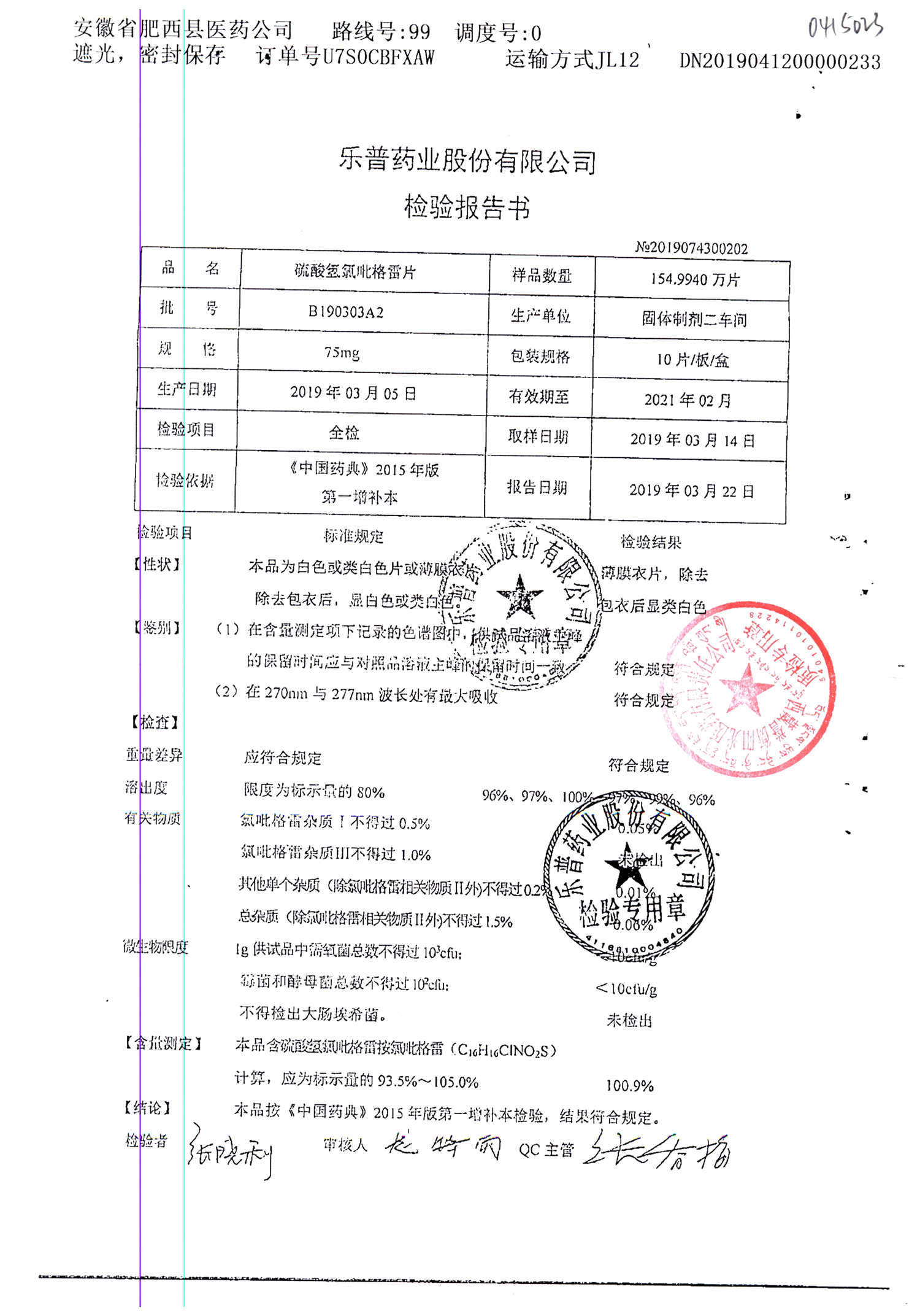 | 硫酸氢氯吡格雷片 | 75mg*10s | B190404A2 | 查看详情 |