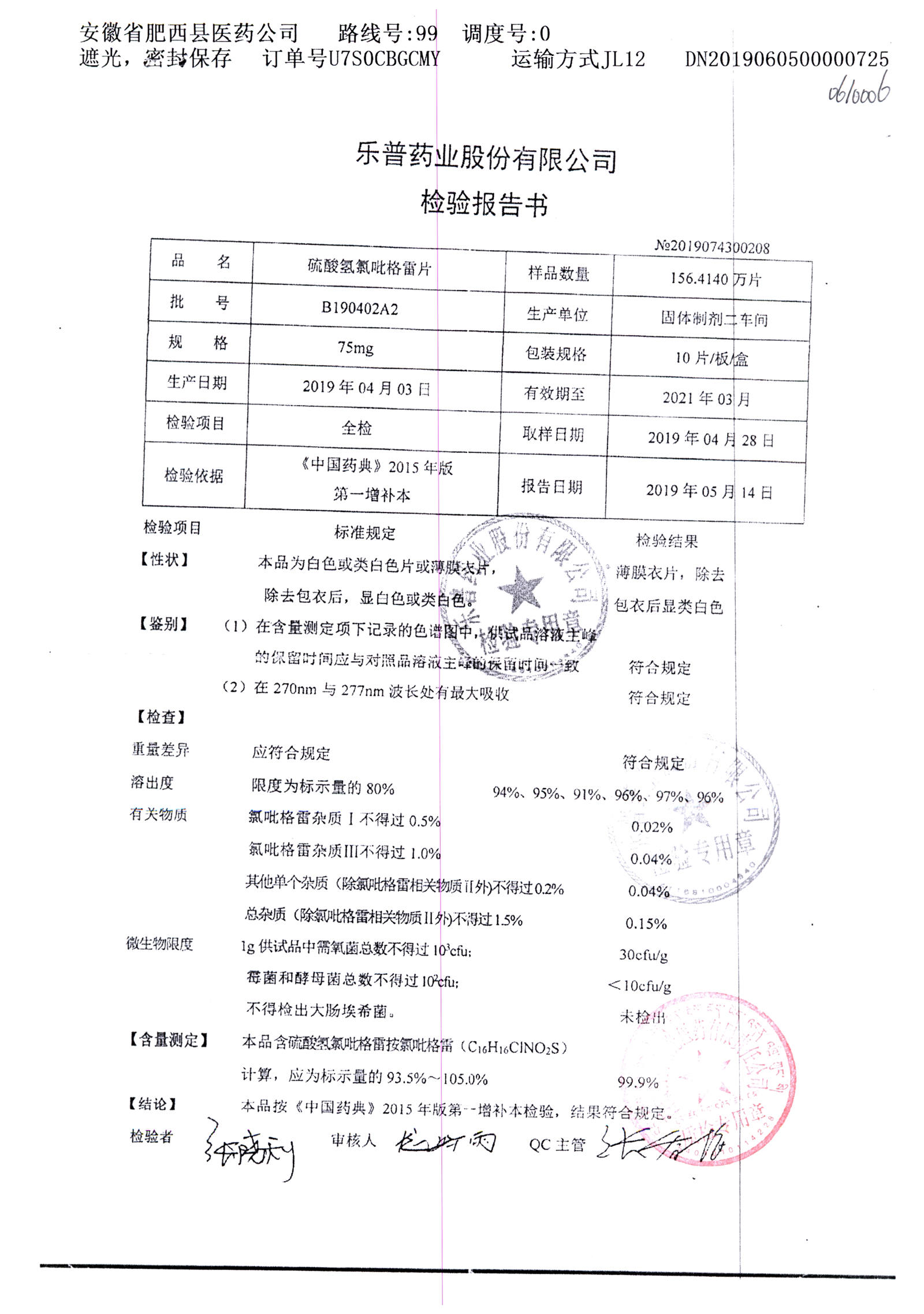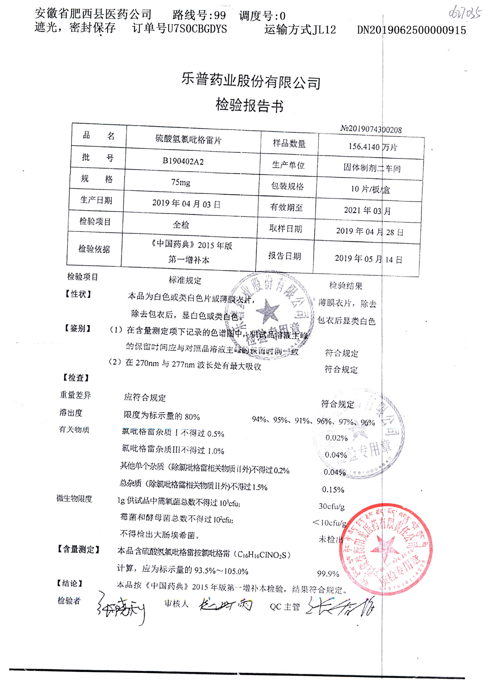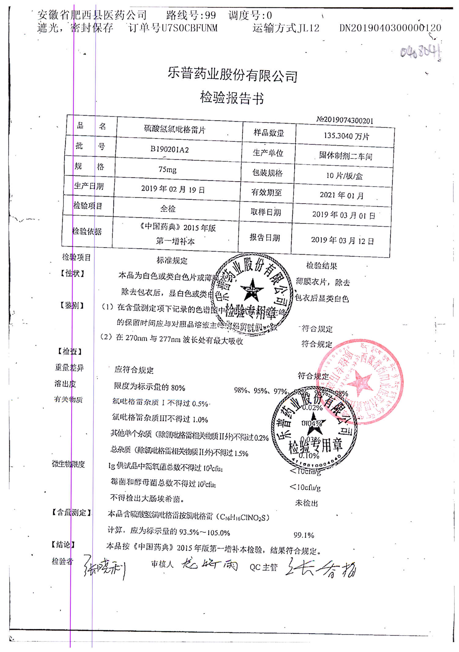 | 硫酸氢氯吡格雷片 | 75mg*10s | B190402A2 | 查看详情 |