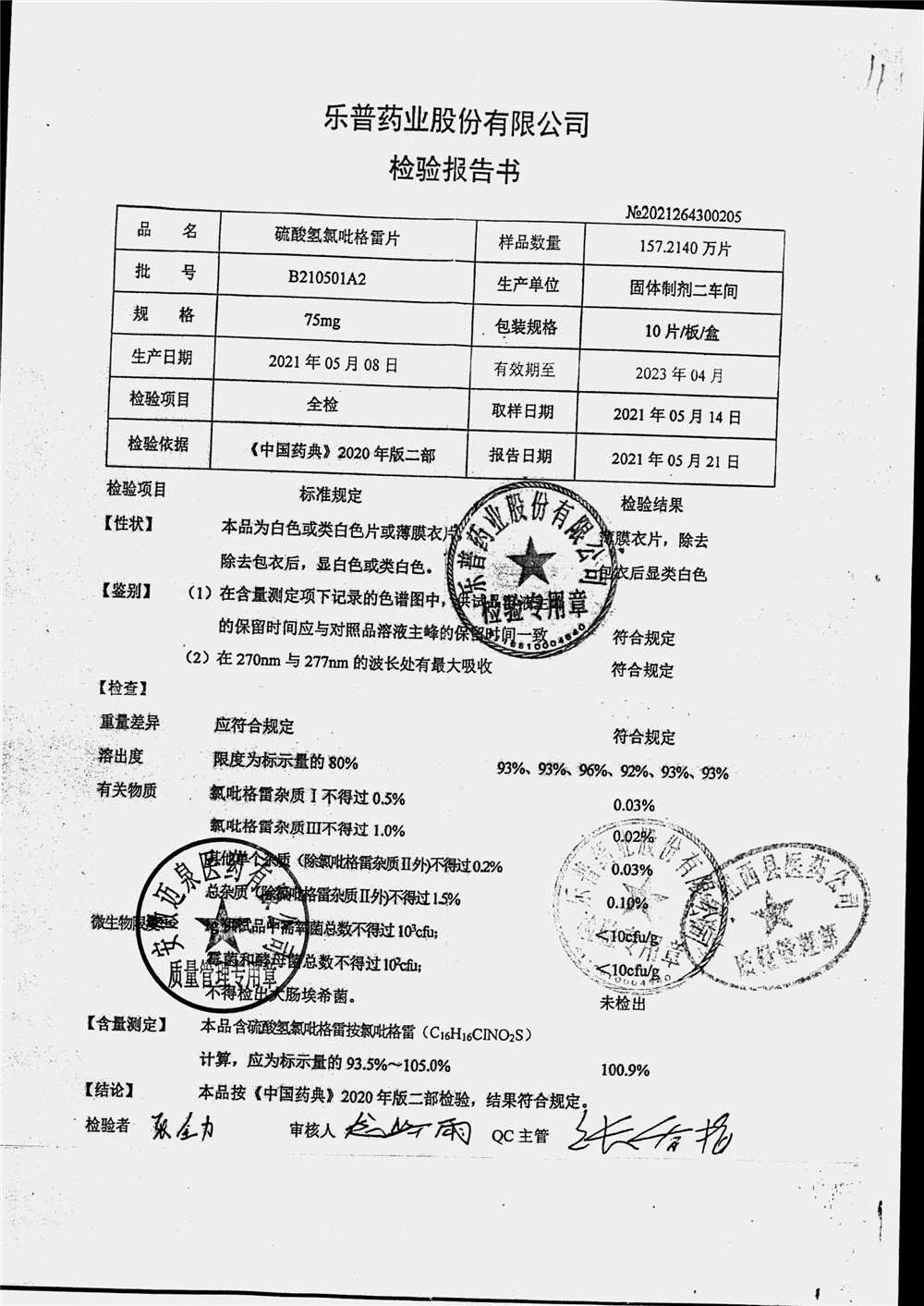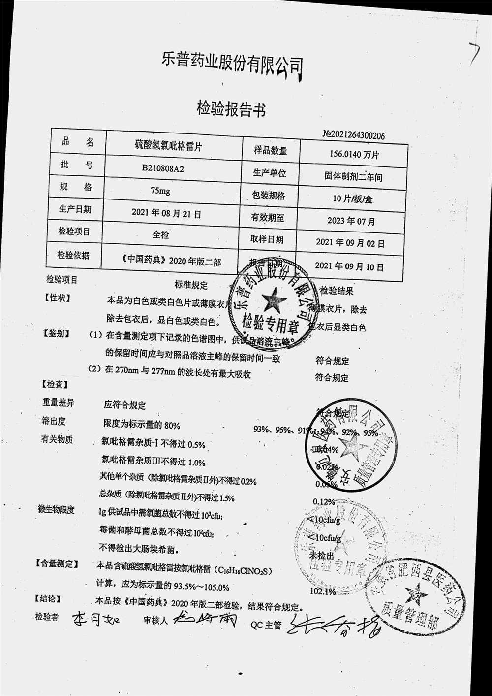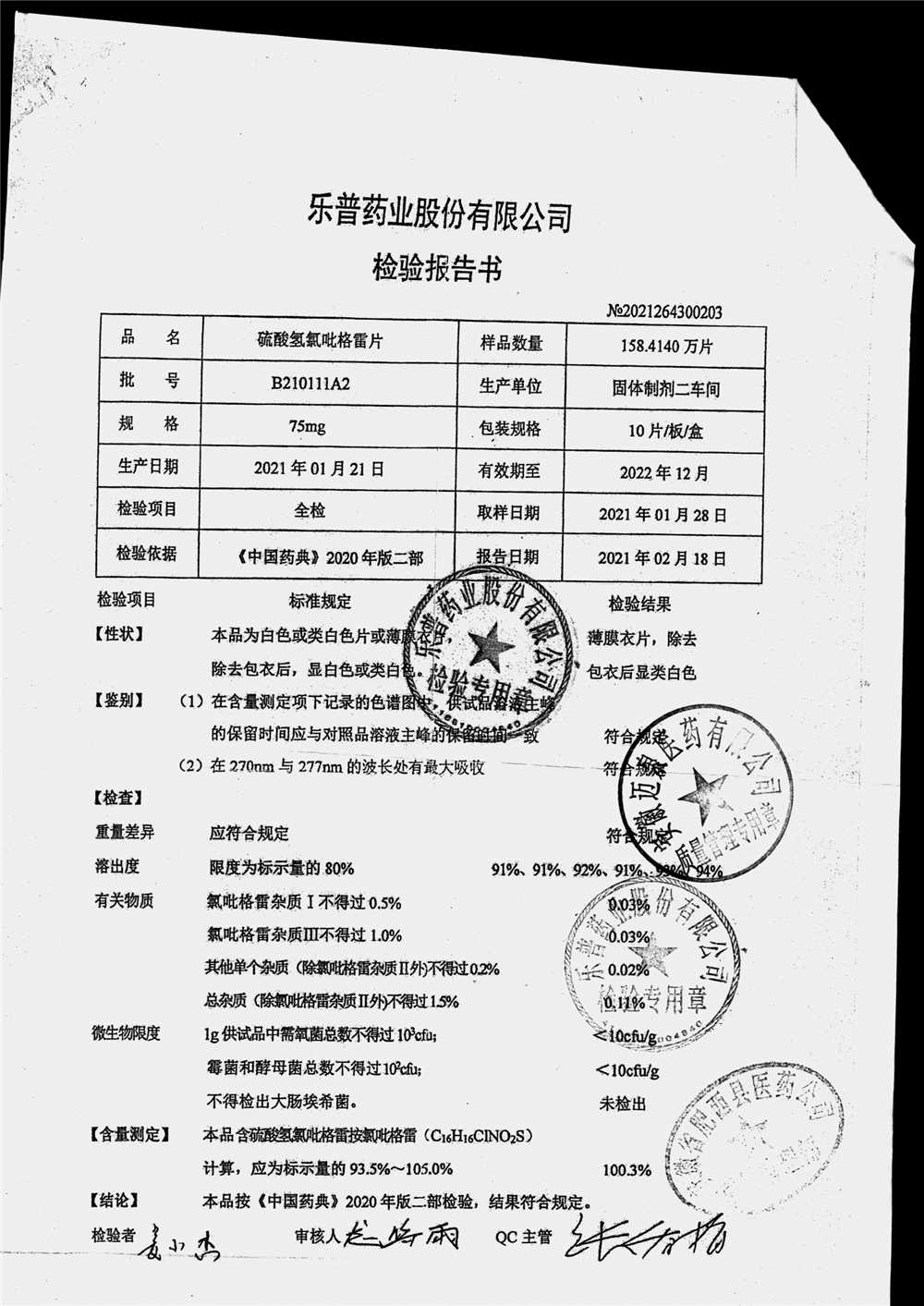 | 硫酸氢氯吡格雷片 | 75mg*10s | B210501A2 | 查看详情 |
