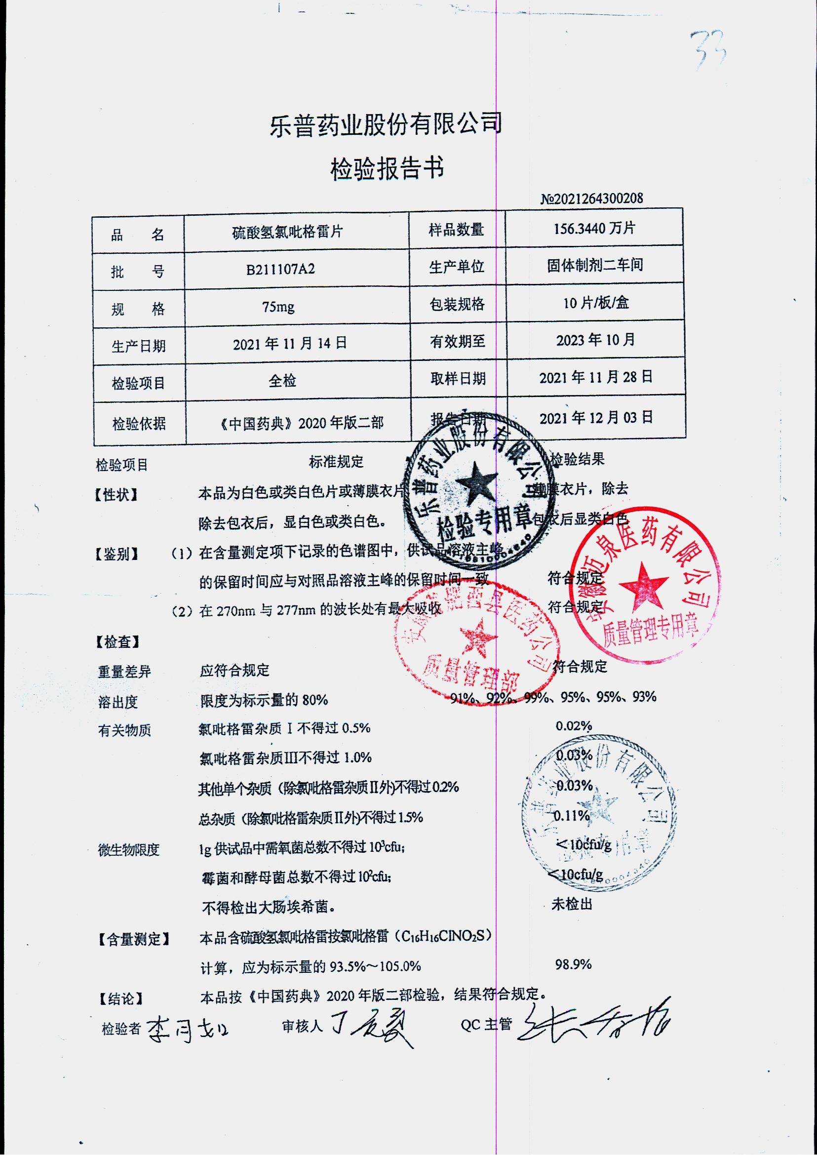 | 硫酸氢氯吡格雷片 | 75mg*10s | B211107A2 | 查看详情 |