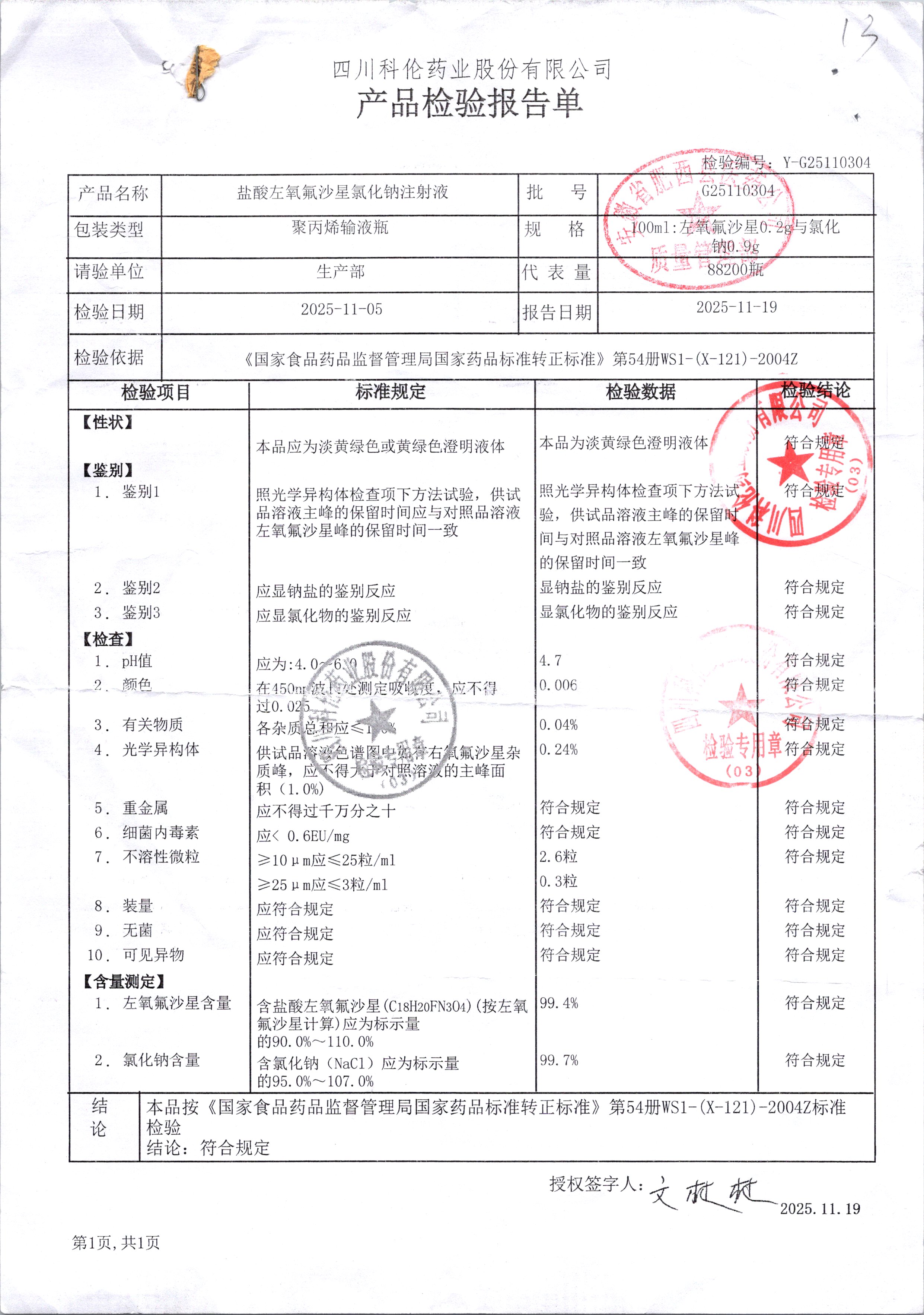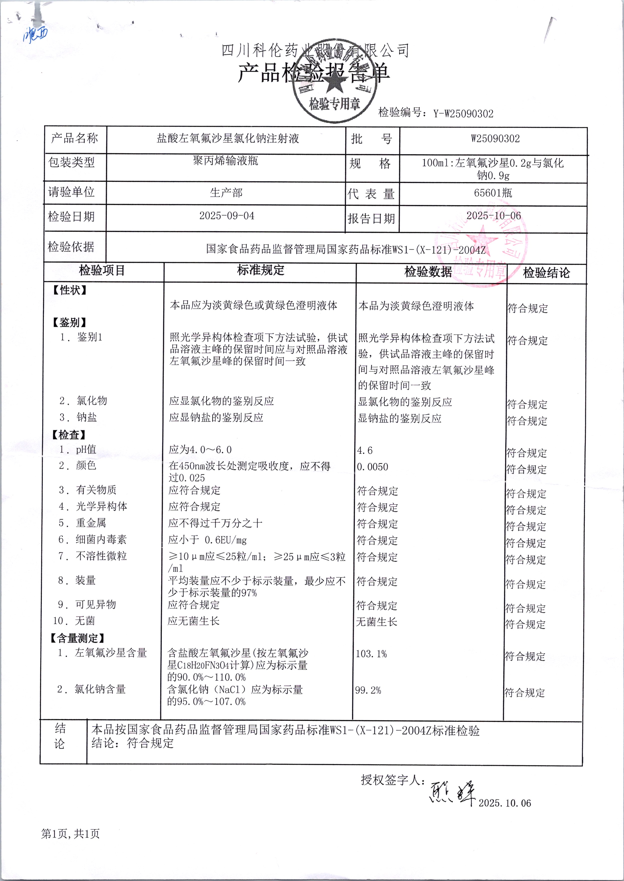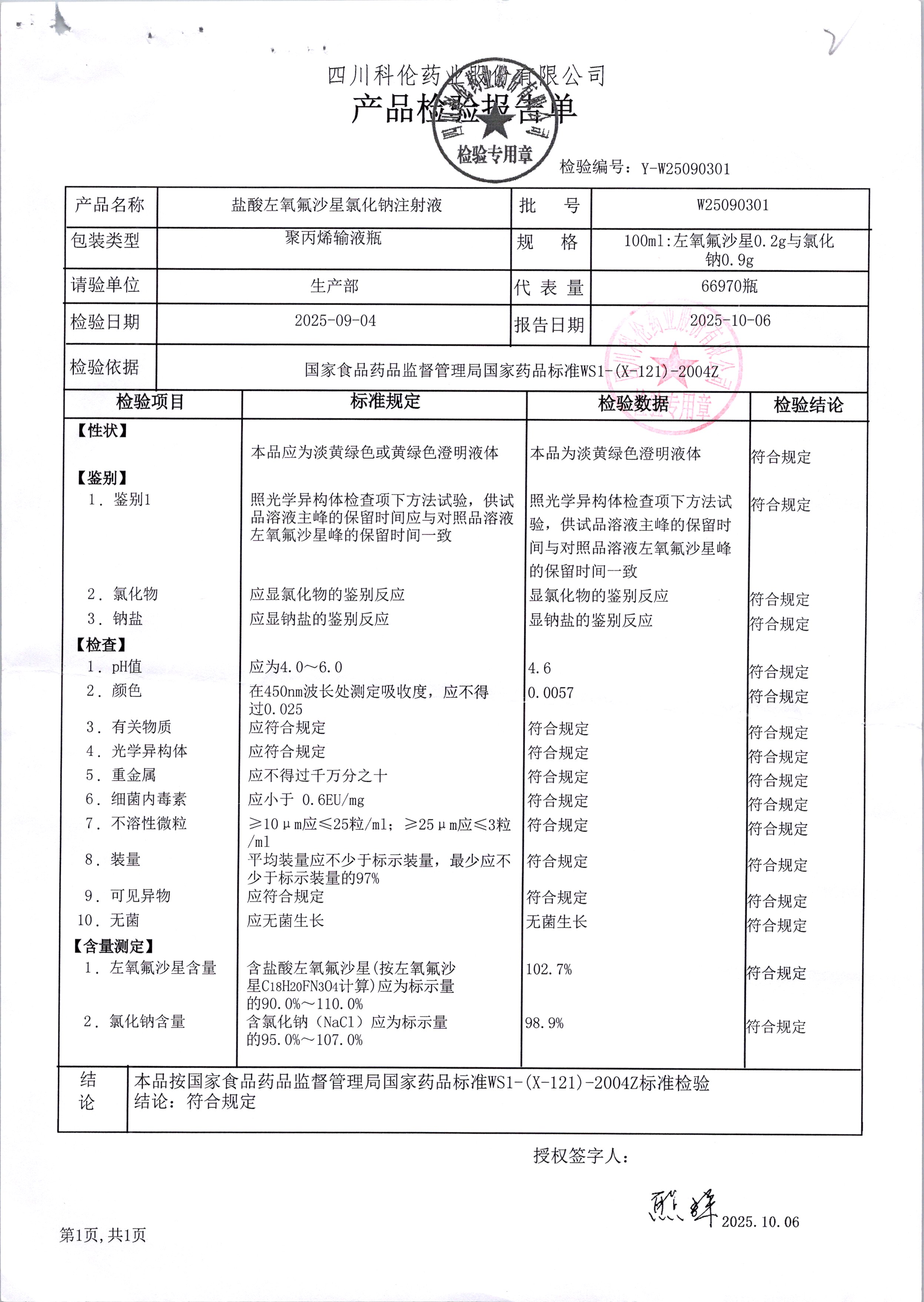 | 盐酸左氧氟沙星氯化钠注射液 | 100ml | G25040909 | 查看详情 |