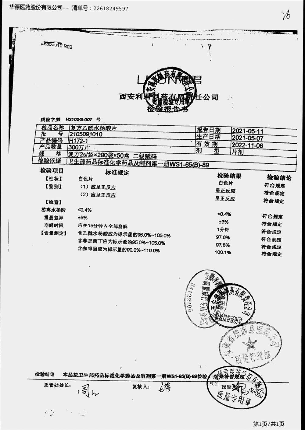 | 复方乙酰水杨酸片 | 2片 | 1804172100 | 查看详情 |