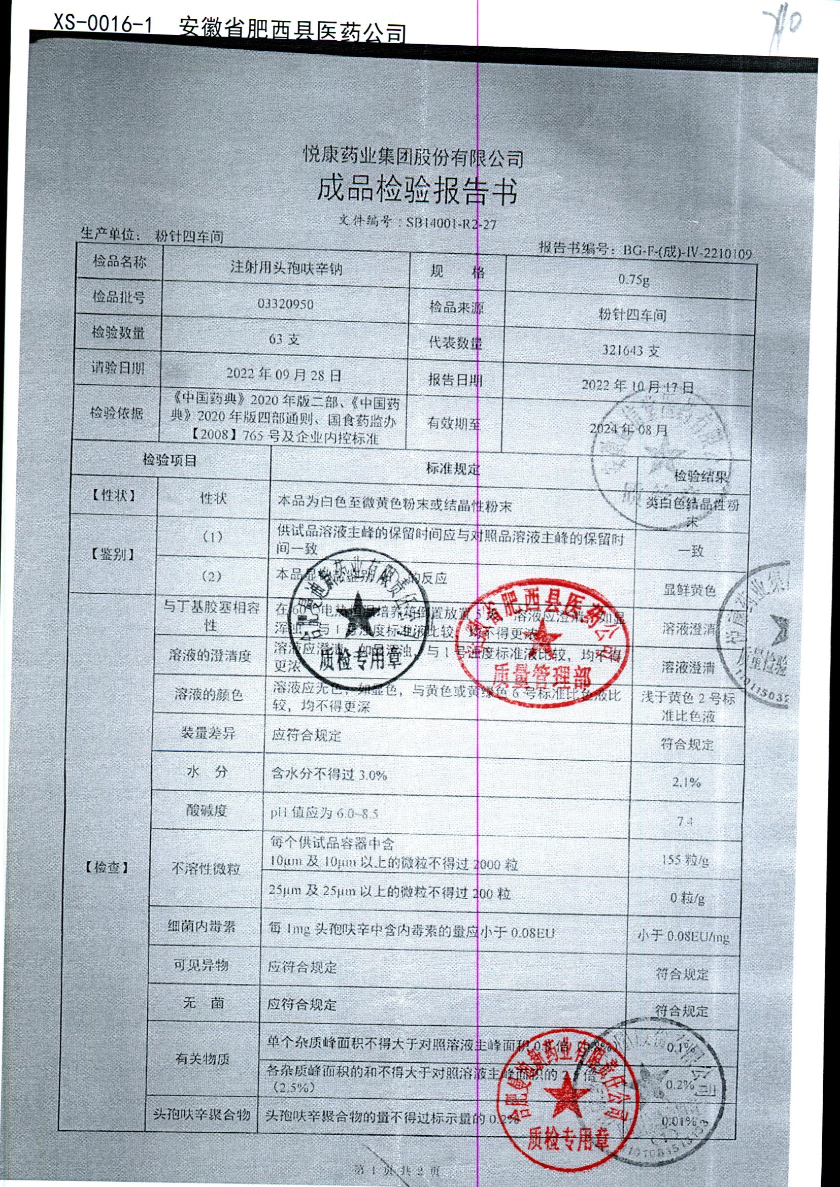 | 注射用头孢呋辛钠 | 0.75g | 03320950/1 | 查看详情 |