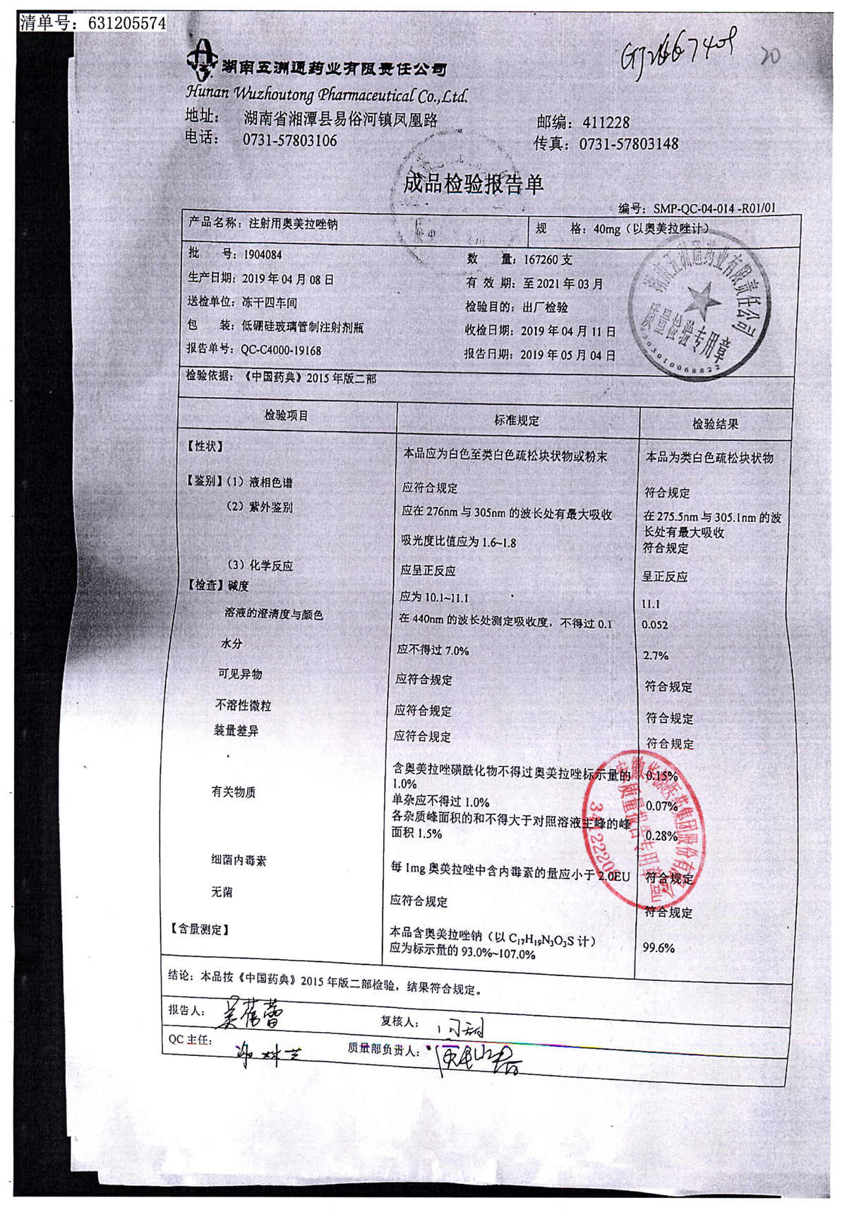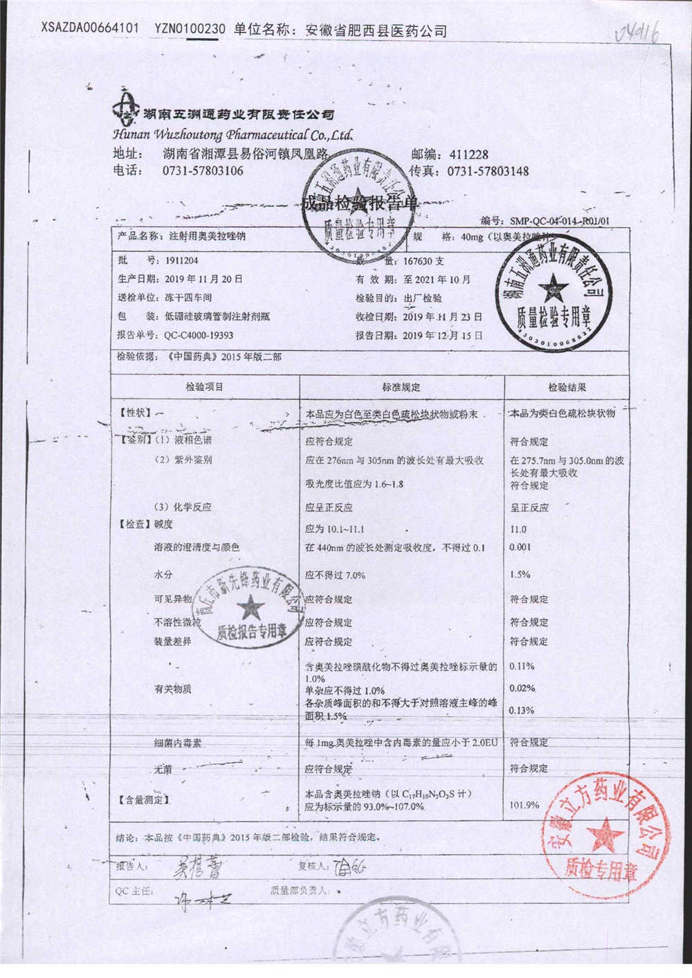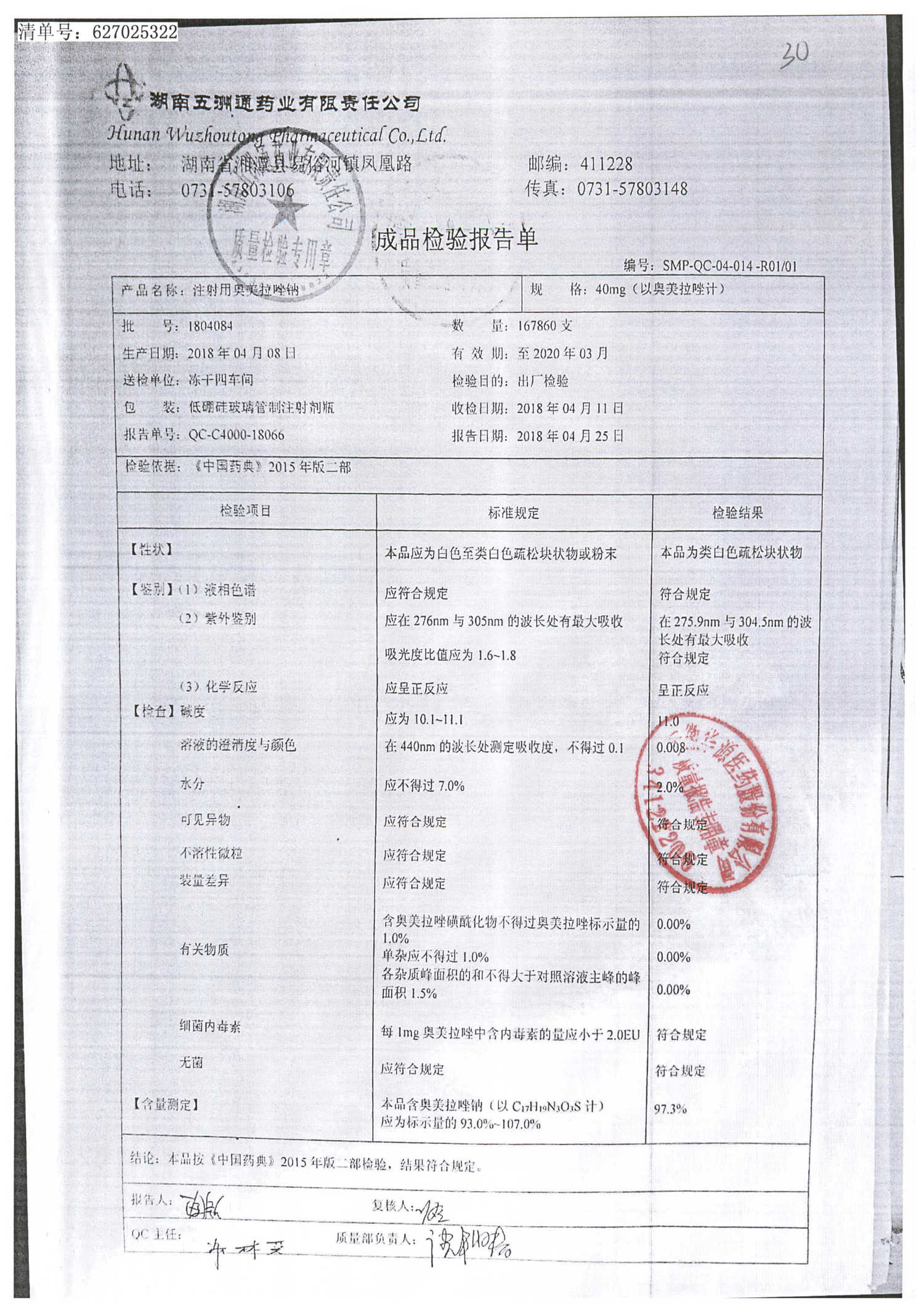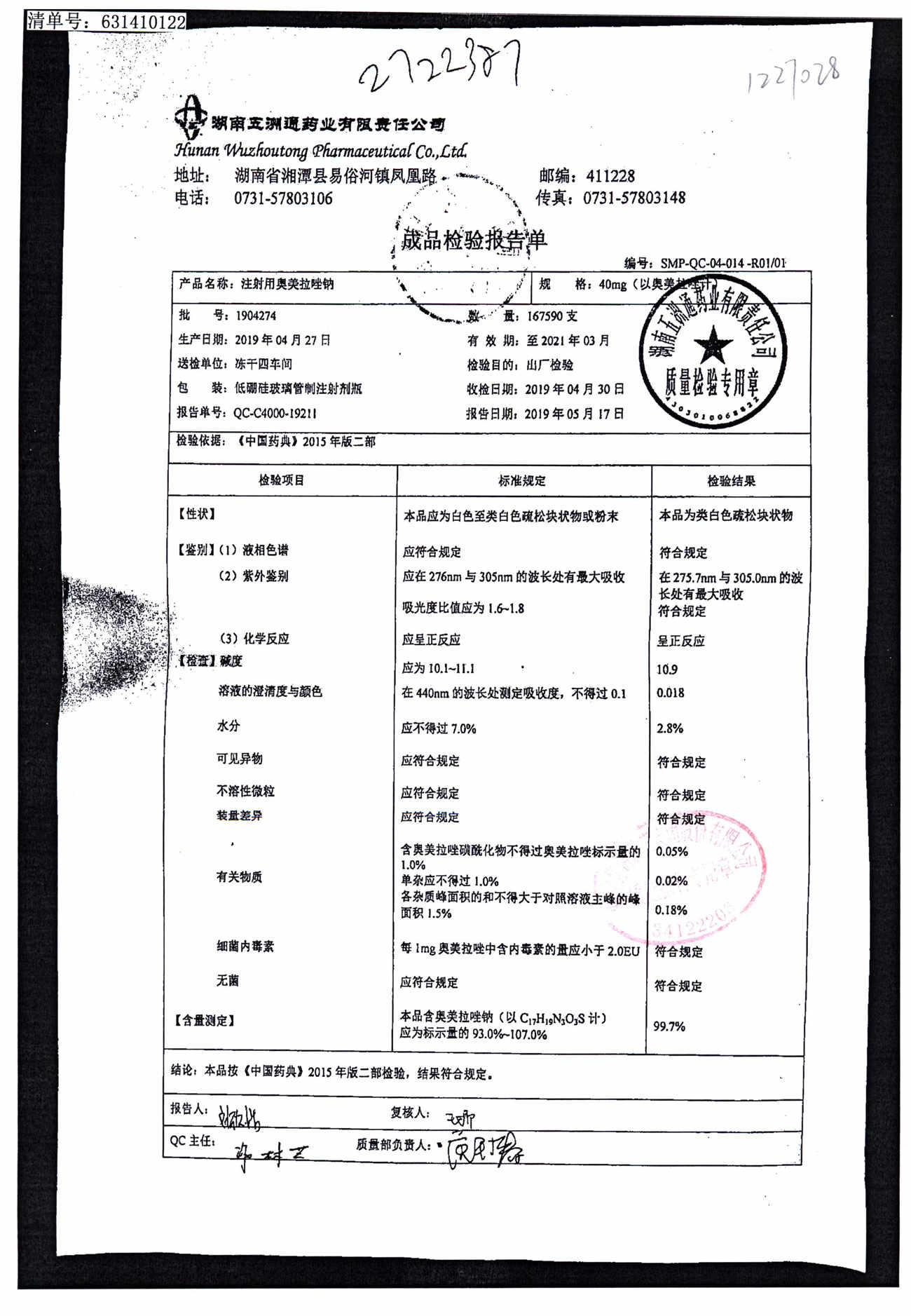 | 注射用奥美拉唑钠 | 40mg | 1904084 | 查看详情 |