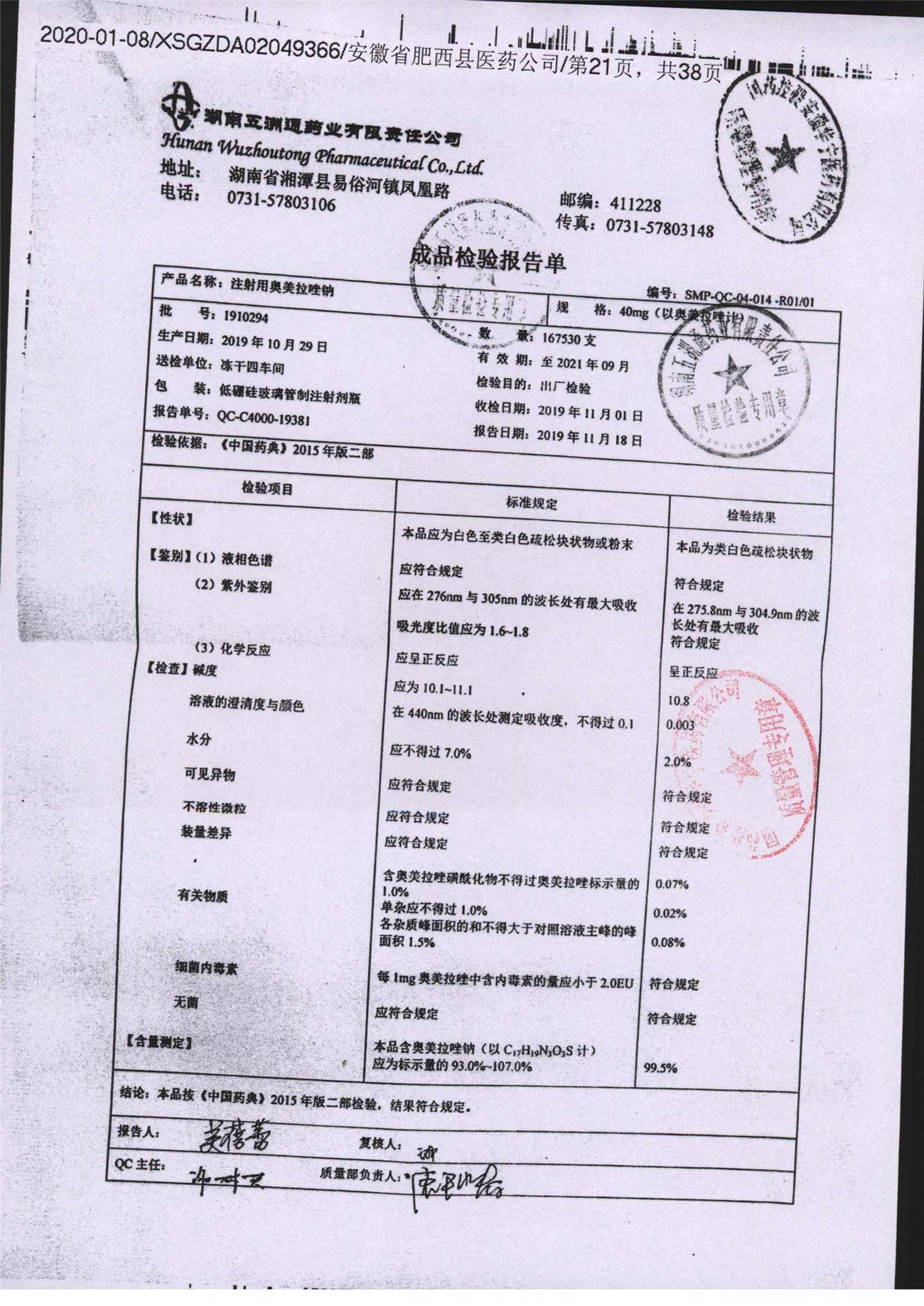 | 注射用奥美拉唑钠 | 40mg | 21091511 | 查看详情 |