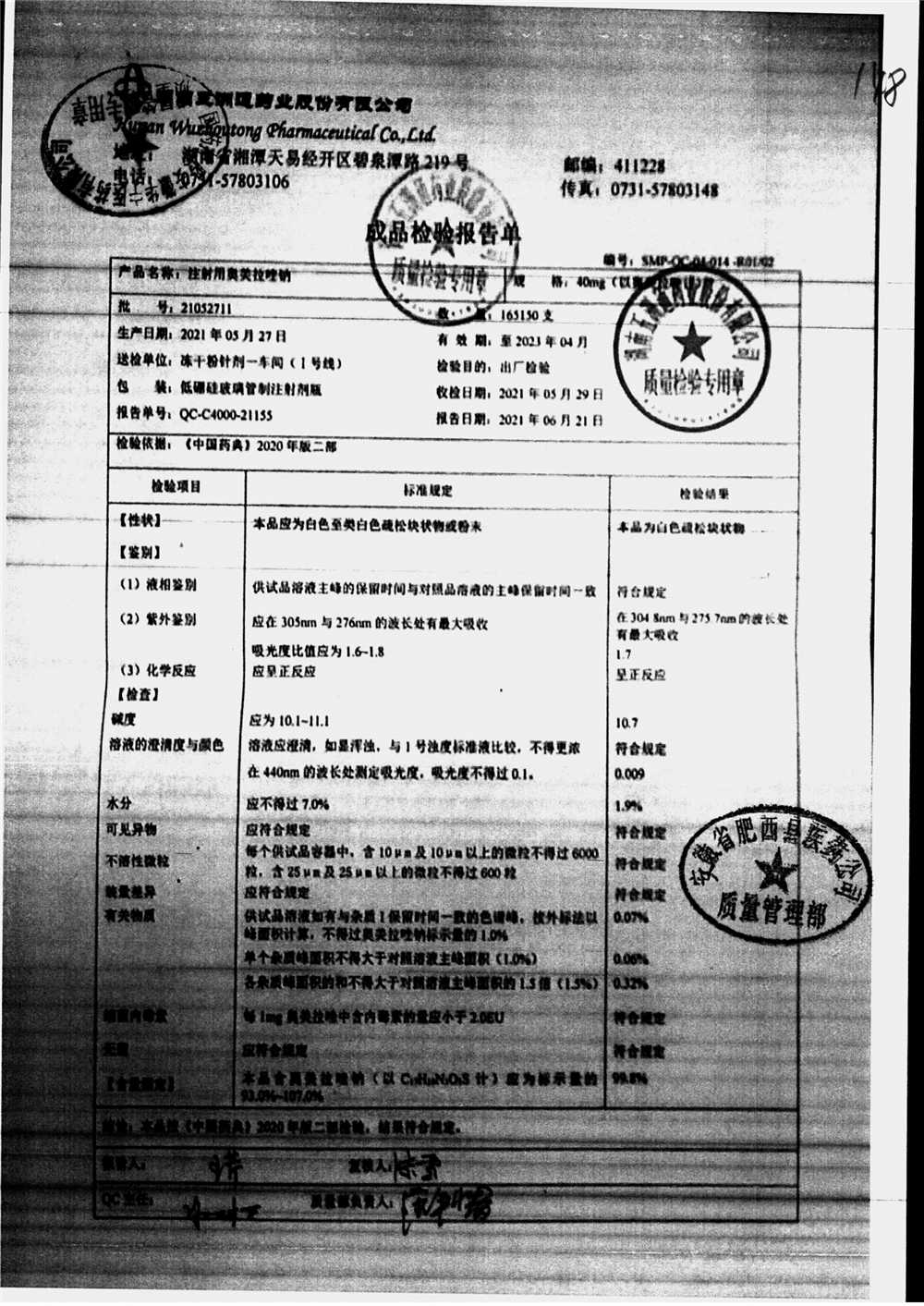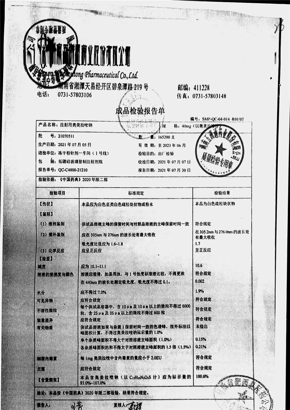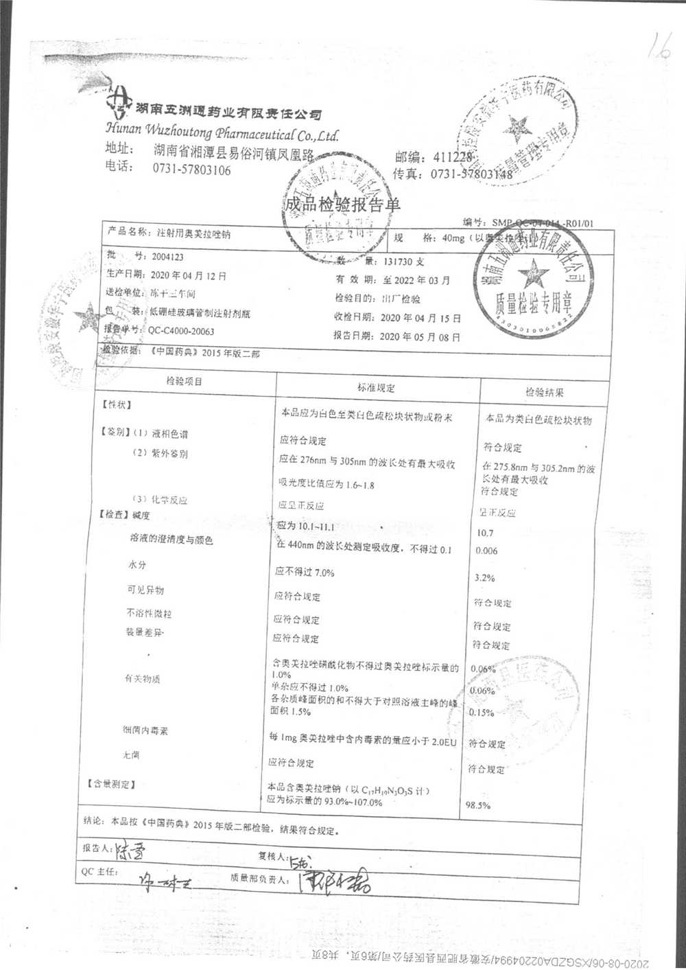 | 注射用奥美拉唑钠 | 40mg | 21070511 | 查看详情 |