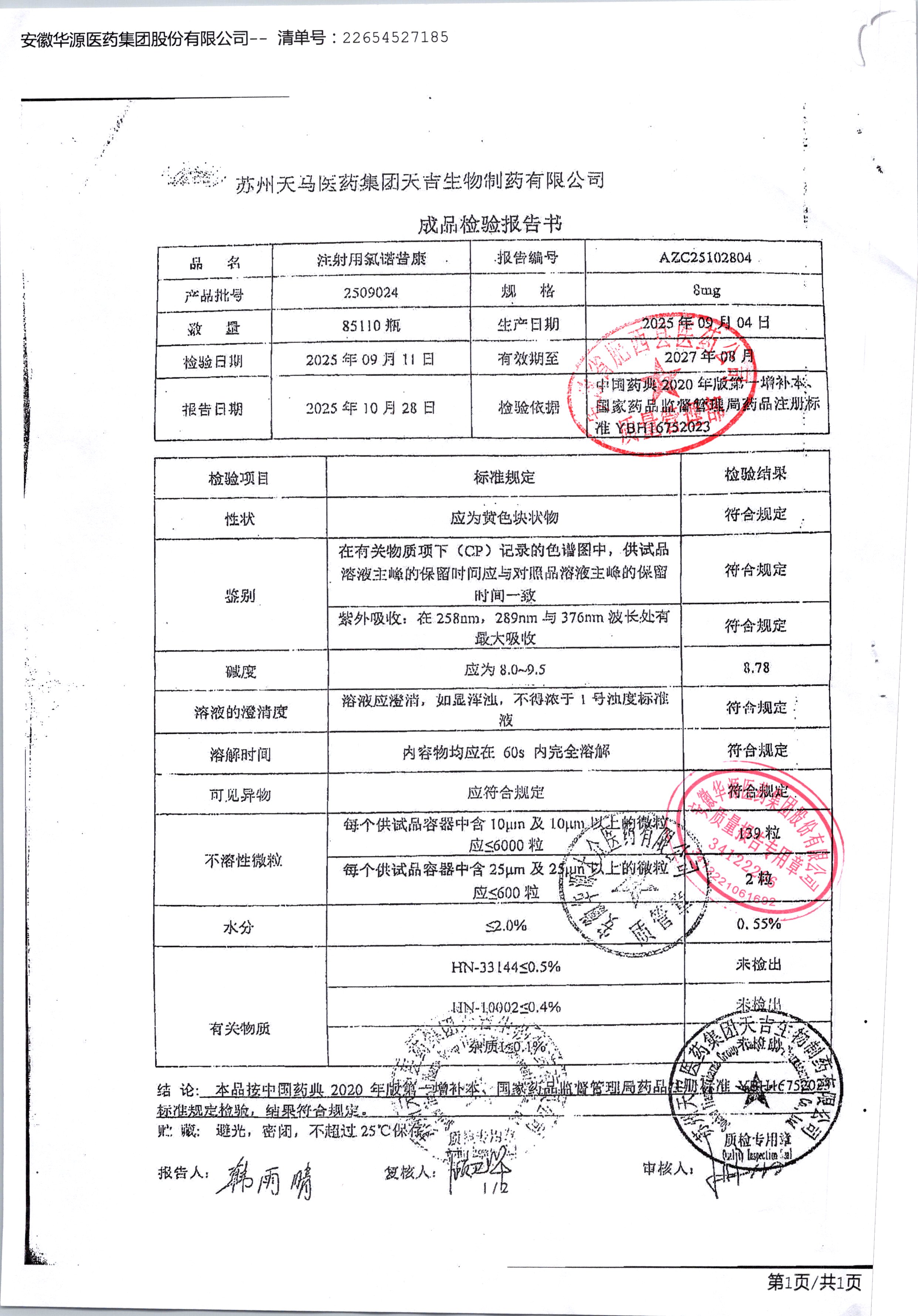 | 名称 | 规格 | 批号 | 药检报告 |