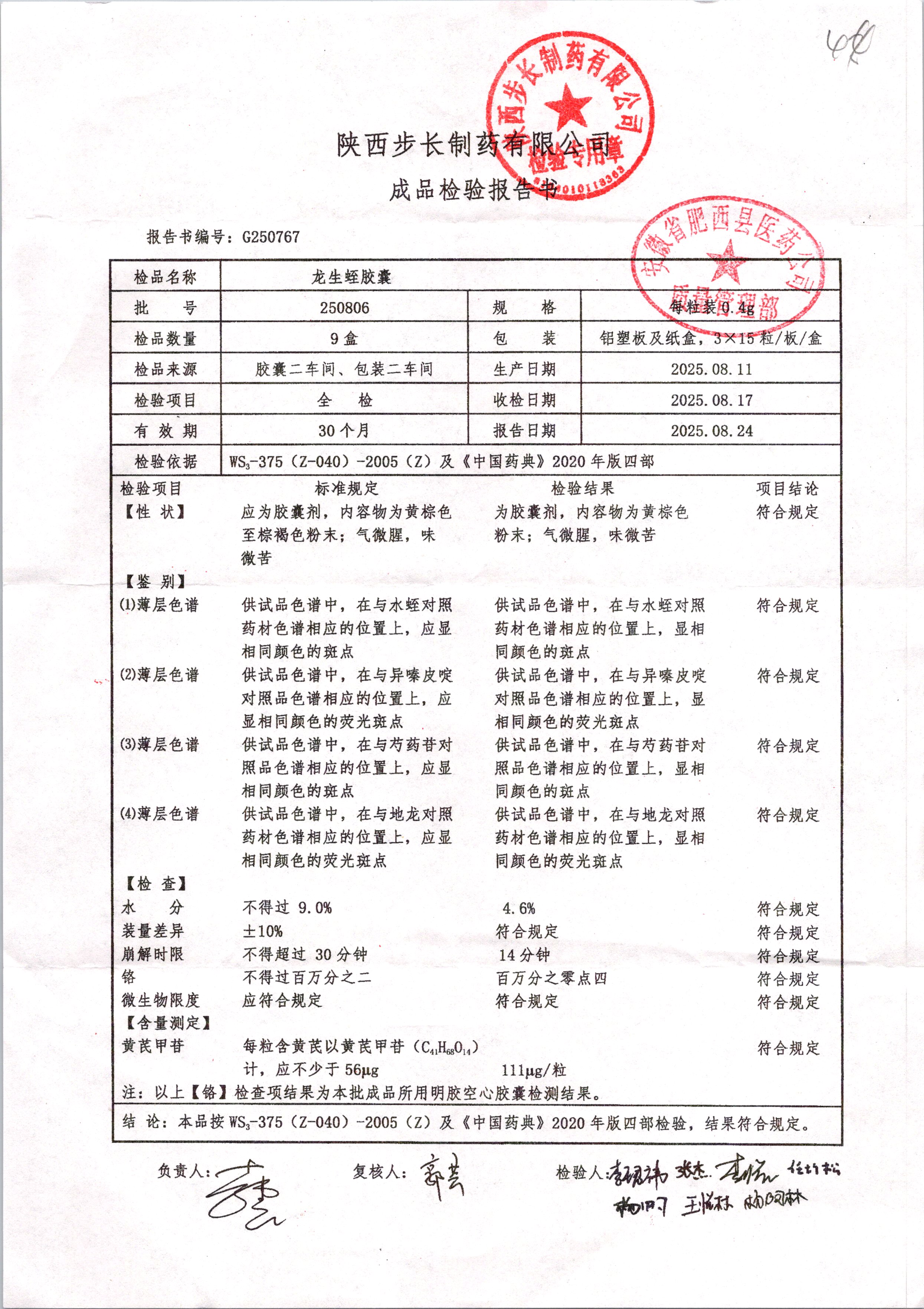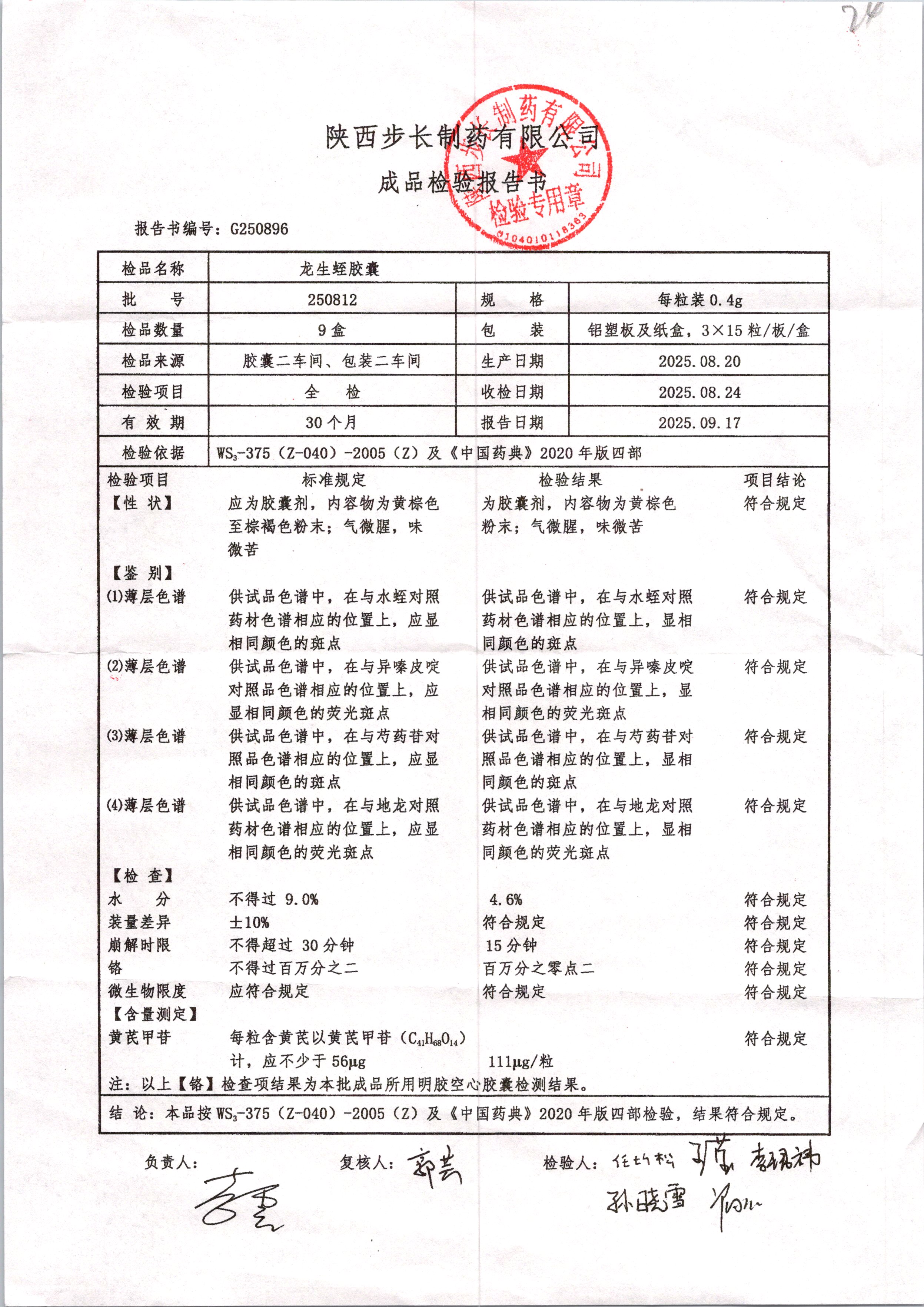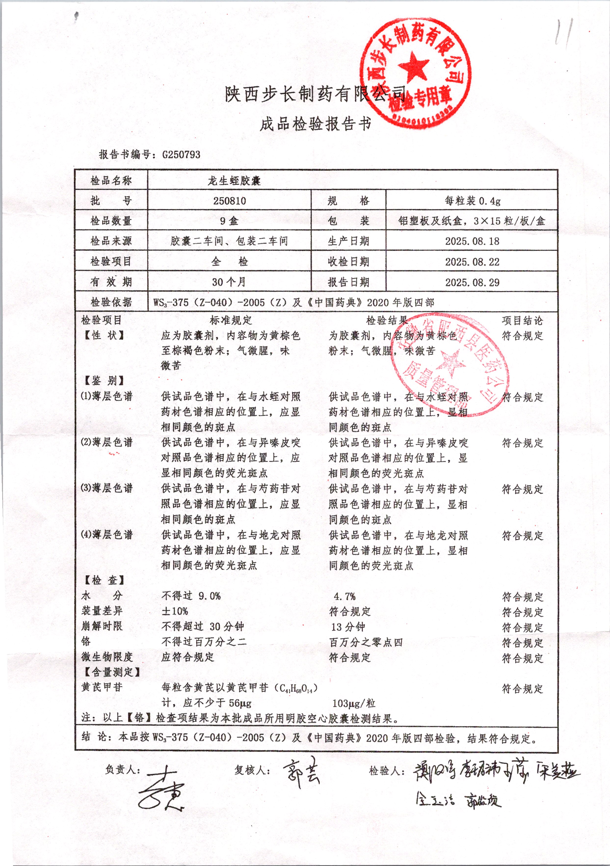 | 龙生蛭胶囊 | 0.4g*45粒 | 250705 | 查看详情 |