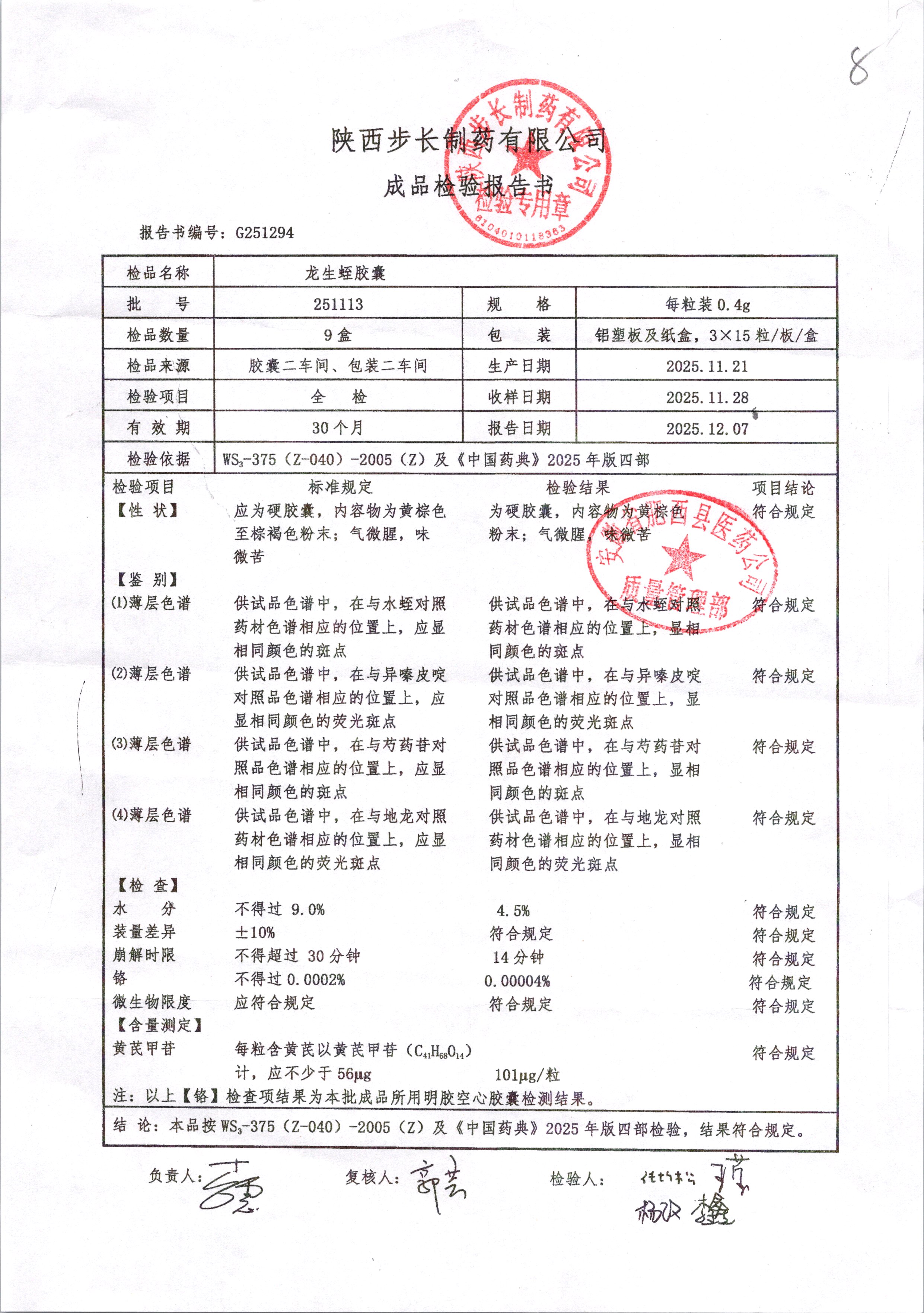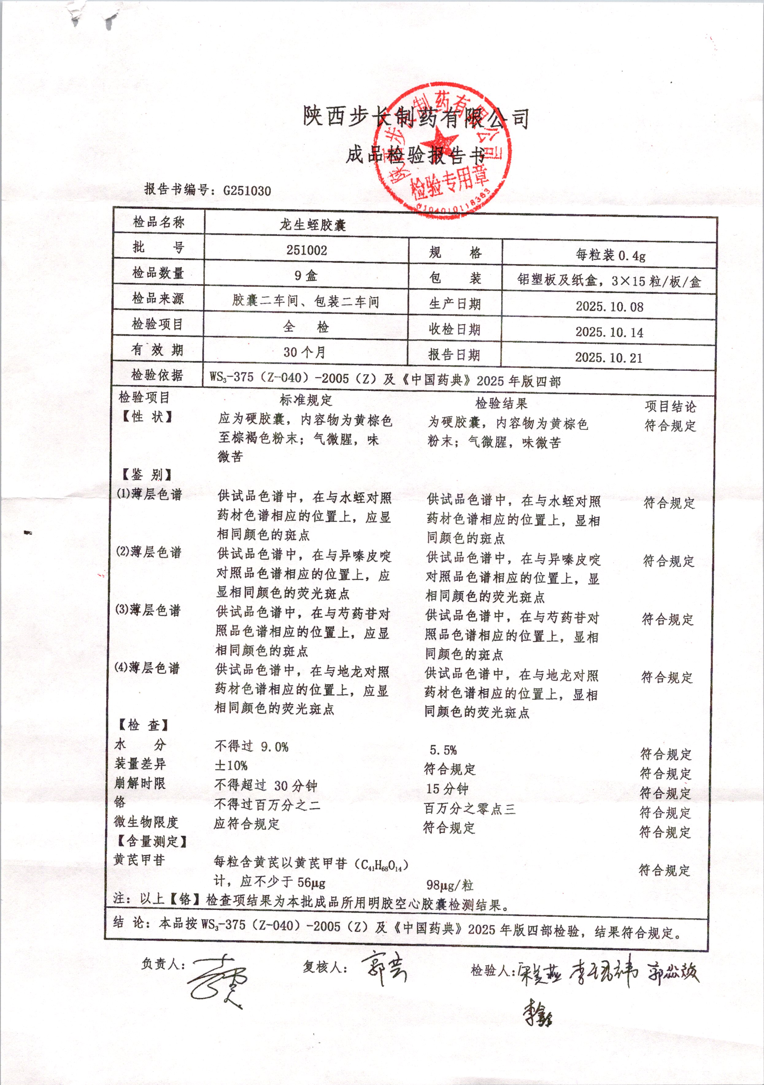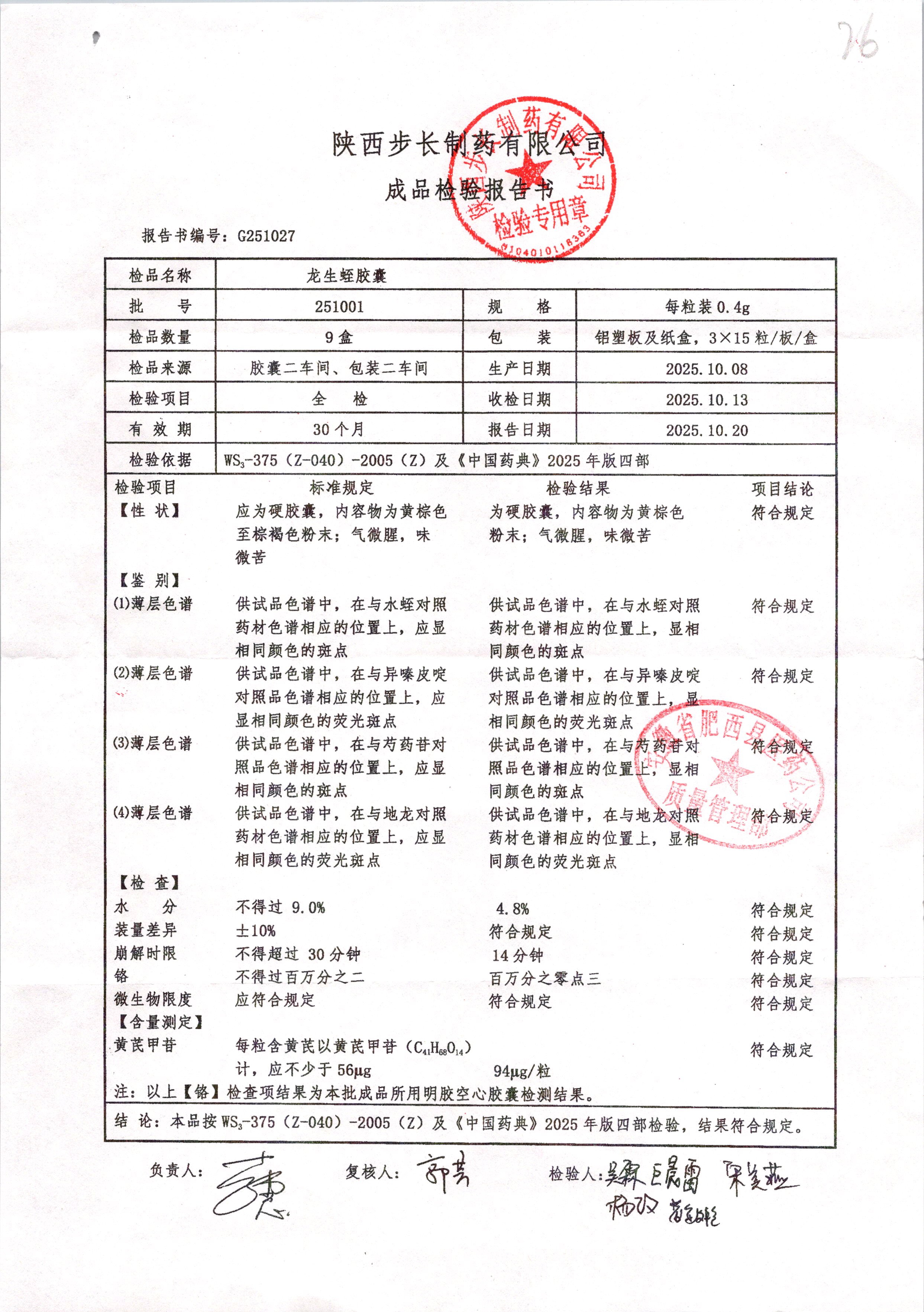 | 龙生蛭胶囊 | 0.4g*45粒 | 250705 | 查看详情 |