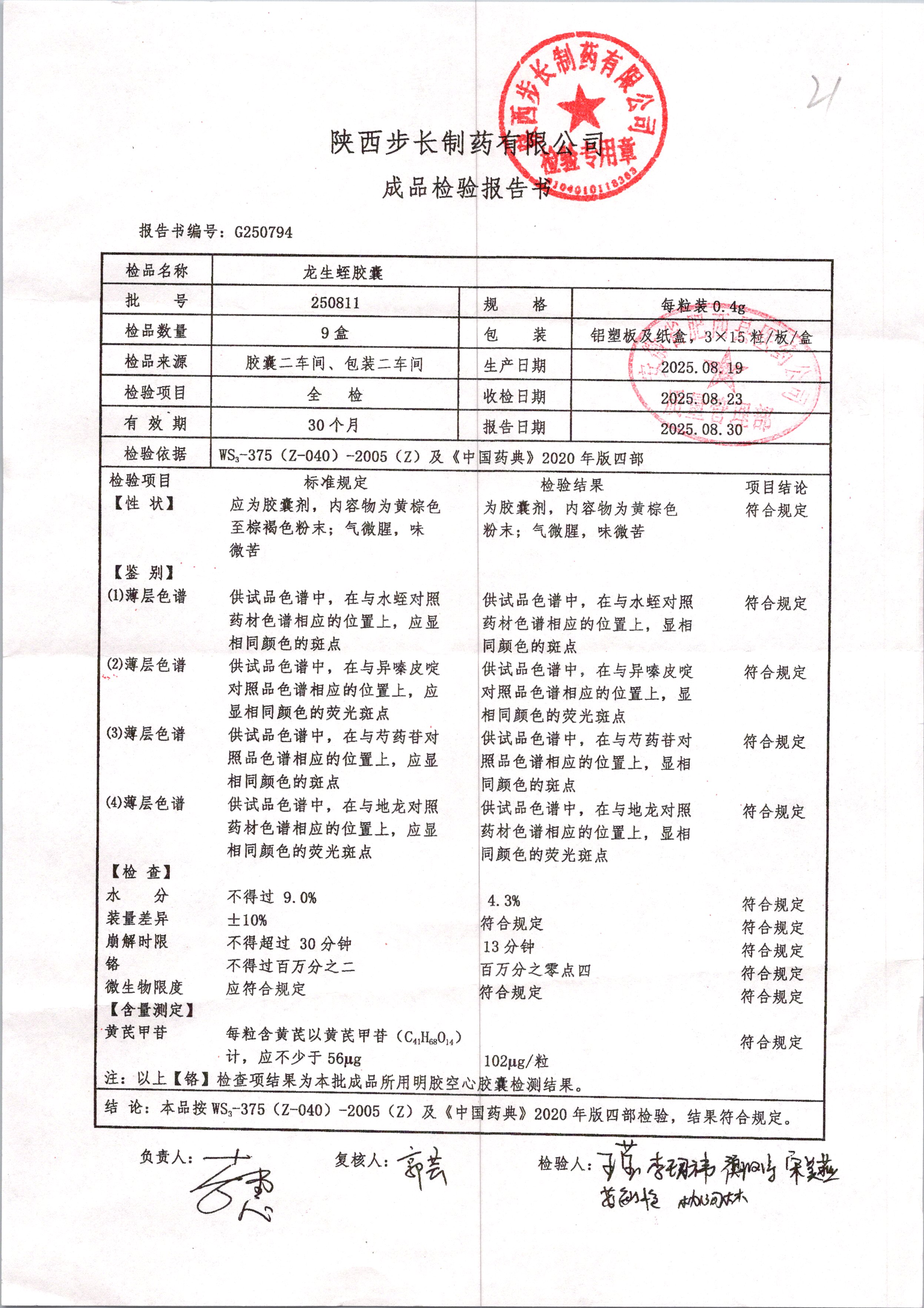 | 龙生蛭胶囊 | 0.4g*45粒 | 250811 | 查看详情 |