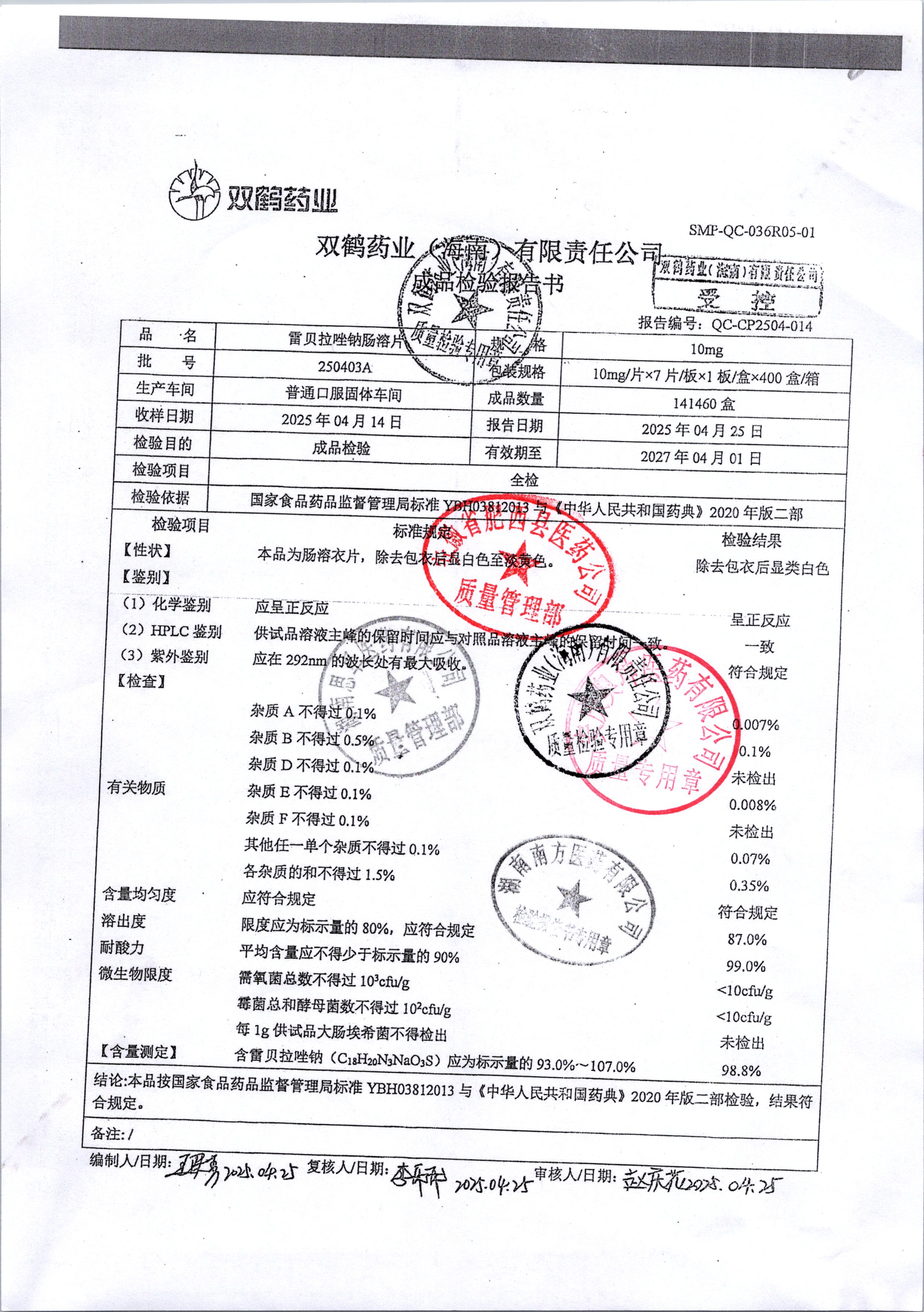 | 雷贝拉唑钠肠溶片 | 10mg*7片 | 250403A | 查看详情 |