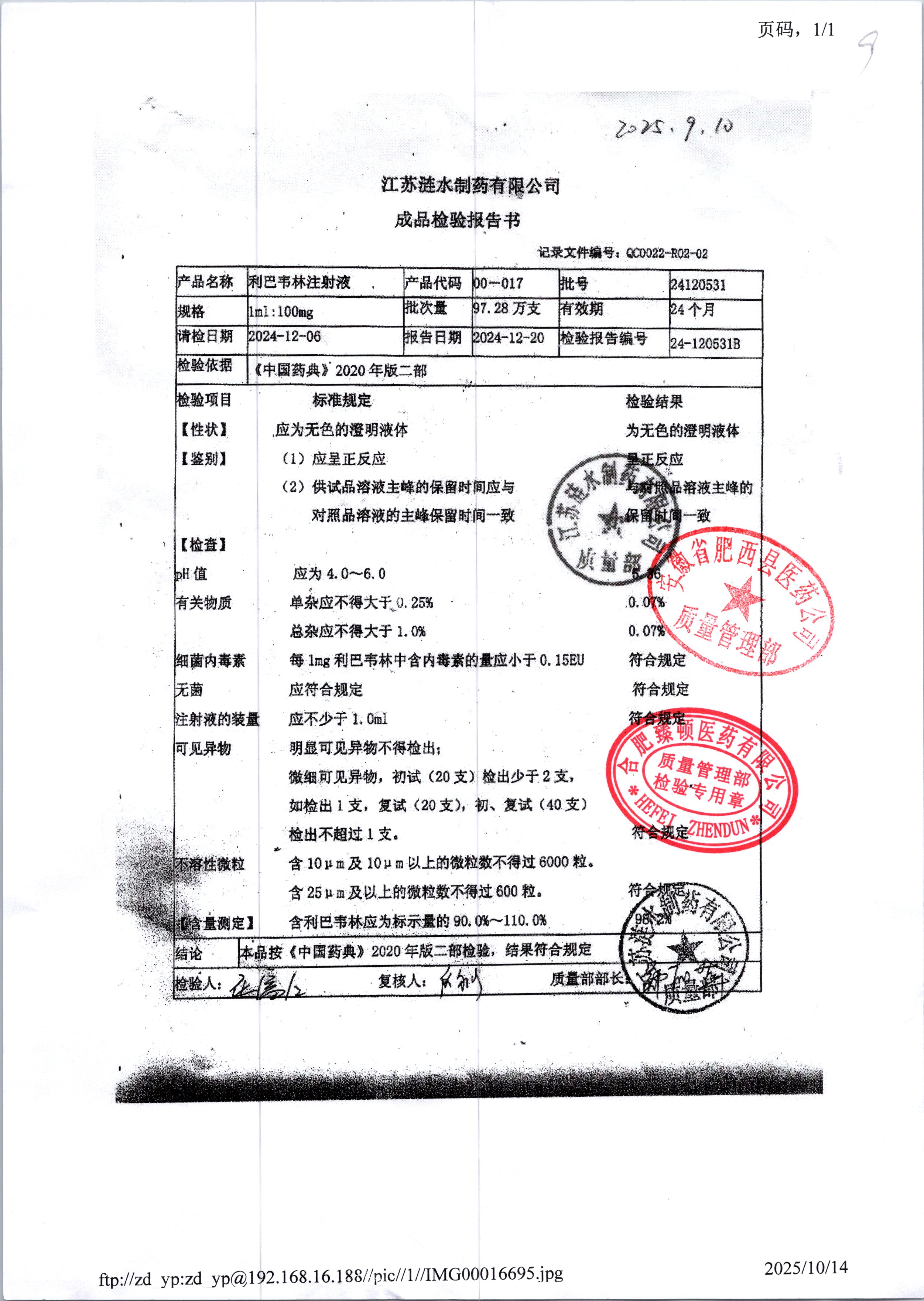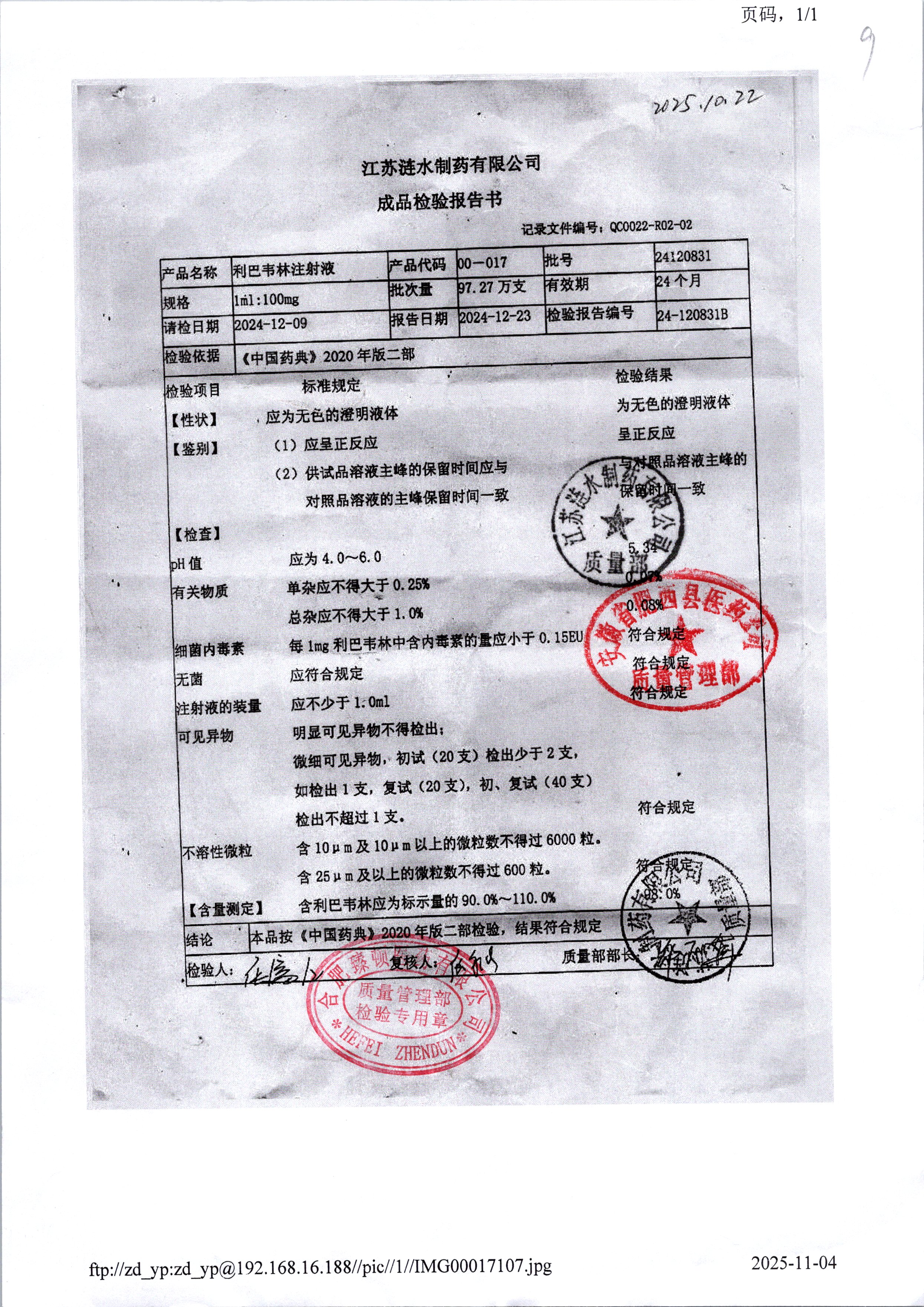 | 利巴韦林注射液 | 1ml:100mg | 24120531 | 查看详情 |