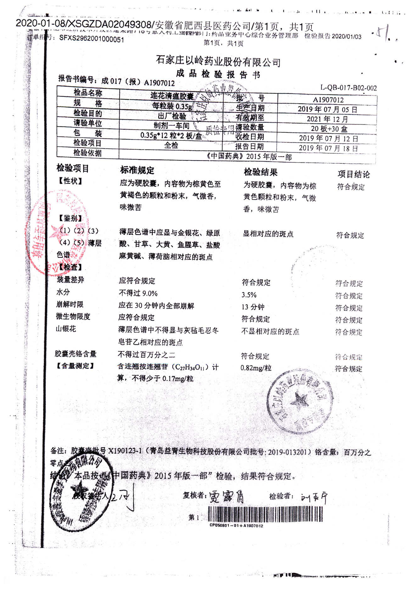 | 连花清瘟胶囊 | 0.35g*24s | A1907012 | 查看详情 |