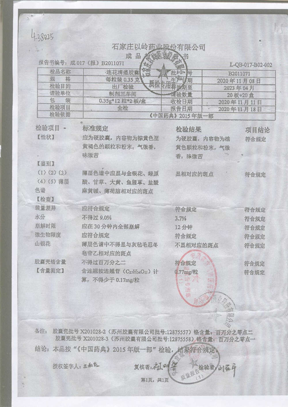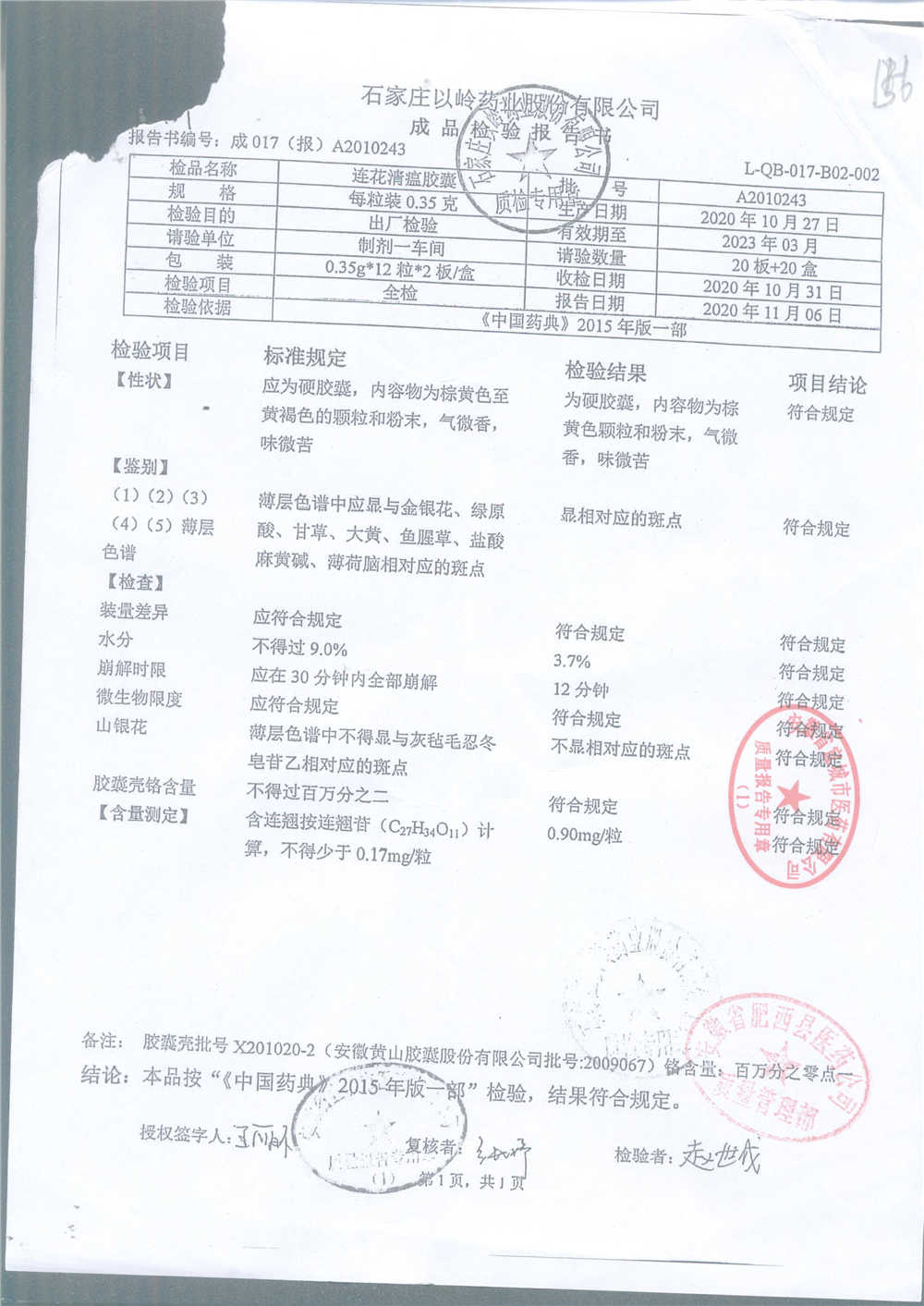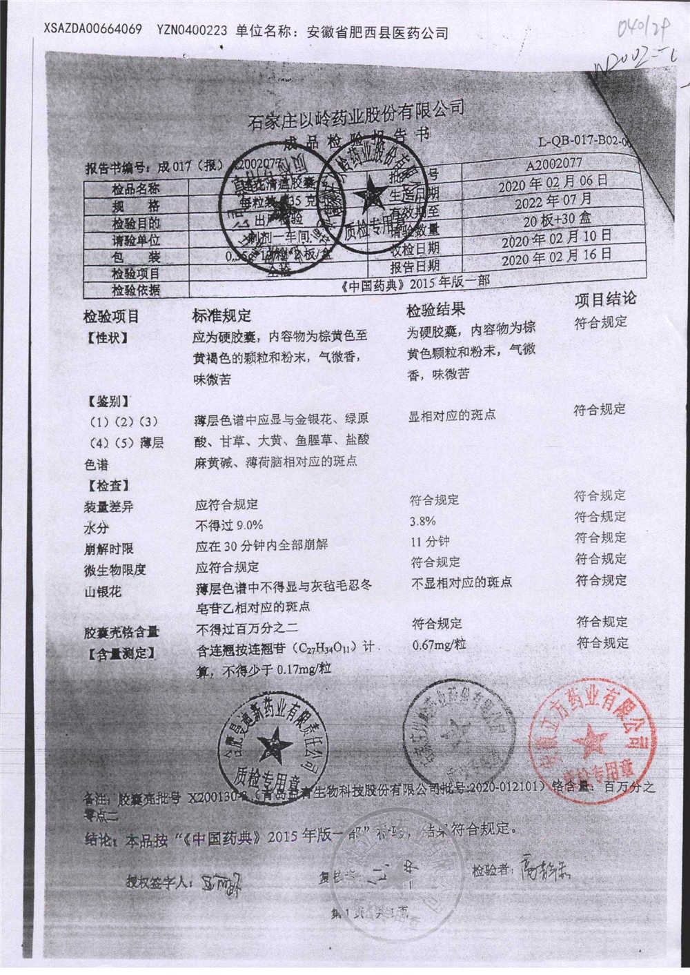 | 连花清瘟胶囊 | 0.35g*24s | B2011062 | 查看详情 |