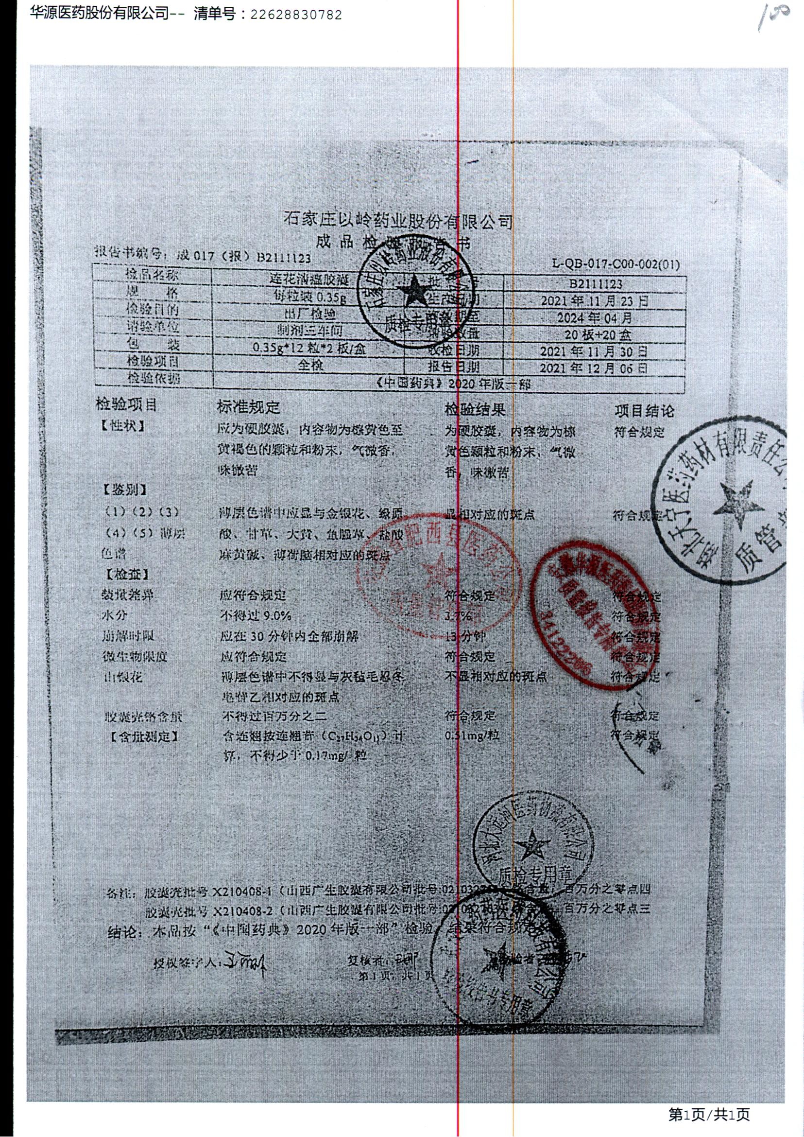 | 连花清瘟胶囊 | 0.35g*24s | B2111123 | 查看详情 |